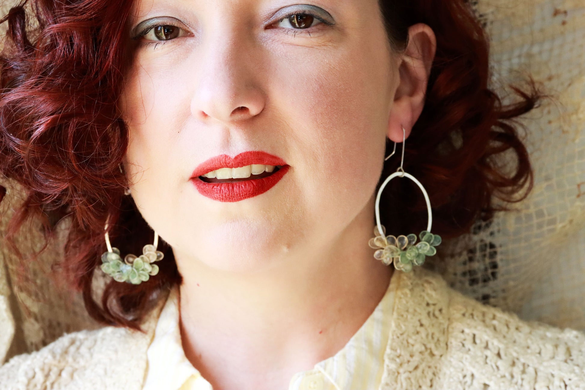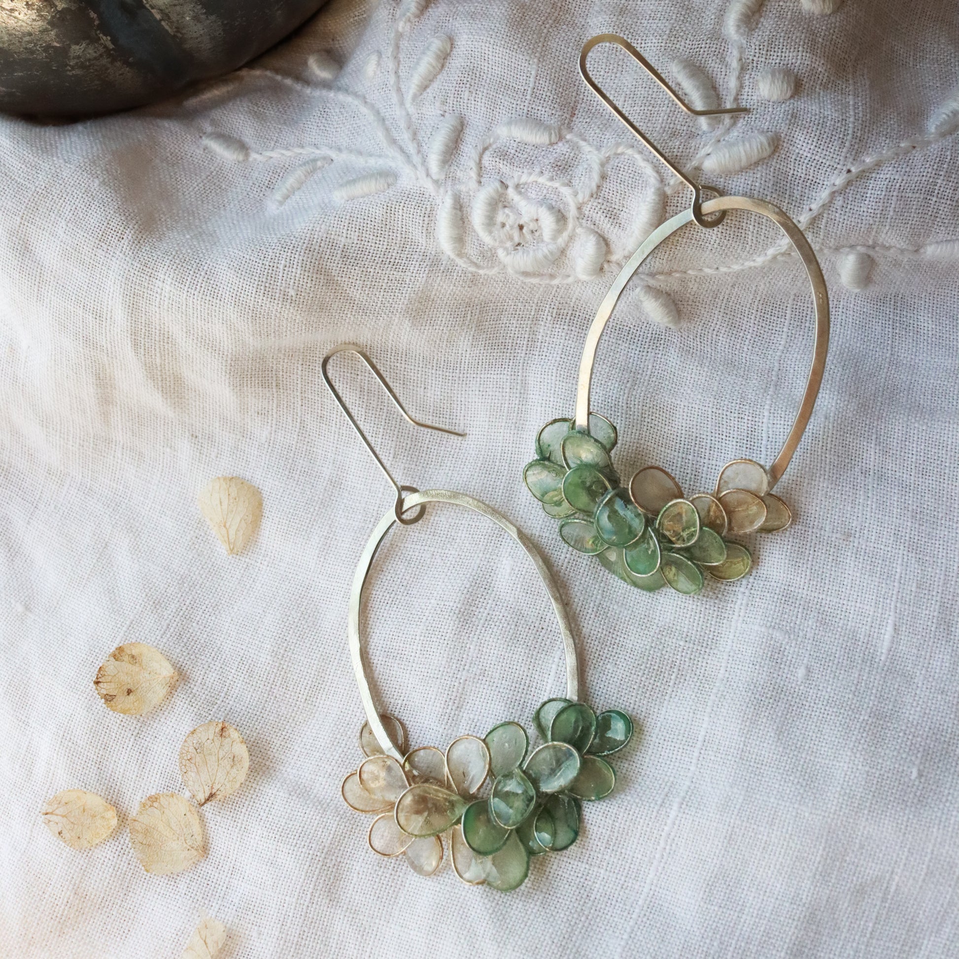 Hand-hammered sterling silver oval hoops, wrapped with petals made from silver loops filled with handmade paper, hand dyed with an ombre effect from ivory to sea glass, and coated with resin to make the paper waterproof and durable.