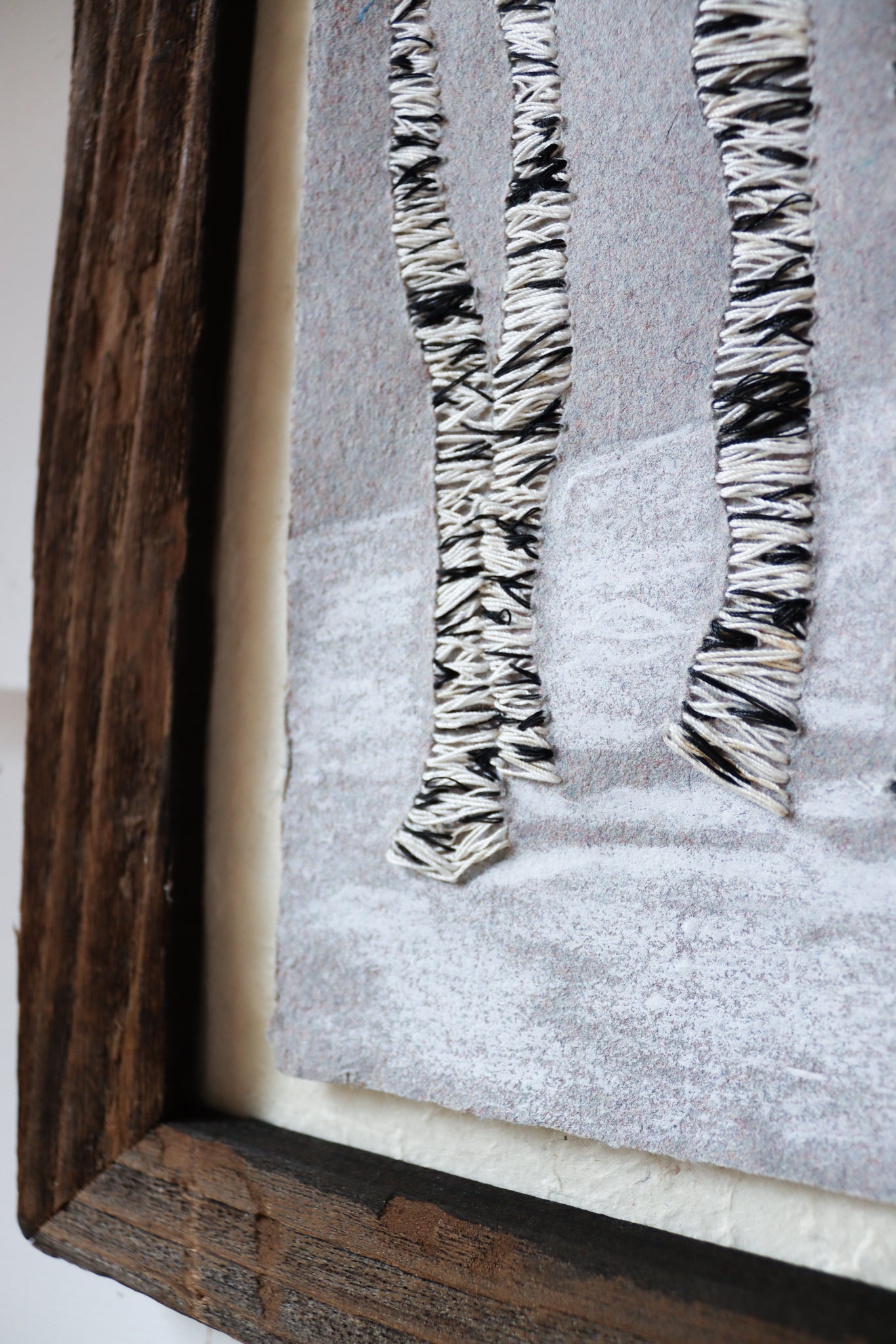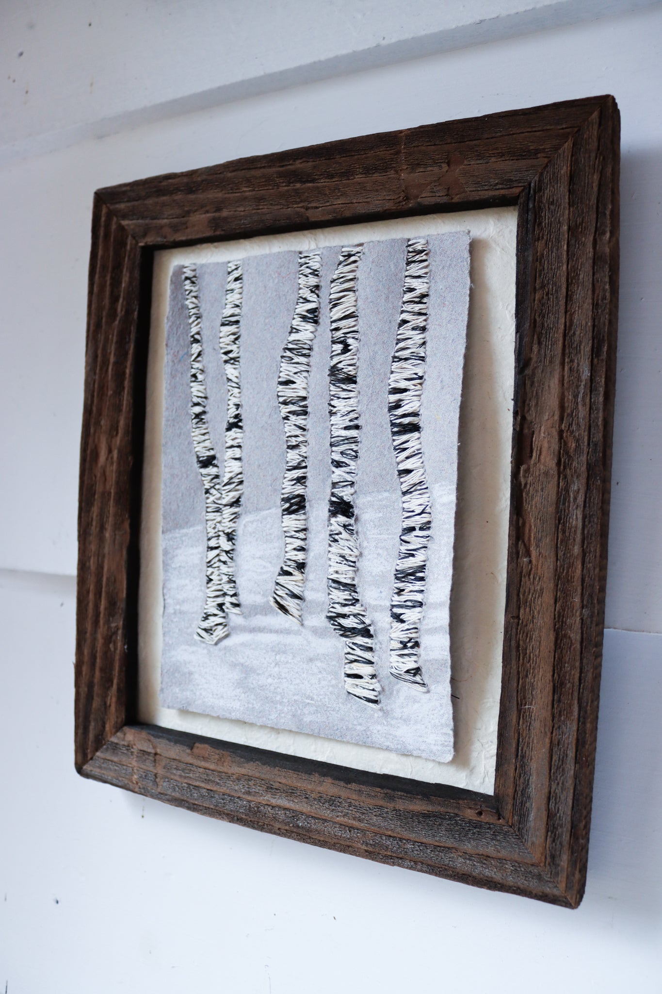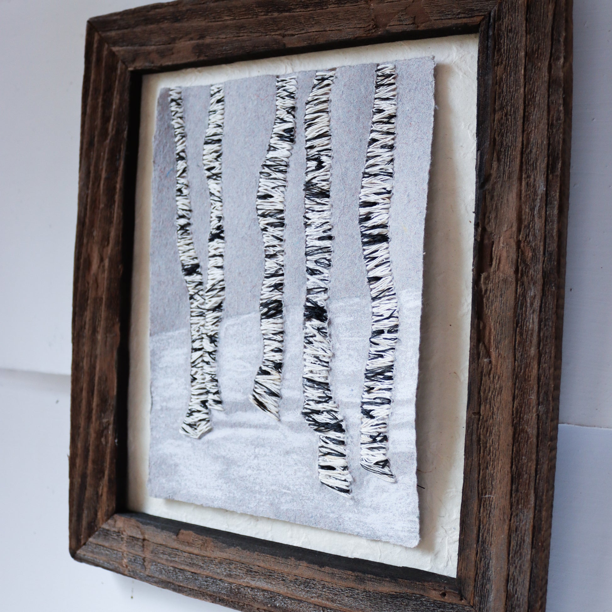 Barn wood frame. holding a 9 inch by 12 inch artwork. Paper made by me, hand-embroidered with image of birch trunks, oil pastel creates a whisper of snow and shadows.