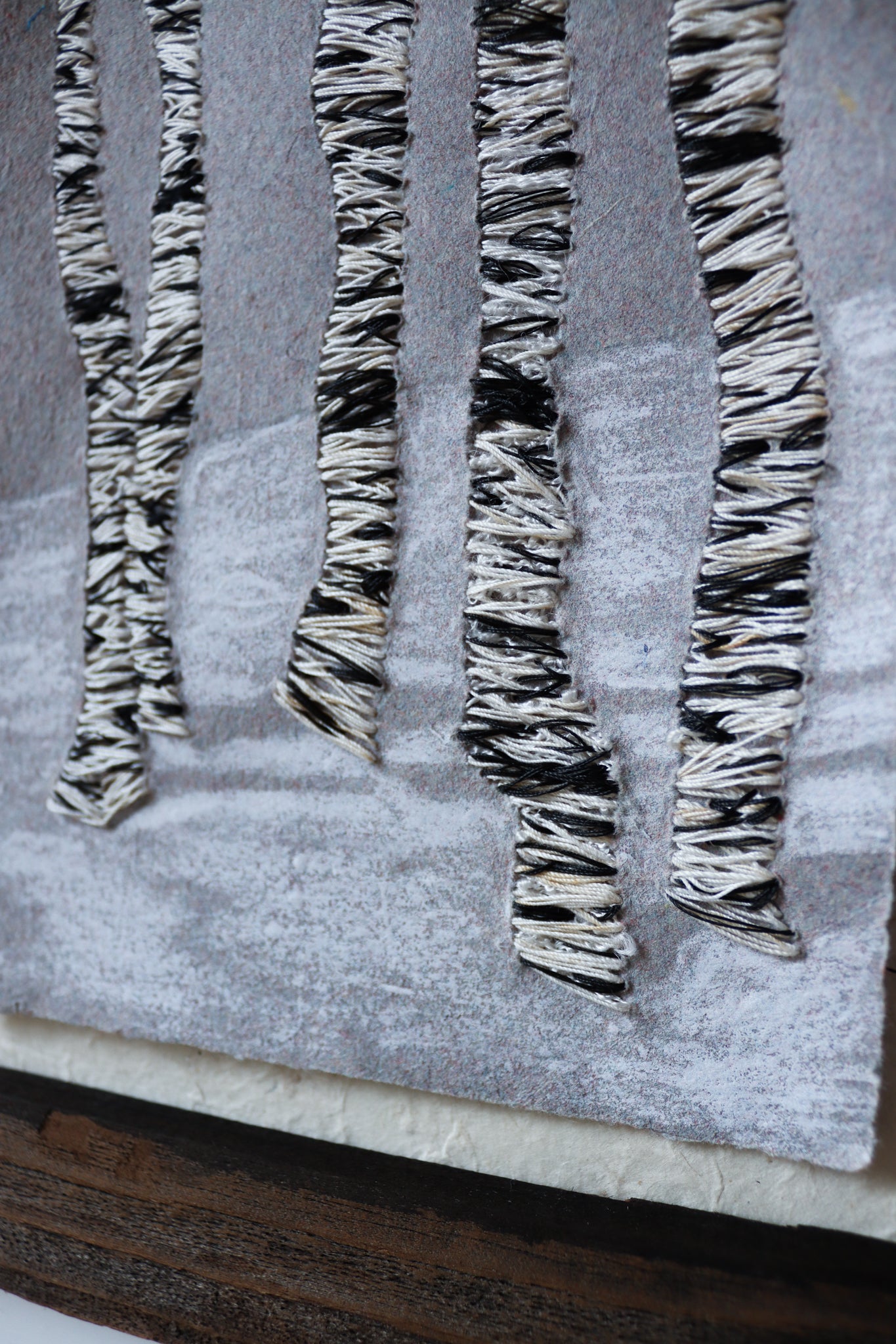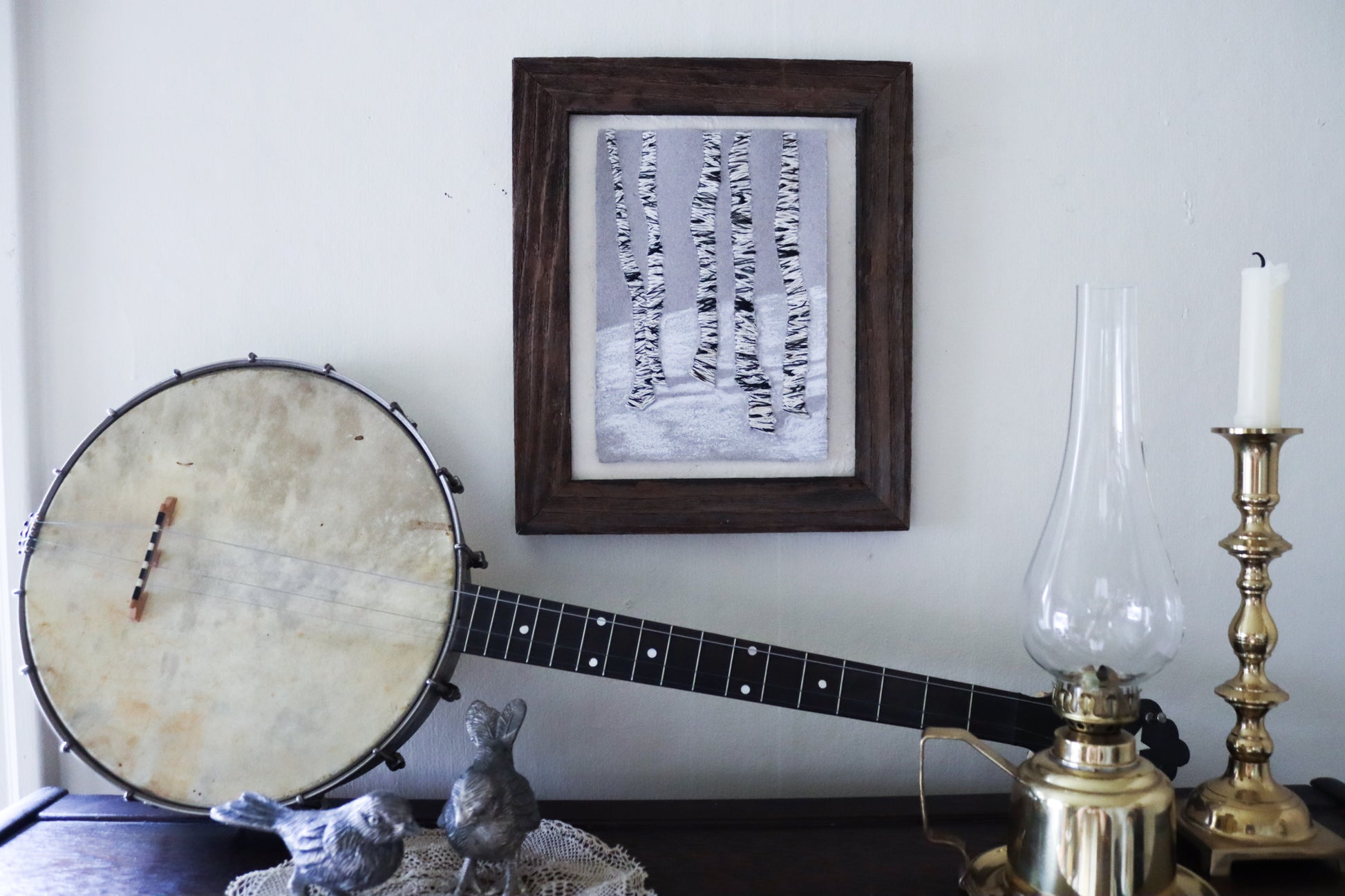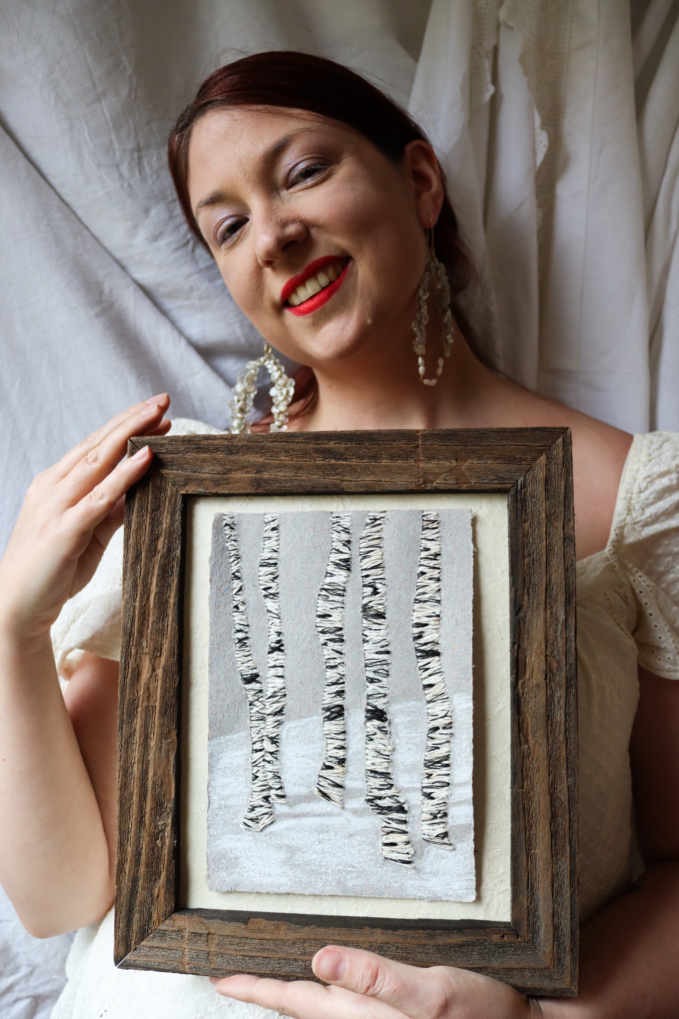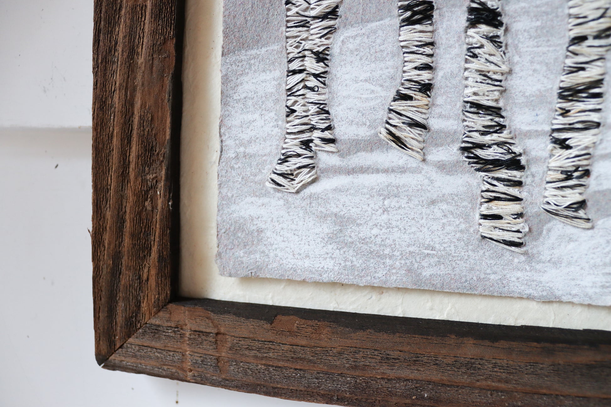 Barn wood frame. holding a 9 inch by 12 inch artwork. Paper made by me, hand-embroidered with image of birch trunks, oil pastel creates a whisper of snow and shadows.