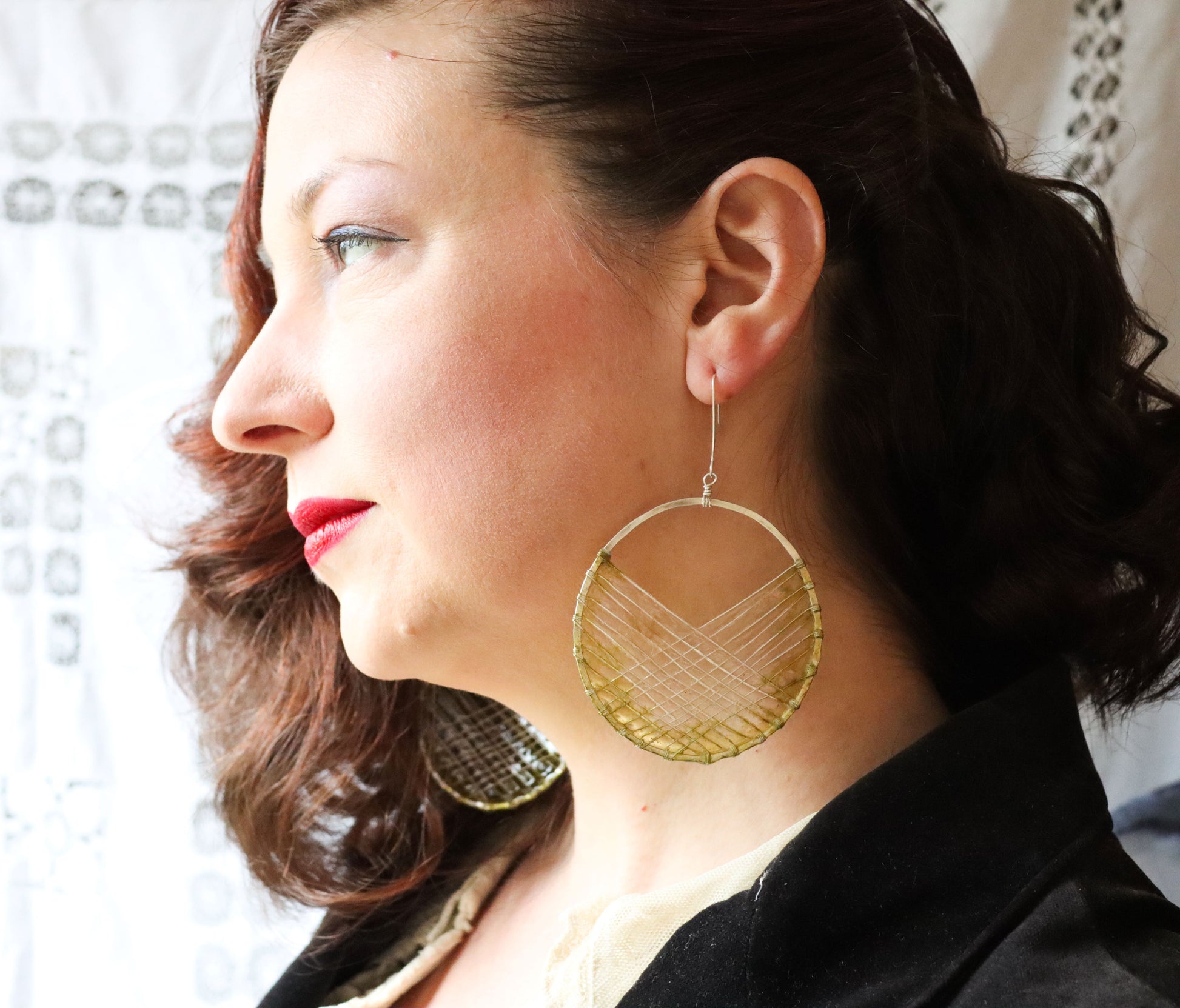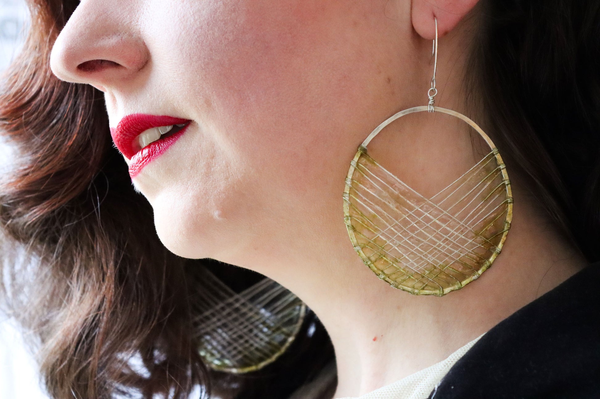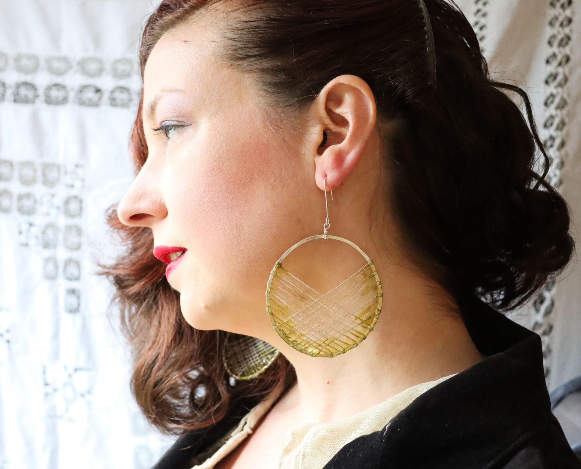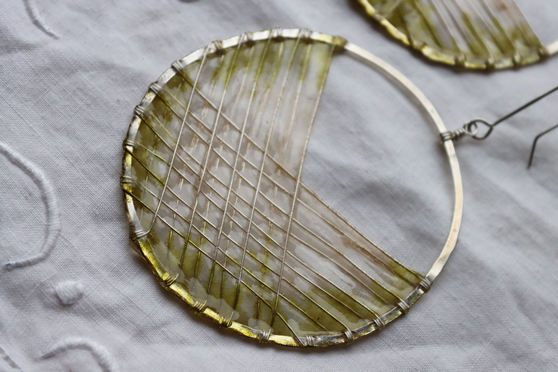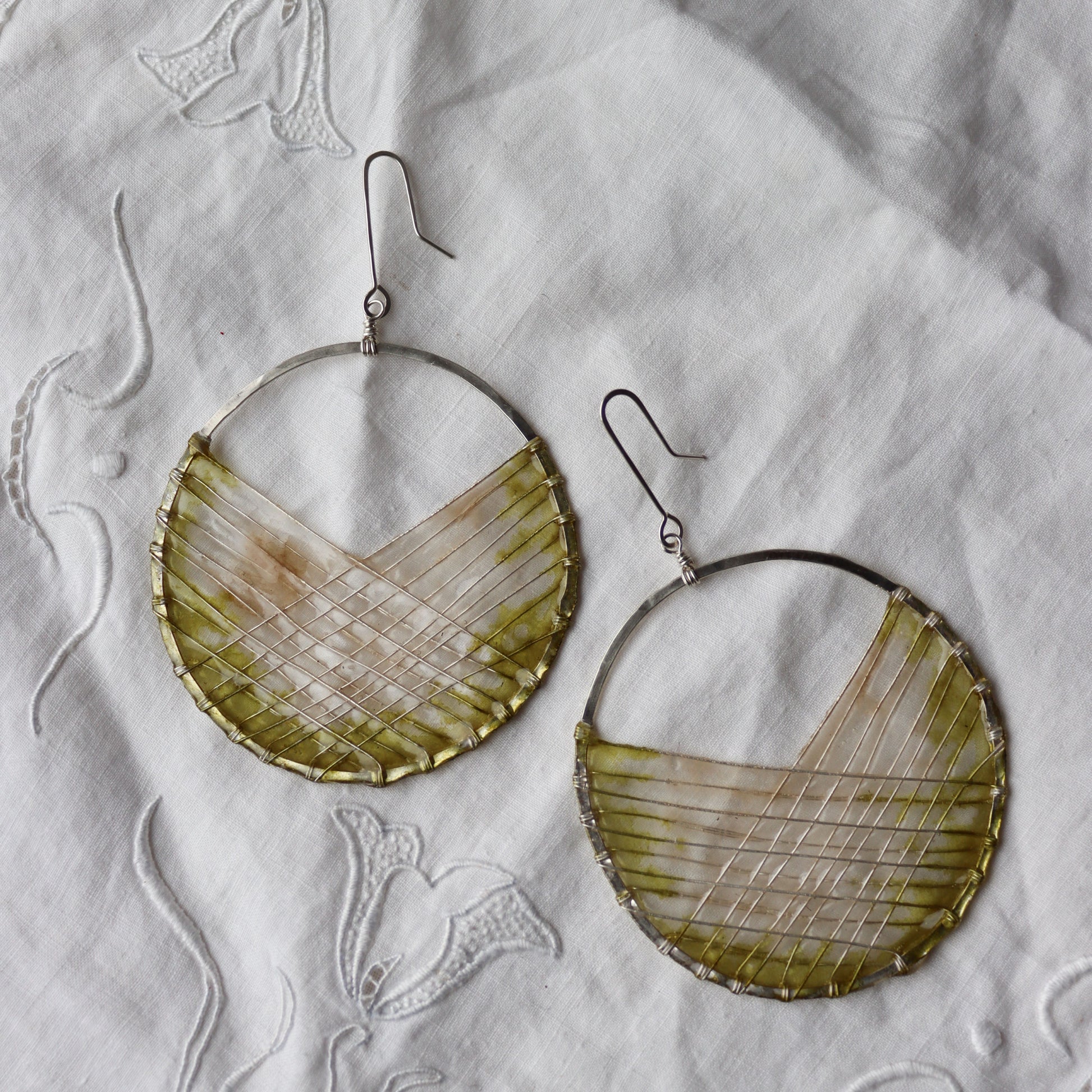 Sterling silver handmade circles with woven silver wire, filled with handmade paper, and coated in resin to make the paper waterproof and durable.