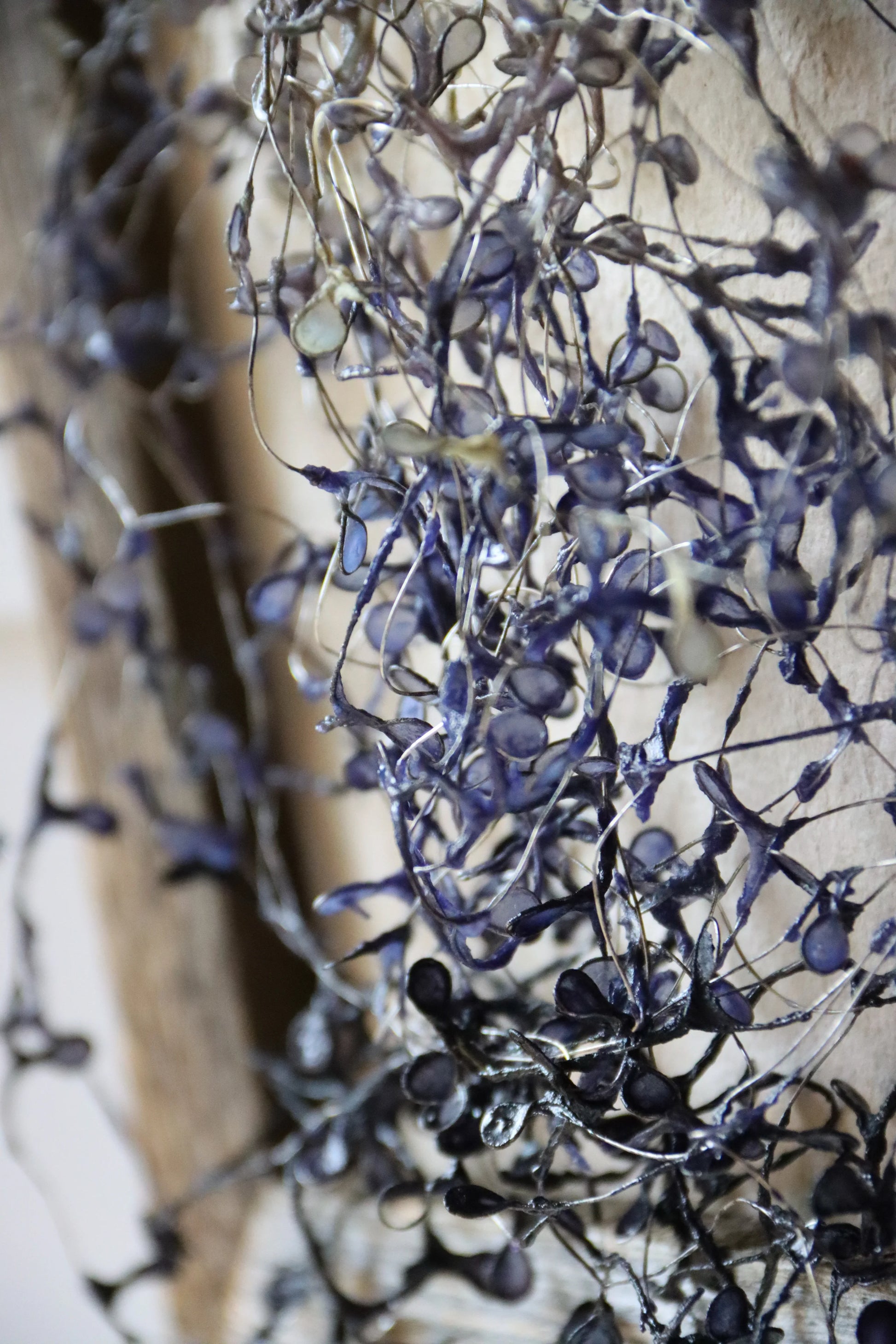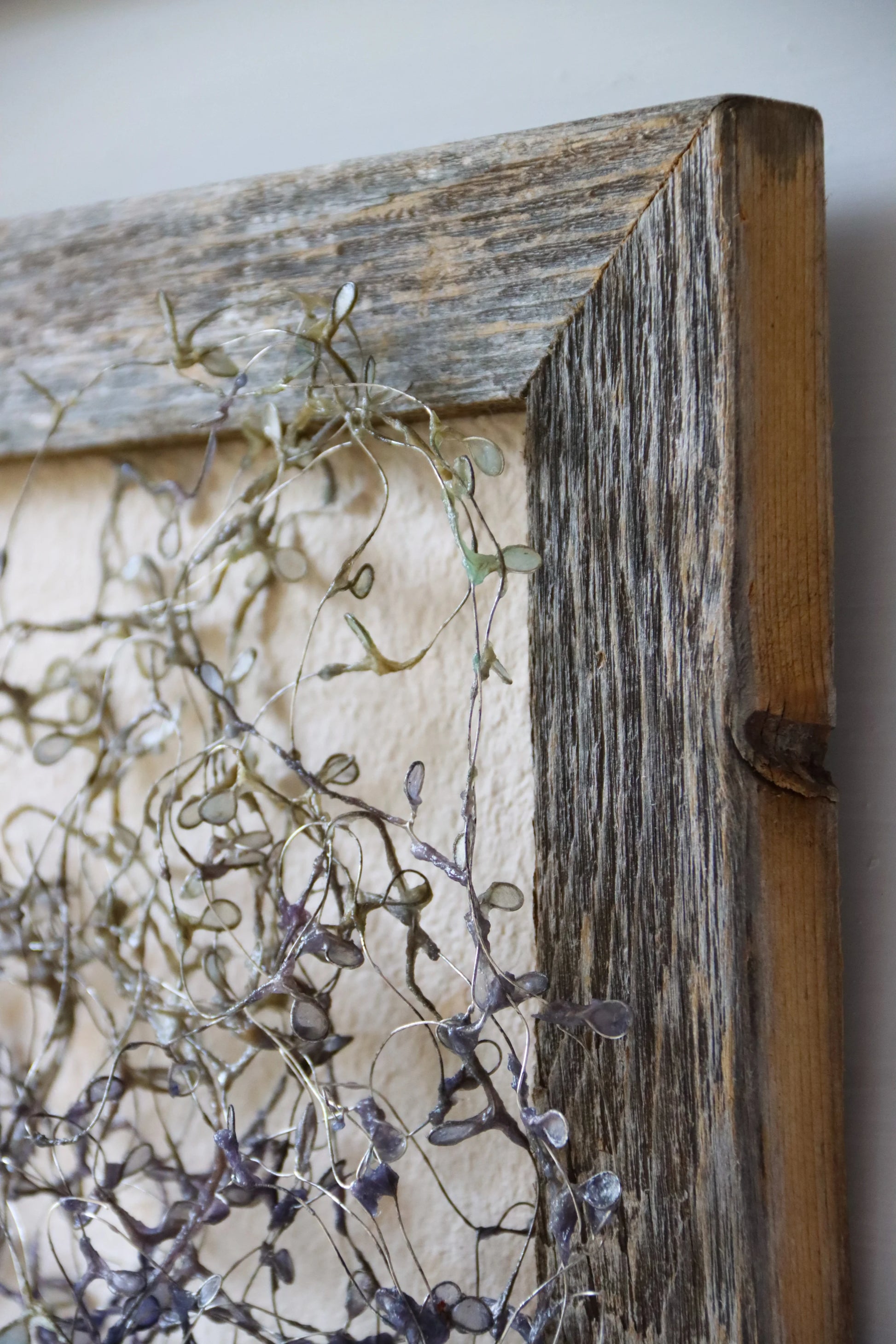 Artist-made abaca paper, cast onto fabricated sterling silver vines, dyed with pigment dyes, coated in sealer. The background is a sheet of artist-made abaca paper, framed in reclaimed barn wood.