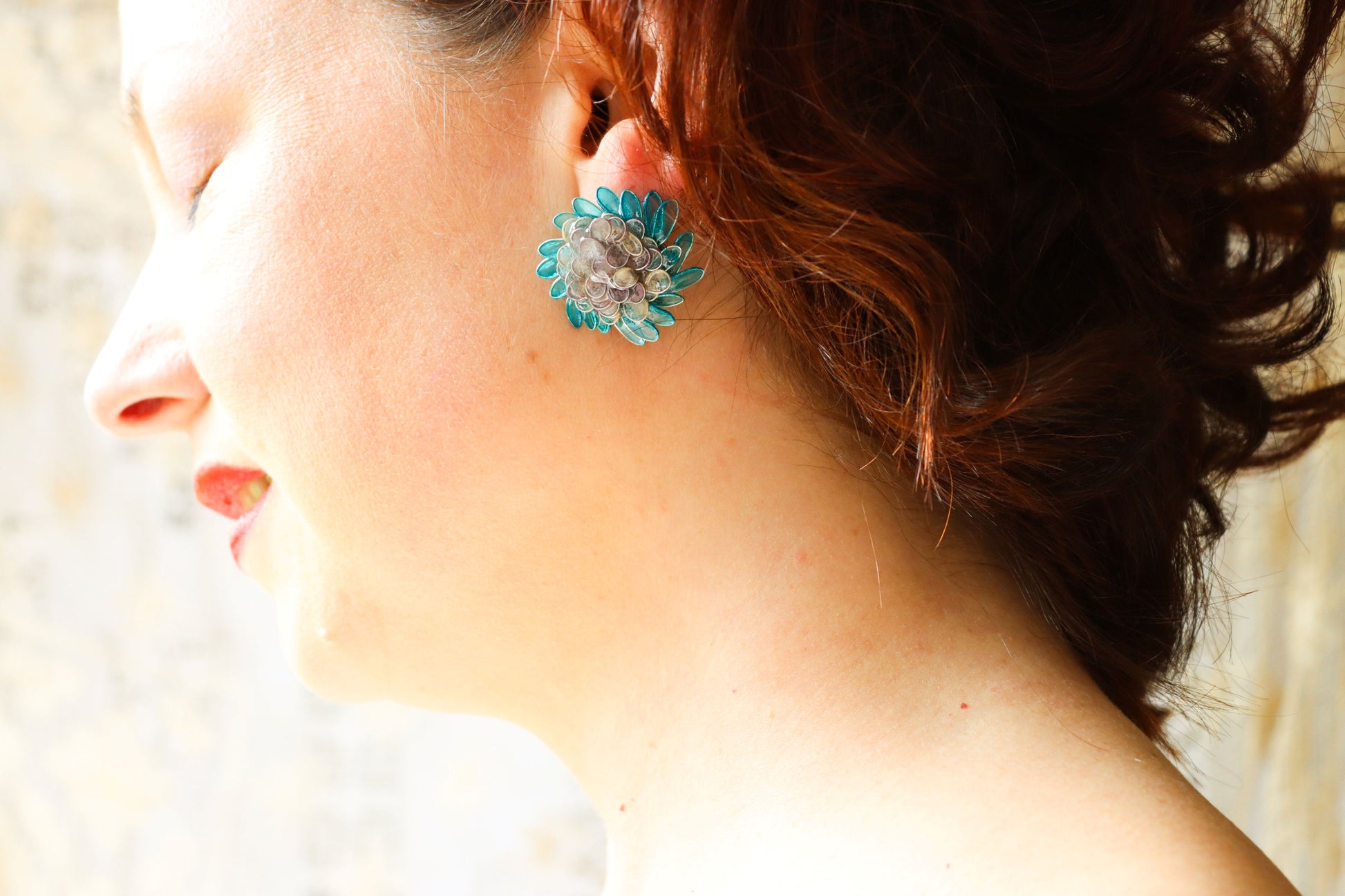 Woven flowers, with petals made of loops of silver filled with handmade paper, hand-dyed, and coated in resin to make the paper waterproof and durable.