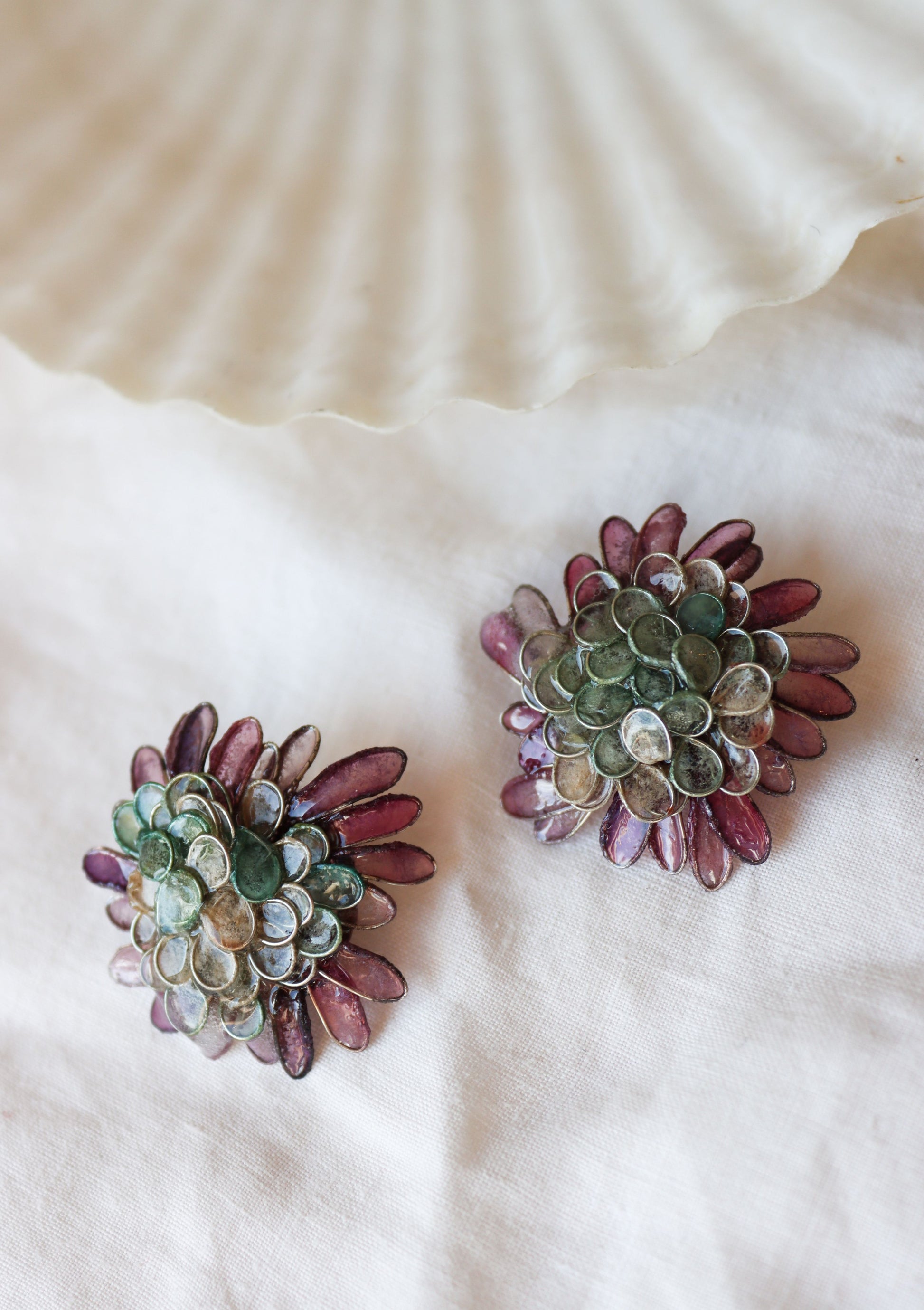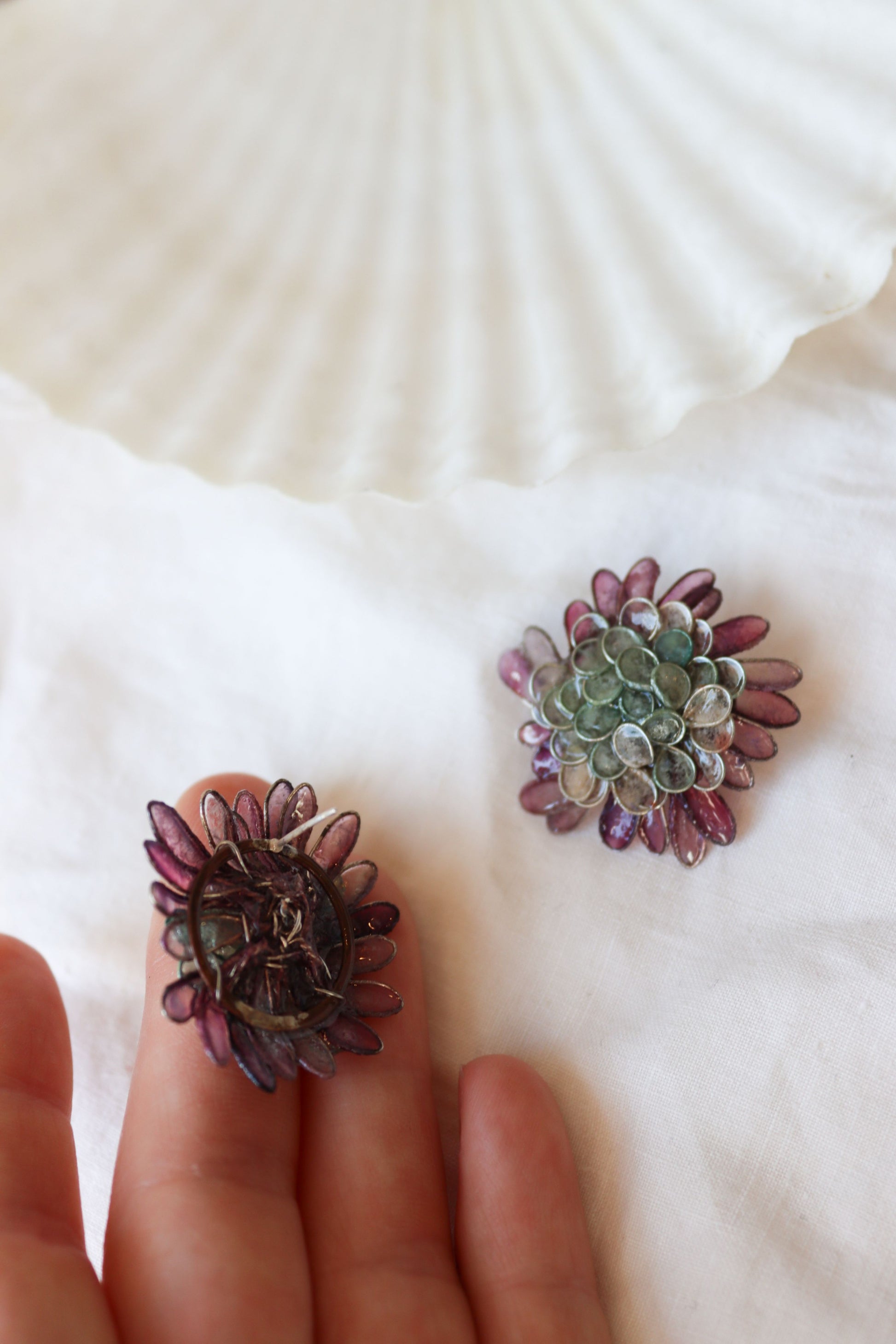 Woven flowers, with petals made of loops of silver filled with handmade paper, hand-dyed, and coated in resin to make the paper waterproof and durable.