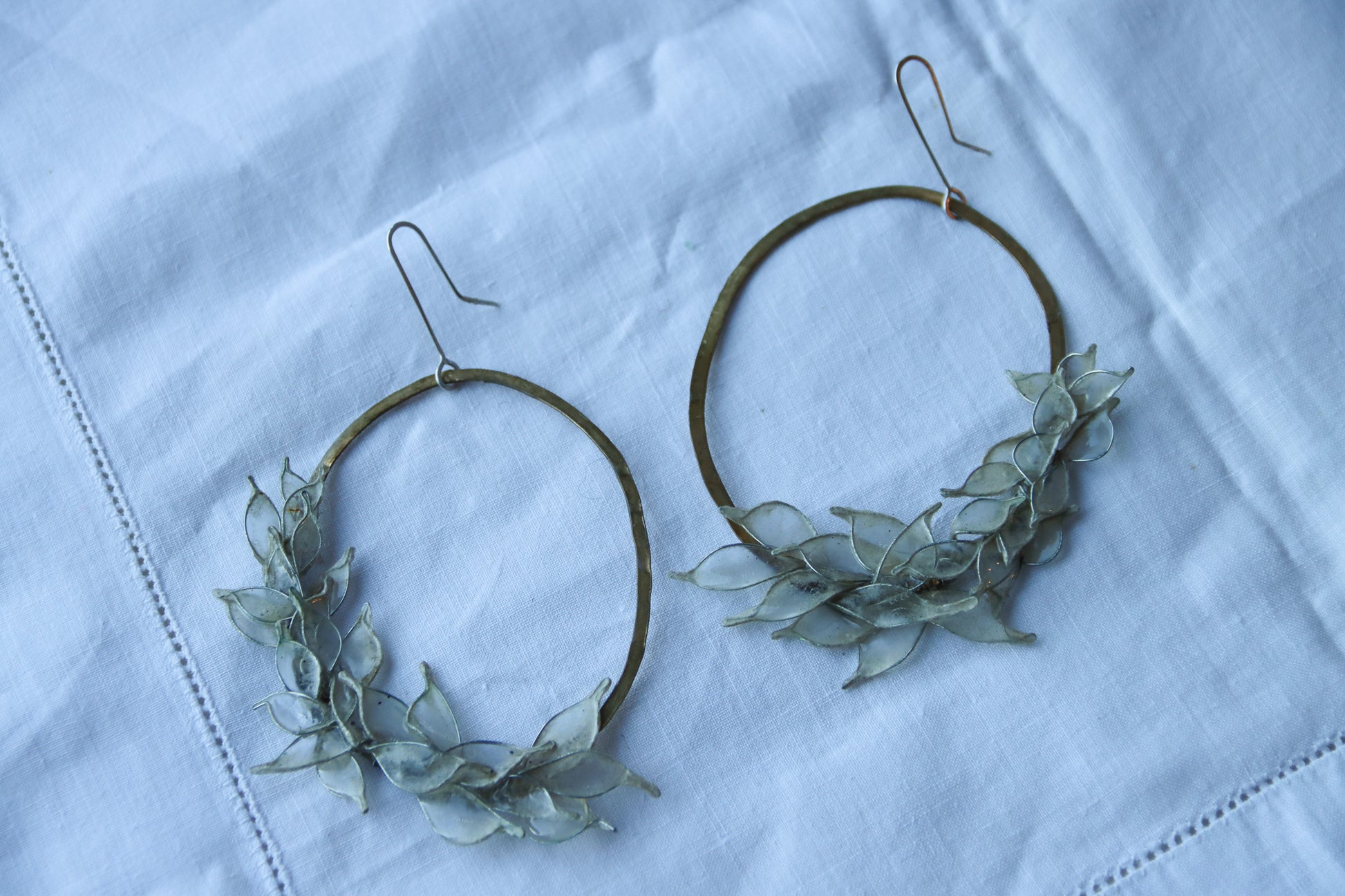 Hand-forged brass ovals, with tiny leaves made from wire and handmade paper. A layer of resin coats the paper, to make it waterproof and durable.