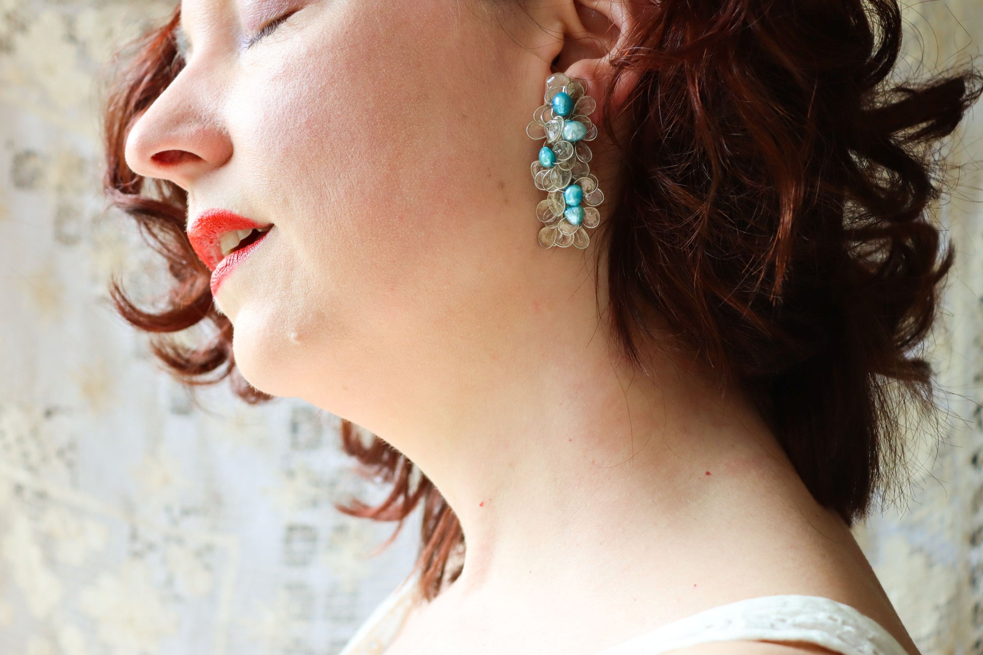 The earrings have a slight curve to give them a flowing elegance. The backs of the earrings are also covered in petals, so you can wear your hair up and the earrings will look just as lovely from the back.