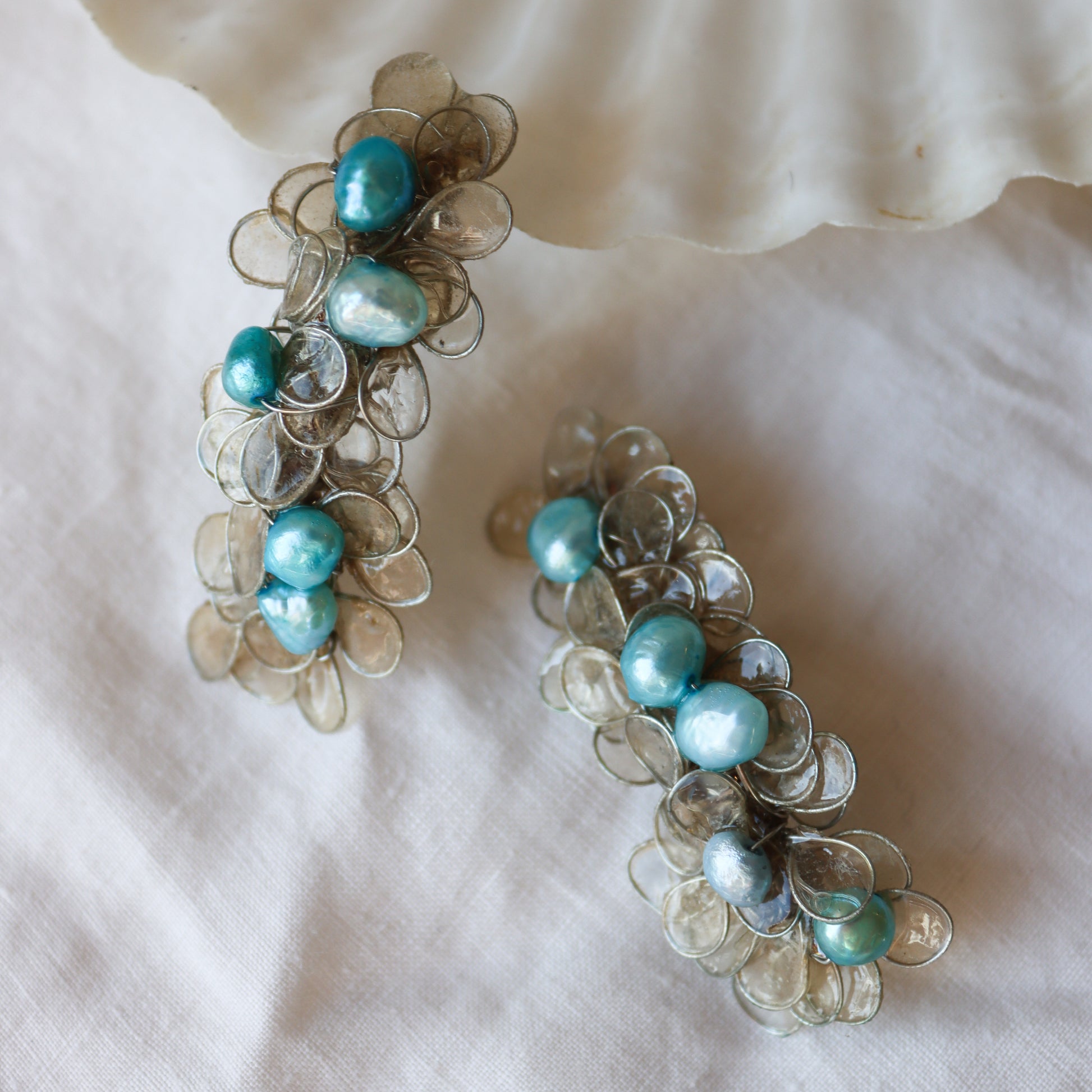 Garlands of woven ivory petals, studded with bright blue freshwater pearls. The petals are made from handmade paper, and sealed with resin to make them waterproof and durable.