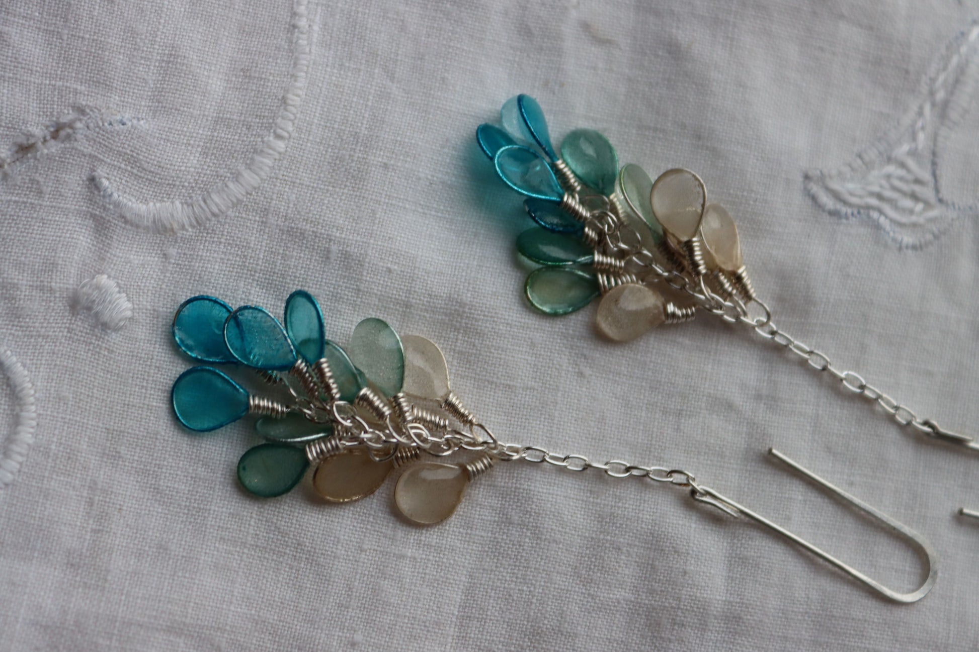 Sterling silver loops, filled with handmade paper, hand-dyed, and coated in resin to make the paper waterproof and durable. Sterling silver chain and earwires.