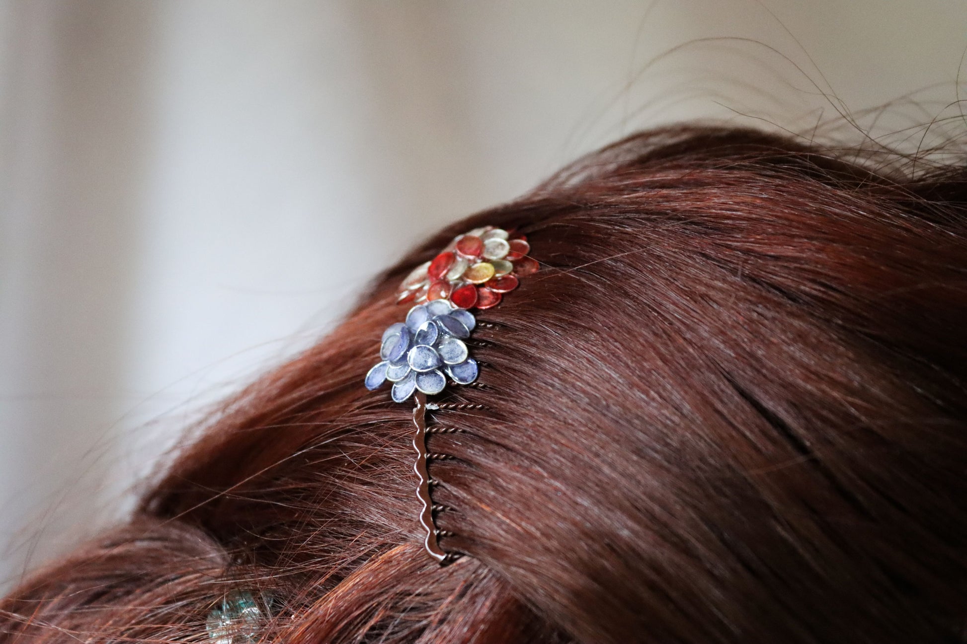 The flowers are made from loops of copper, filled with handmade paper, hand-dyed, and coated in resin to make the paper waterproof and durable. If you get hair product on your combs, simply wash them with soap and water.