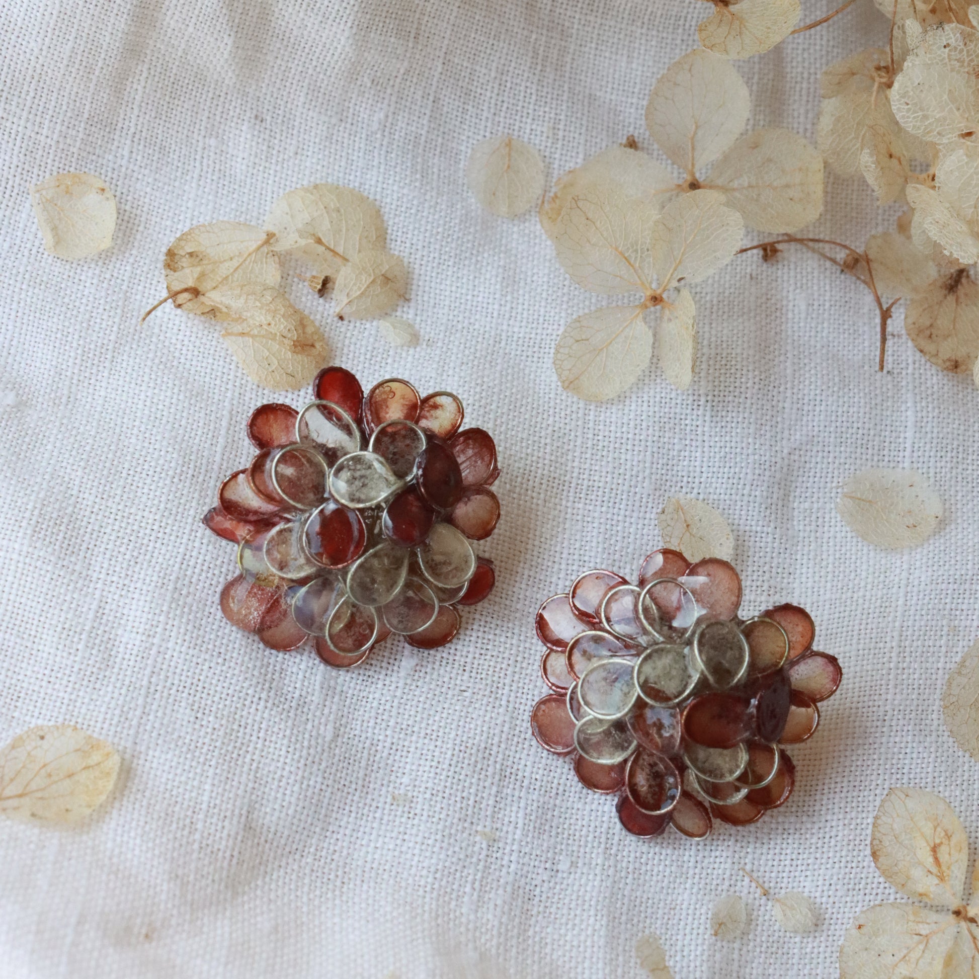 Petals made from handmade paper & sterling silver, woven by hand into hydrangea flowers. Hand-dyed burgundy and ivory for a variegated effect, and coated in resin to waterproof and harden the paper. Sterling silver posts. About 1" across.