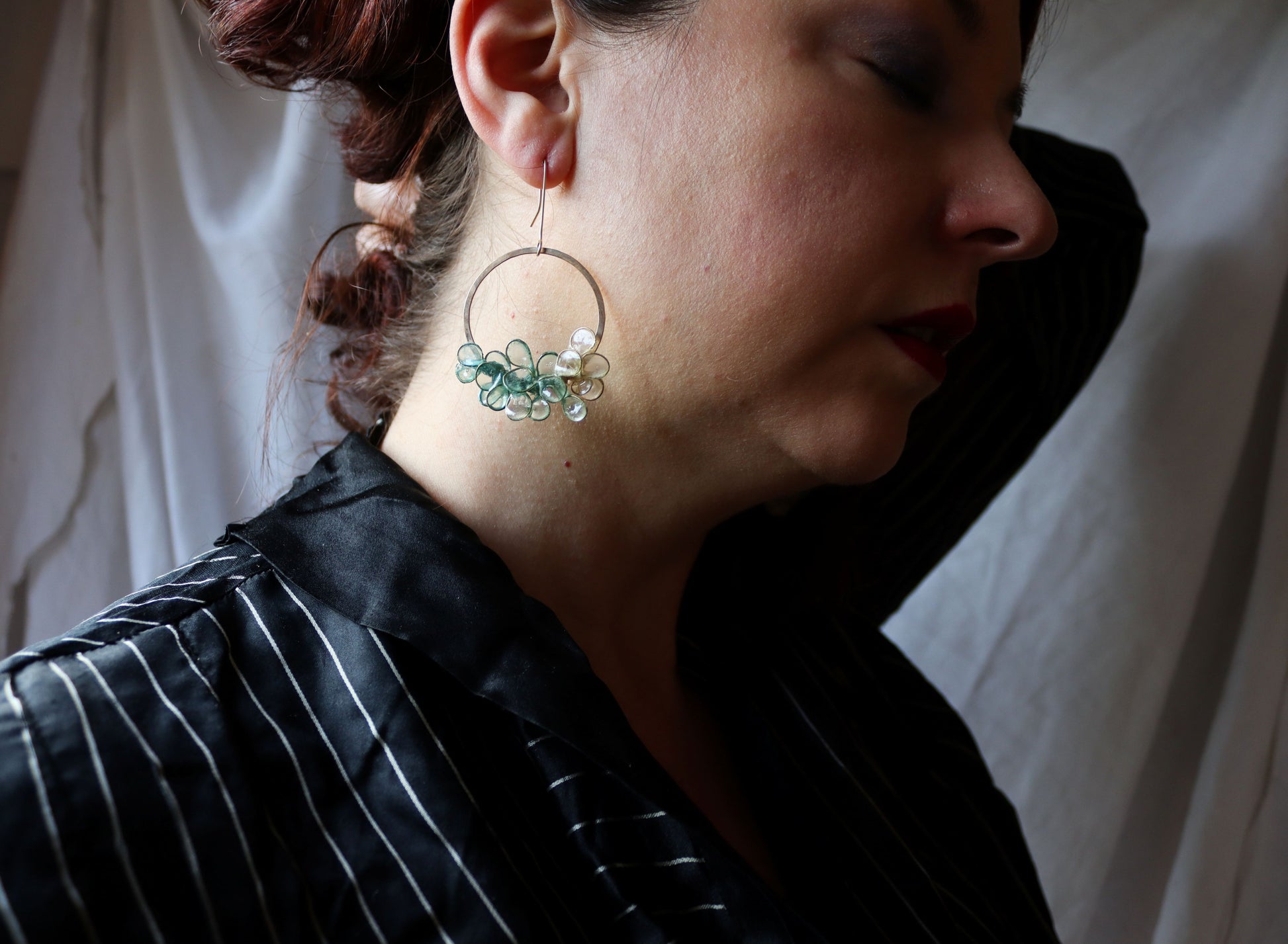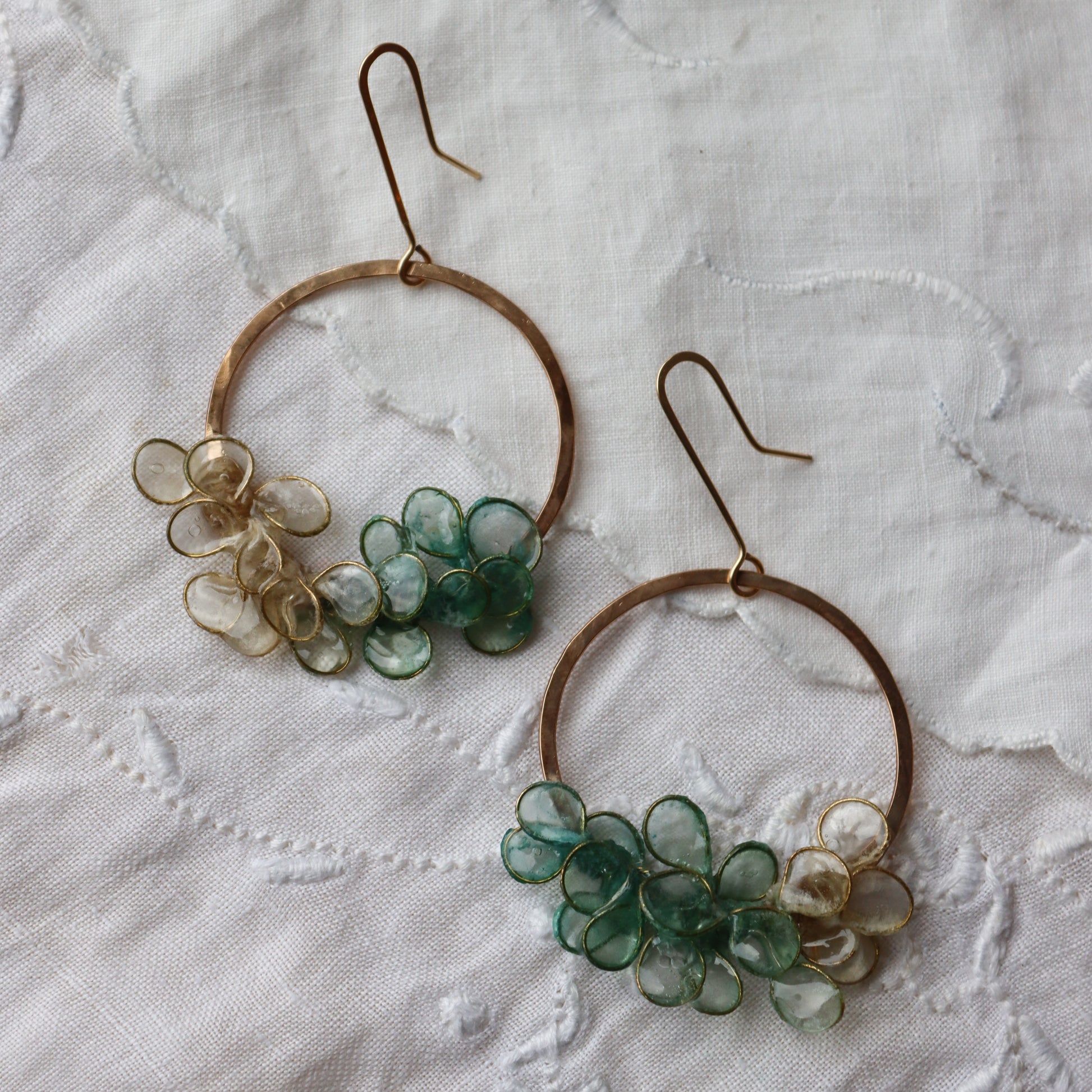 Hand-forged 14k gold filled circles, with petals made from brass and handmade paper. The paper has been dyed seaglass green with an ombre effect. A layer of resin coats the paper, to make it waterproof and durable.