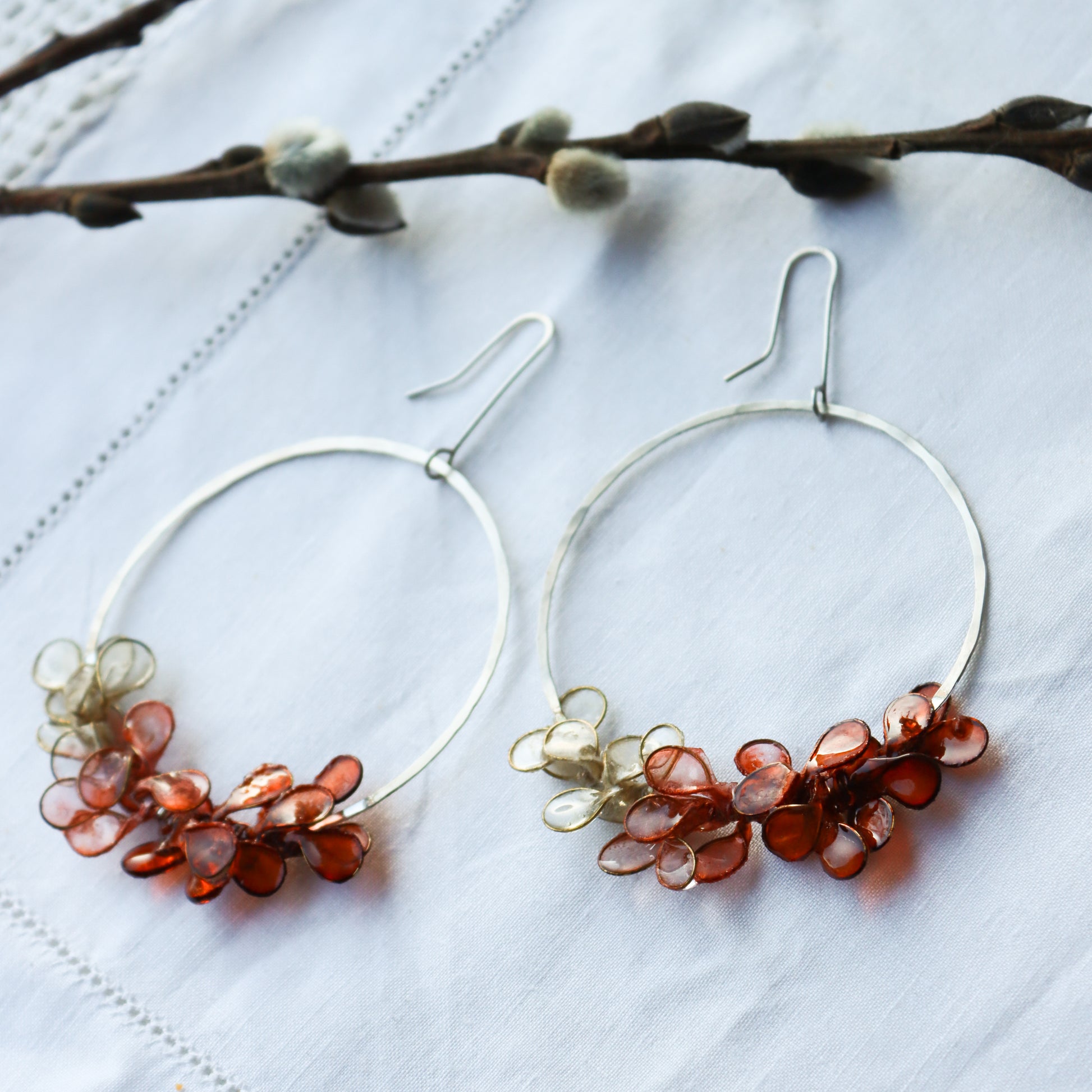 Hand-forged sterling silver circles, with petals made from copper and handmade paper. The paper has been dyed shades of burnt orange to apricot to ivory. A layer of resin coats the paper, to make it waterproof and durable.