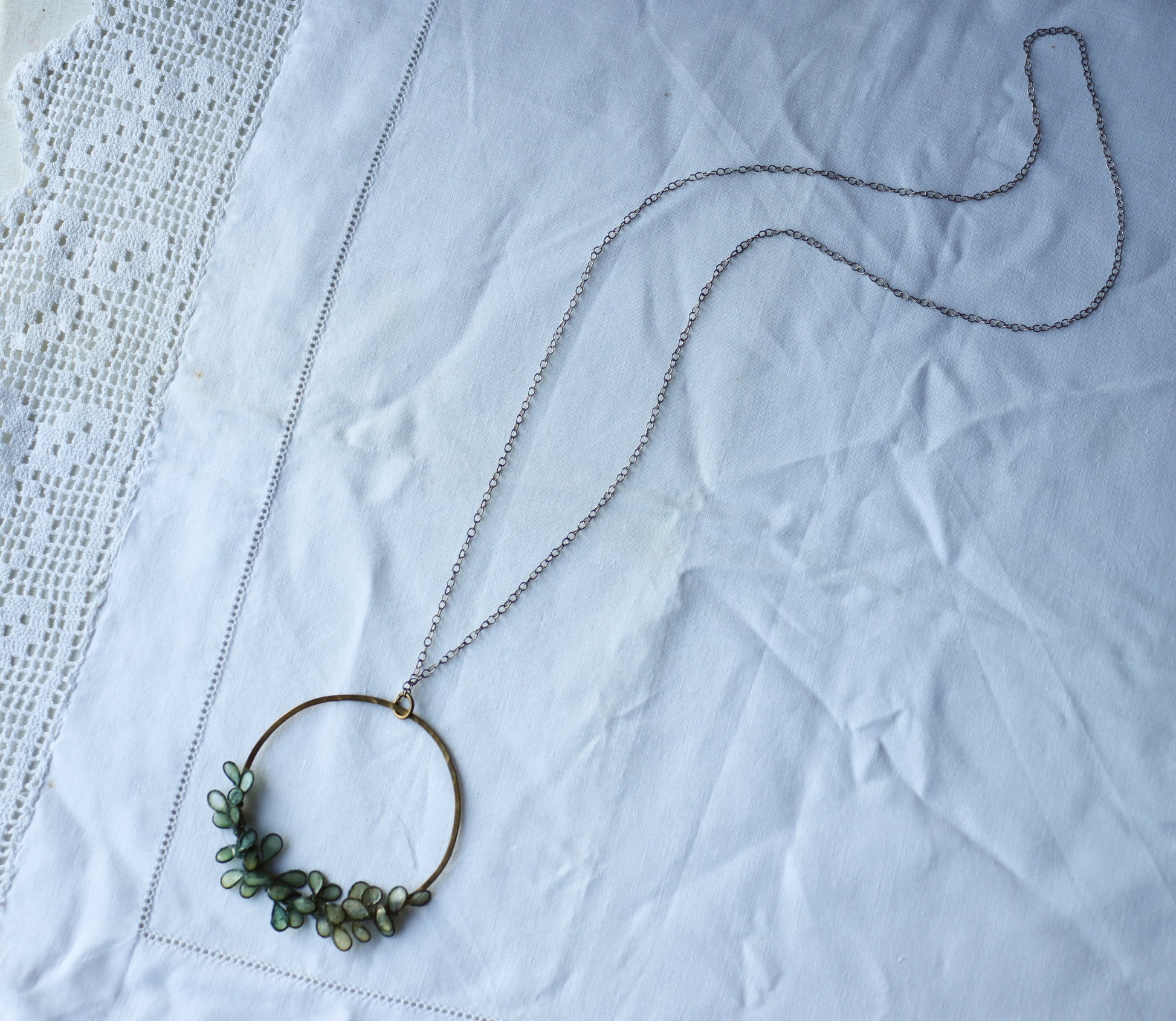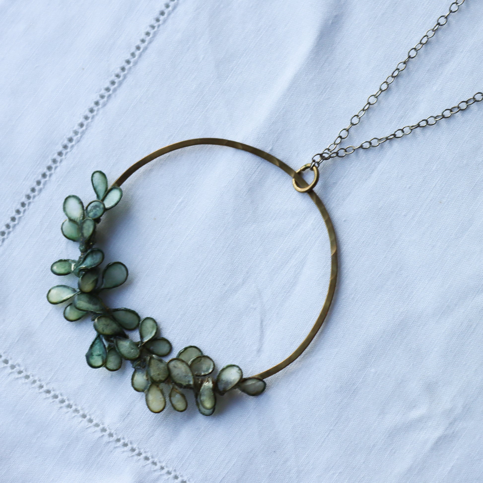 A hand-forged brass circle with a lacquer to finish to preserve the shine of the brass and protect your skin, with a festoon of petals made from loops of brass that have been filled with handmade paper, hand-dyed, and sealed with resin to harden and waterproof the paper.