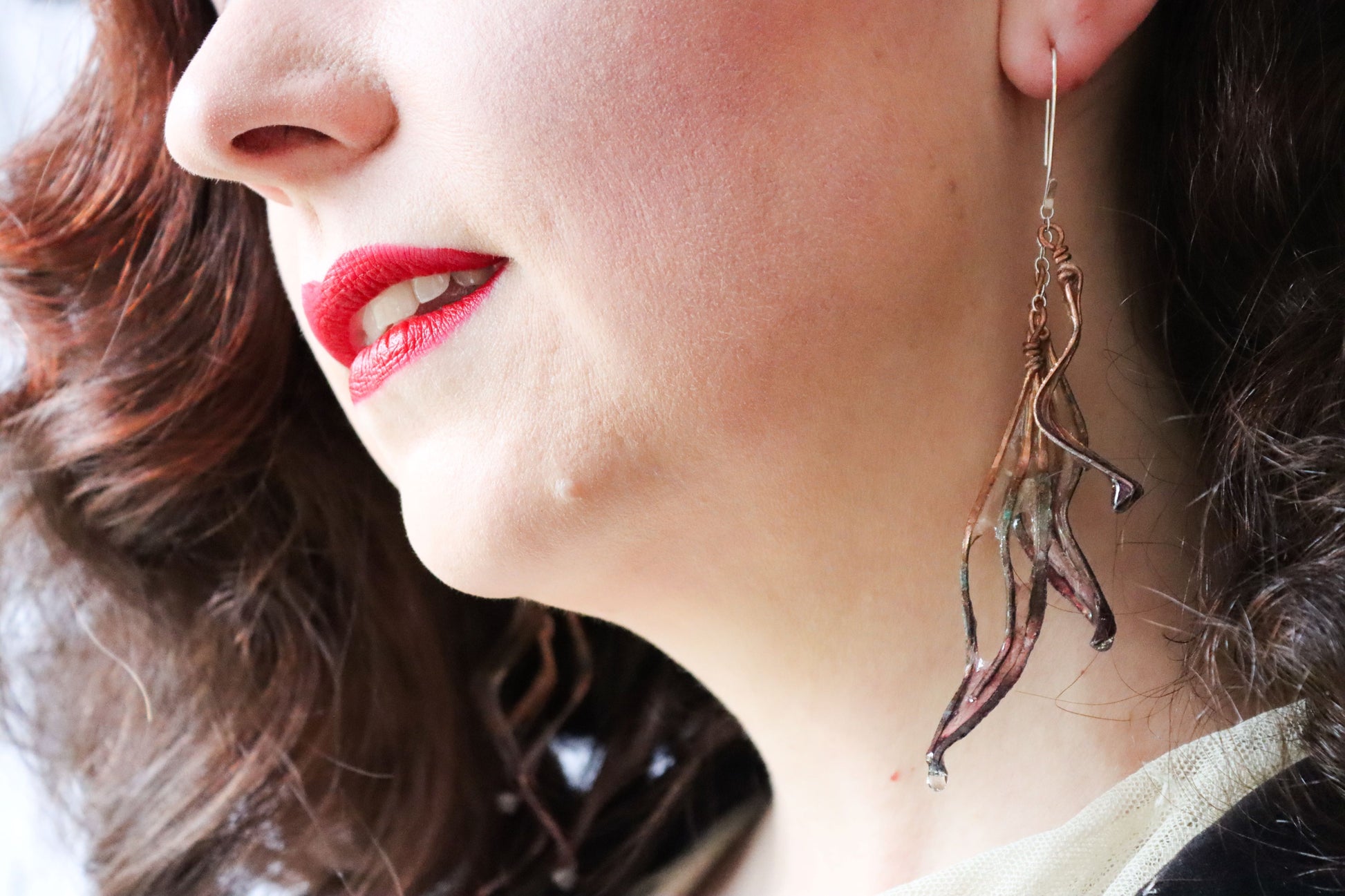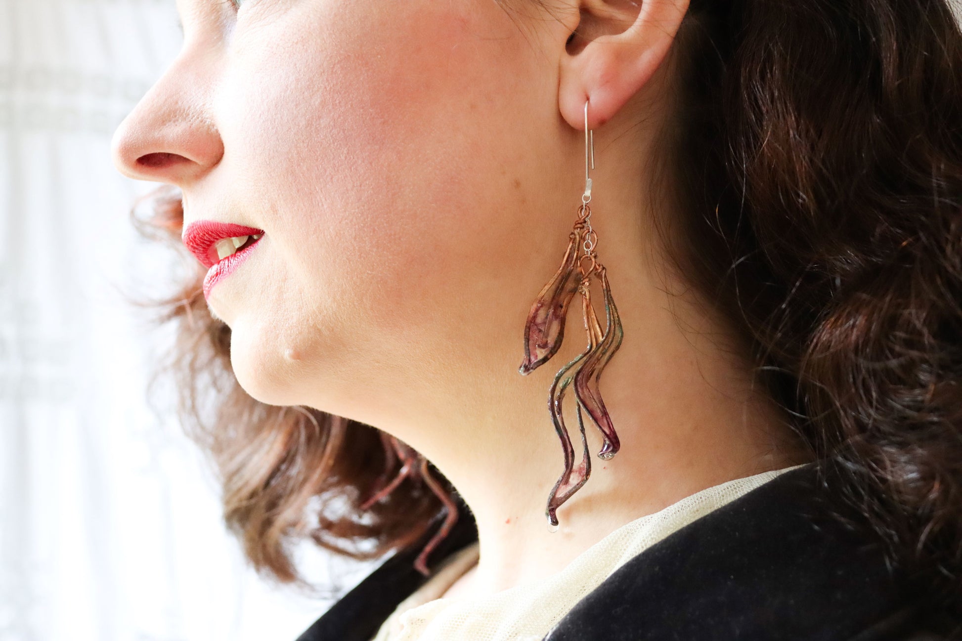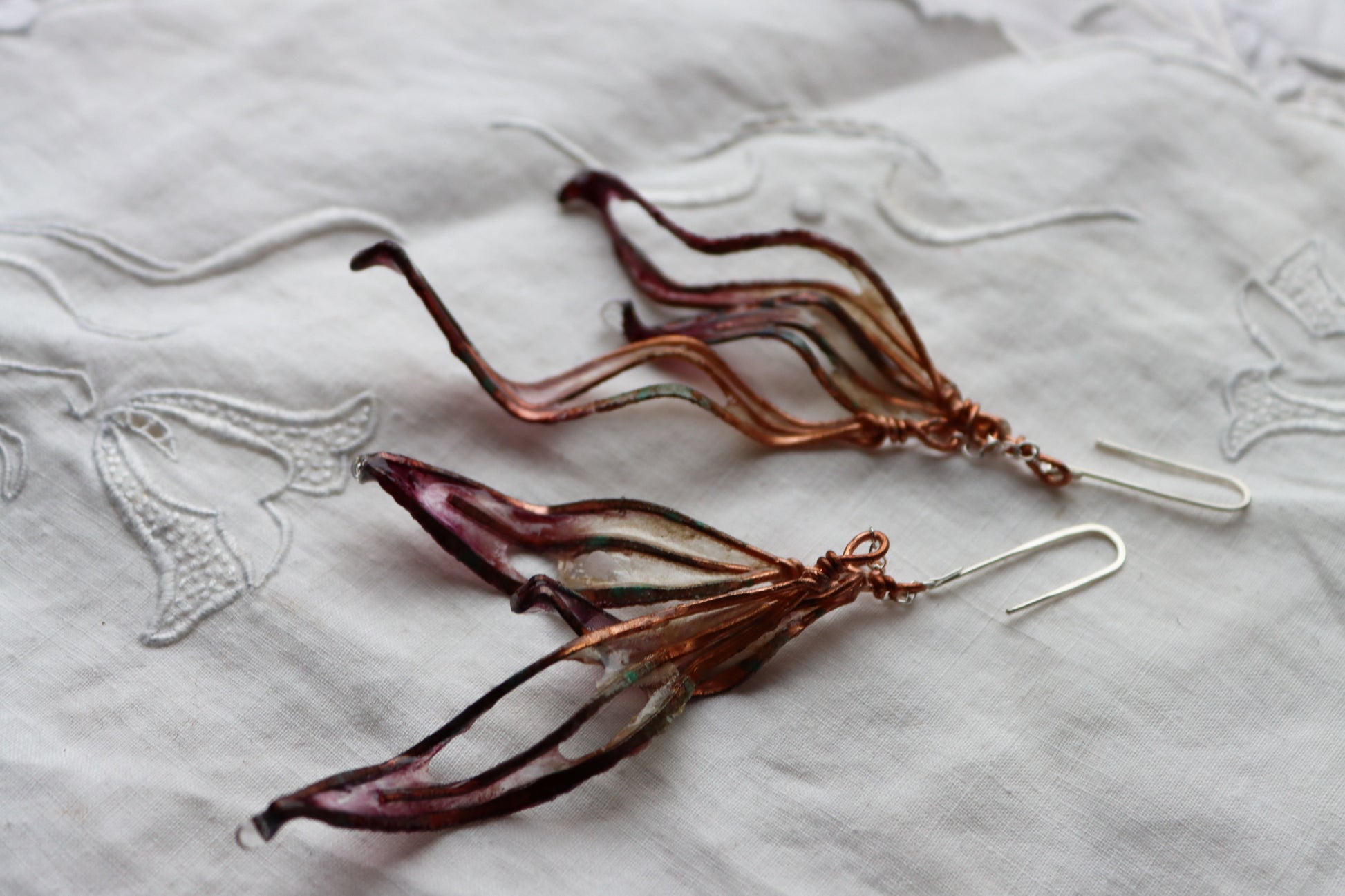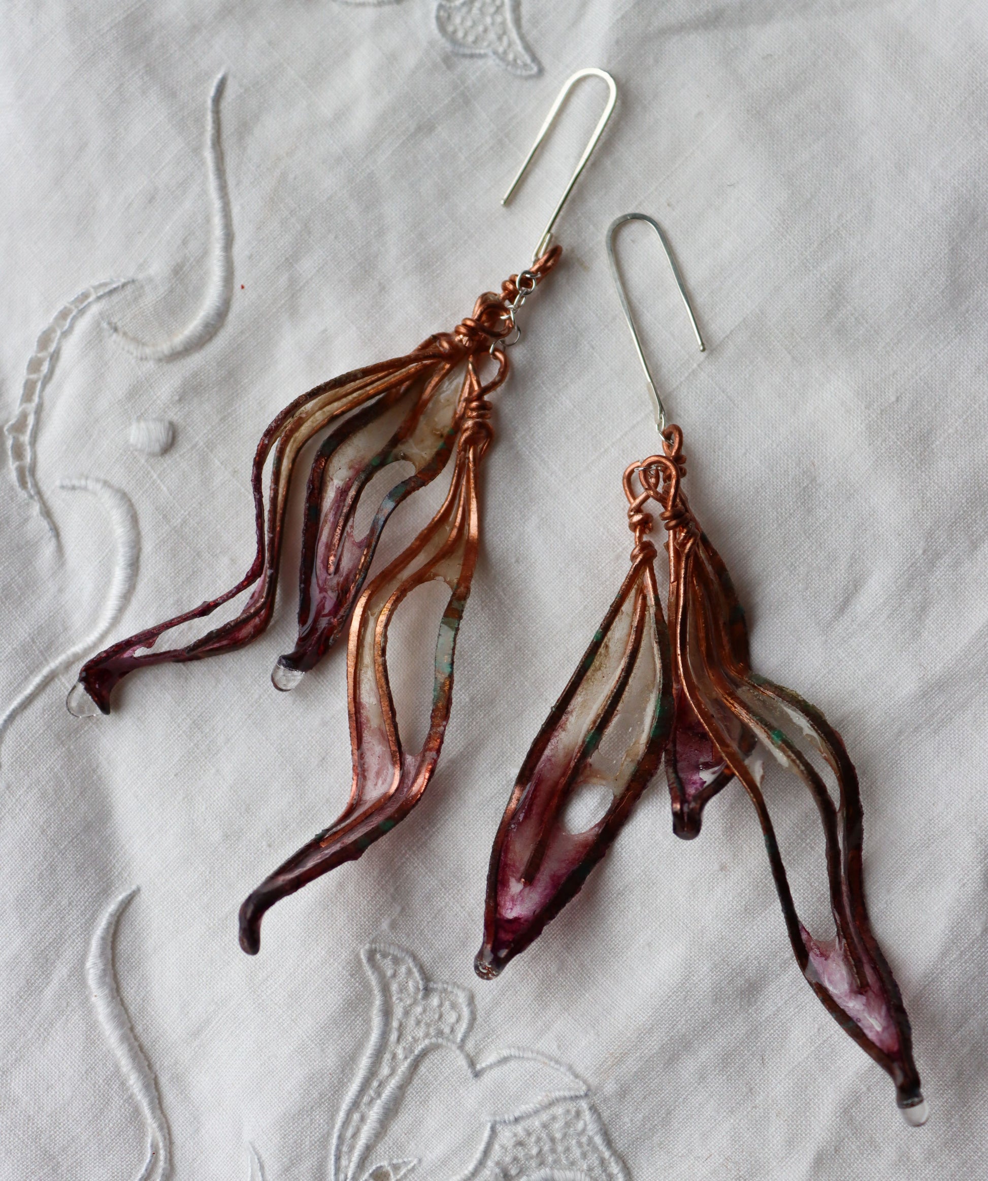Hand-forged copper leaves, cast in handmade paper, hand-dyed with lilac dye and patina from the copper, and coated in resin to make the paper waterproof and durable.