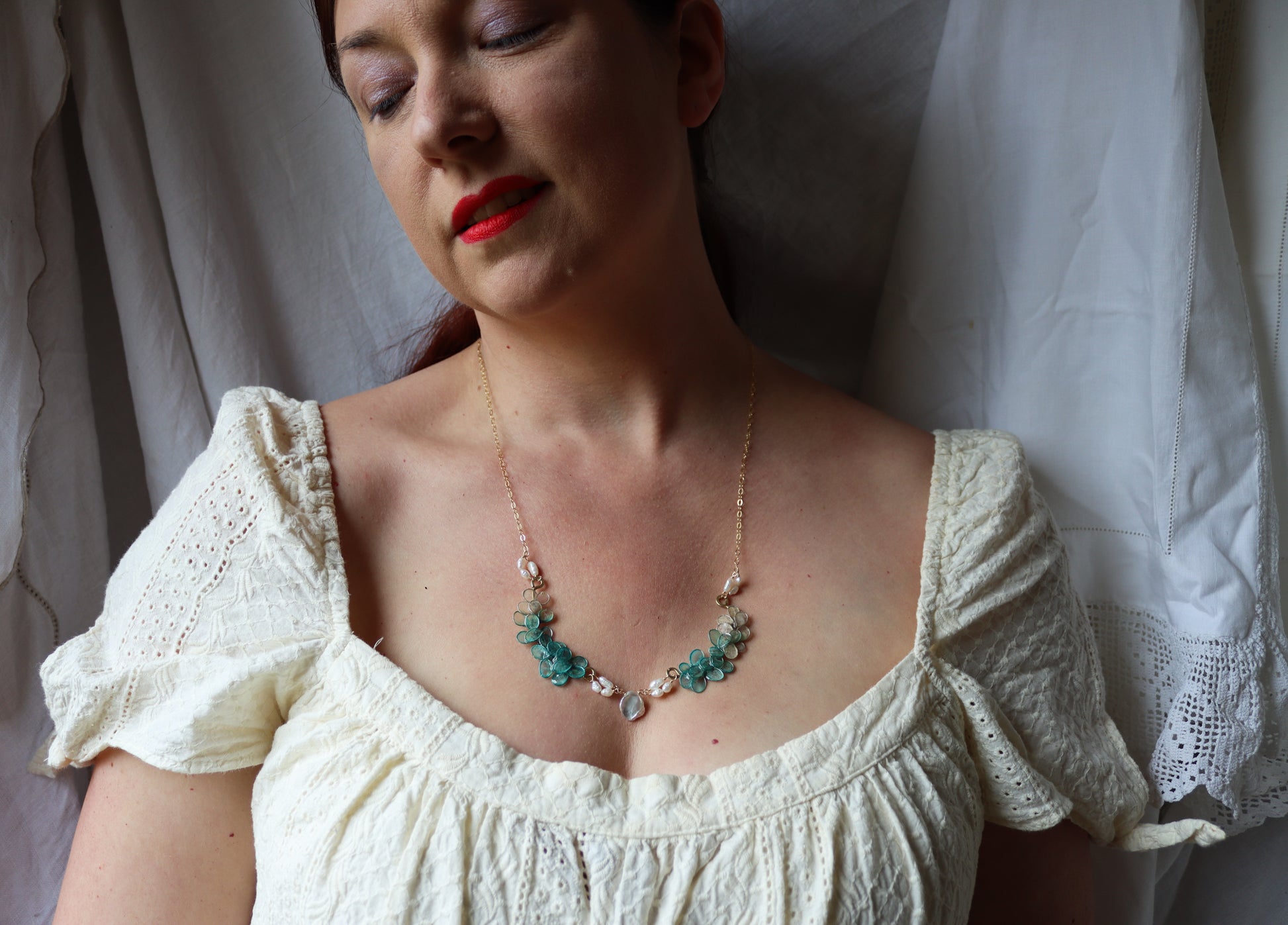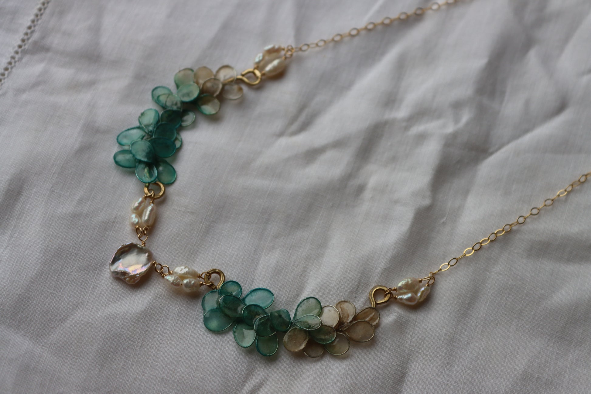 Flanked by brass and paper petal garlands dyed shades of bright blue and pale green and ivory, sealed with resin to make the paper waterproof and durable.