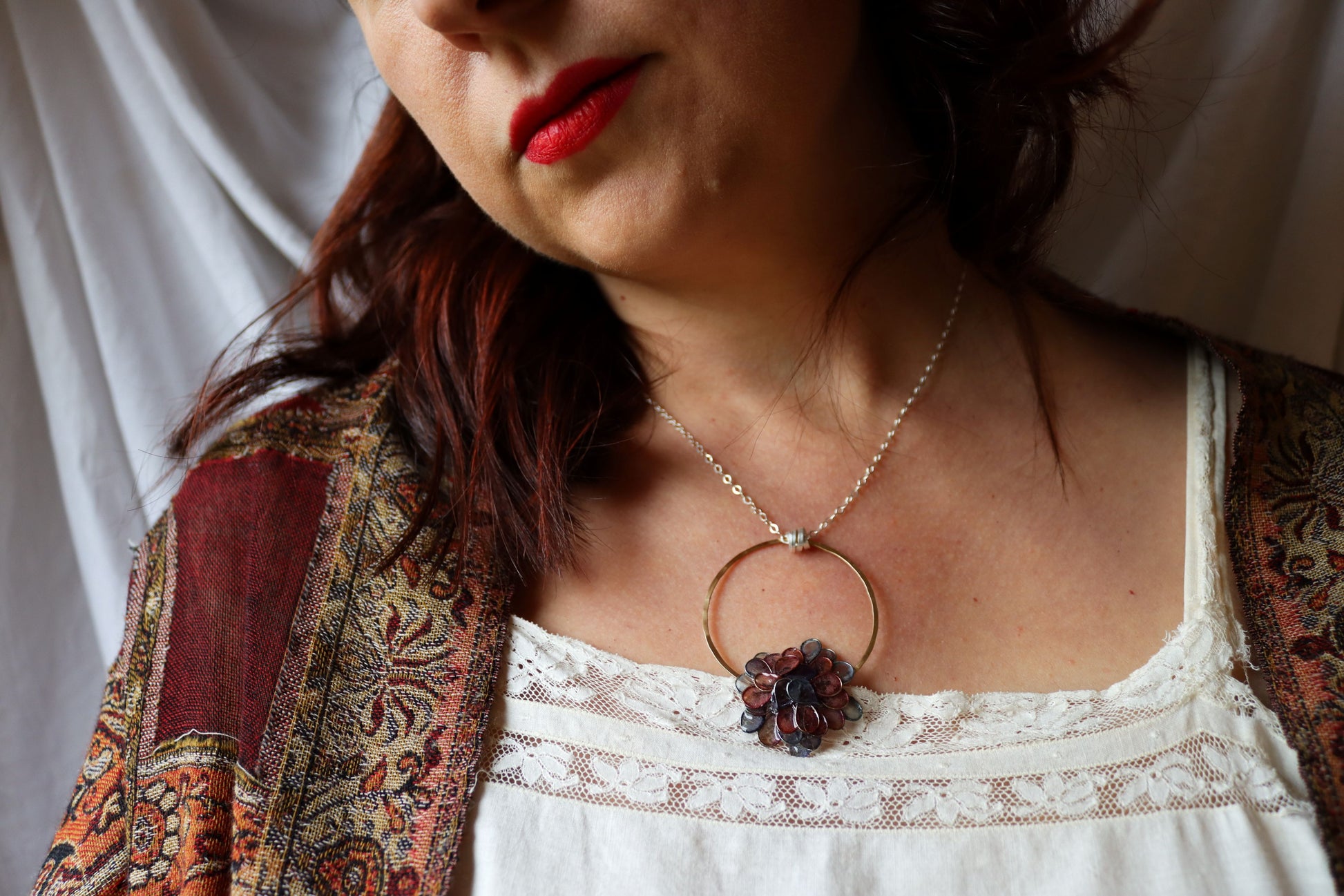 A hand-forged brass circle with a lacquer finish to preserve the shine, with a flower made from copper and handmade paper. The paper has been dyed shades of indigo and burgundy. A layer of resin coats the paper, to make it waterproof and durable.