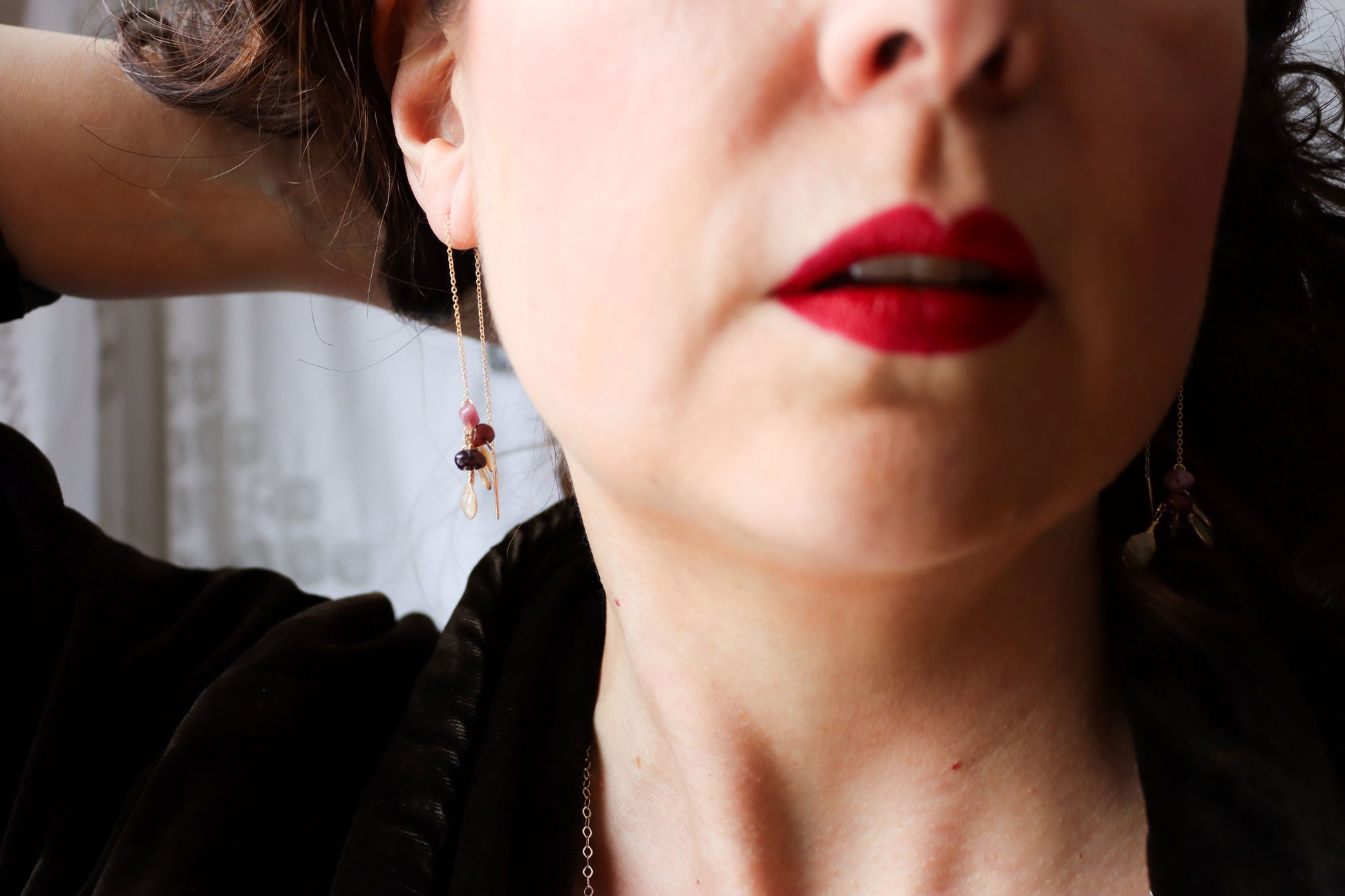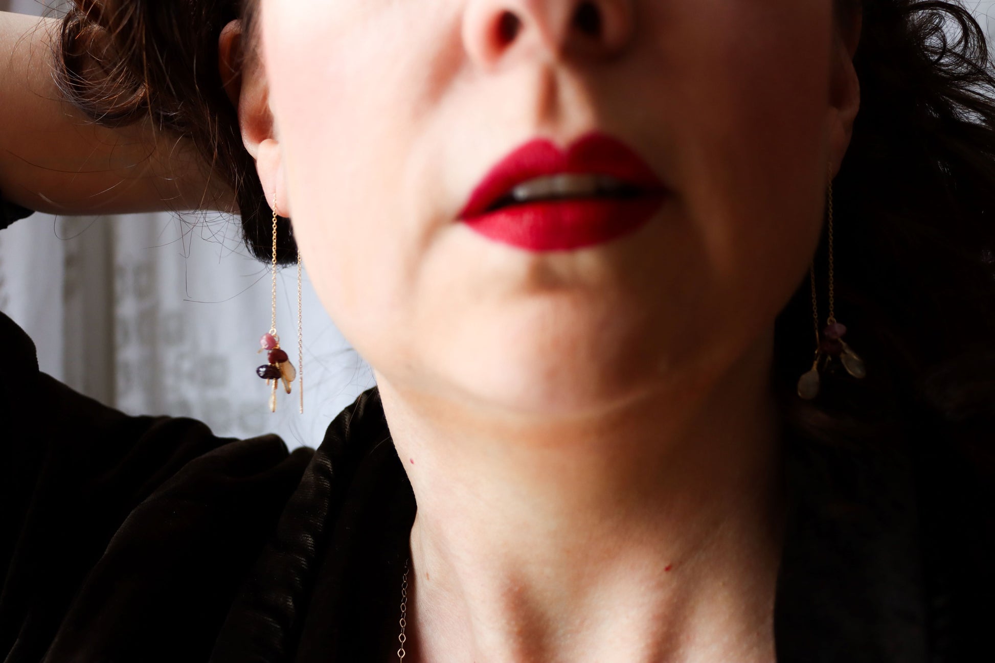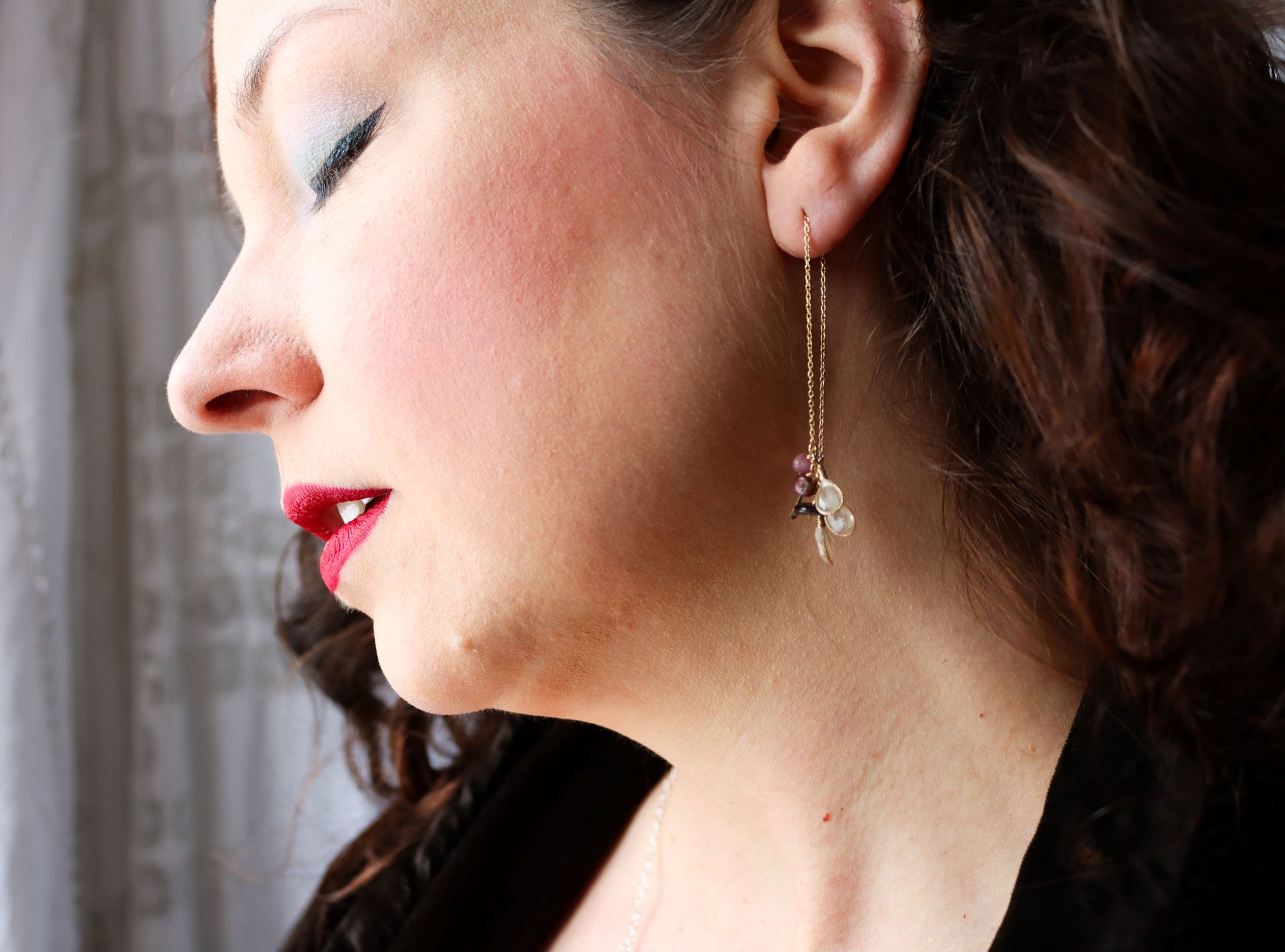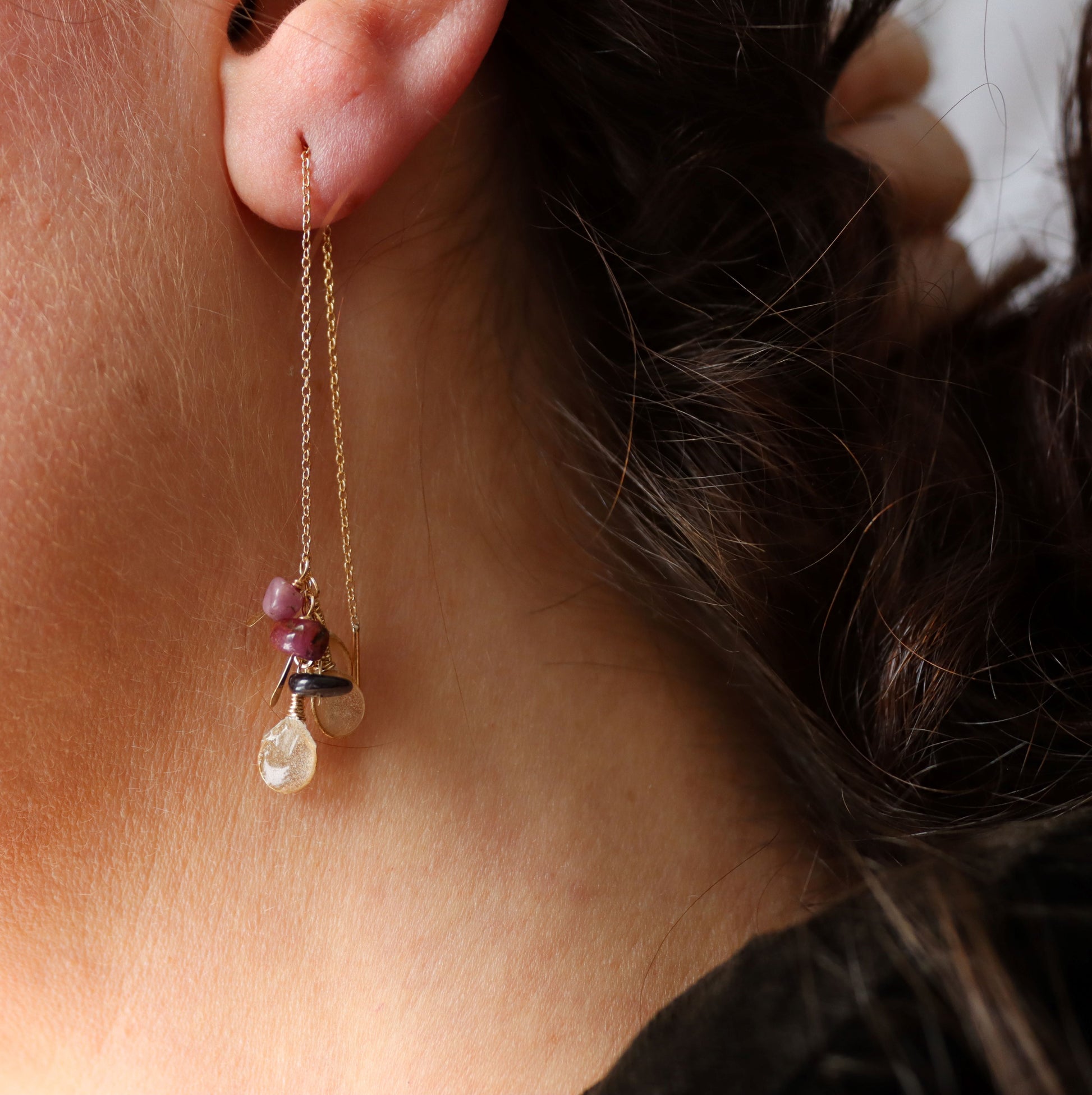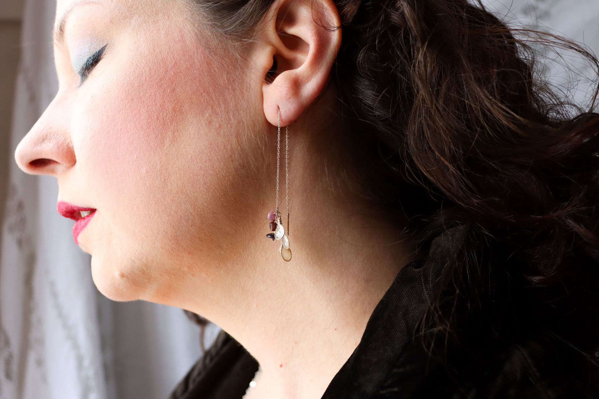 Wear the threaders pulled halfway through as shown on the model, or pull the cluster all the way up to your earlobe, or stitch the threader back through your ear or into a second piercing to make a stitch.