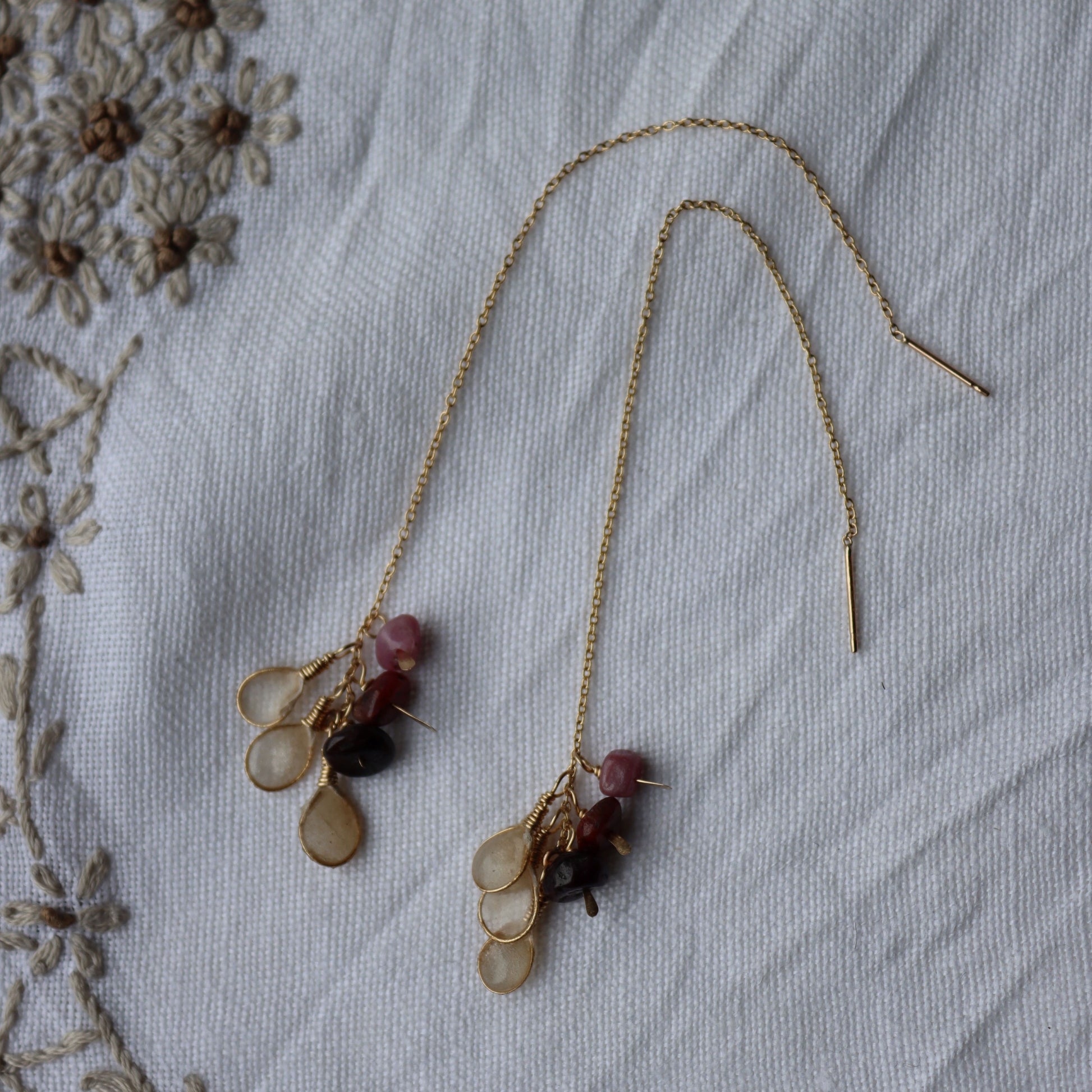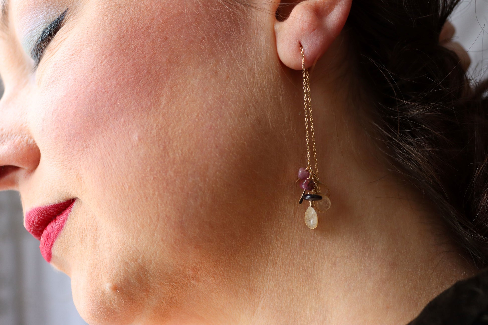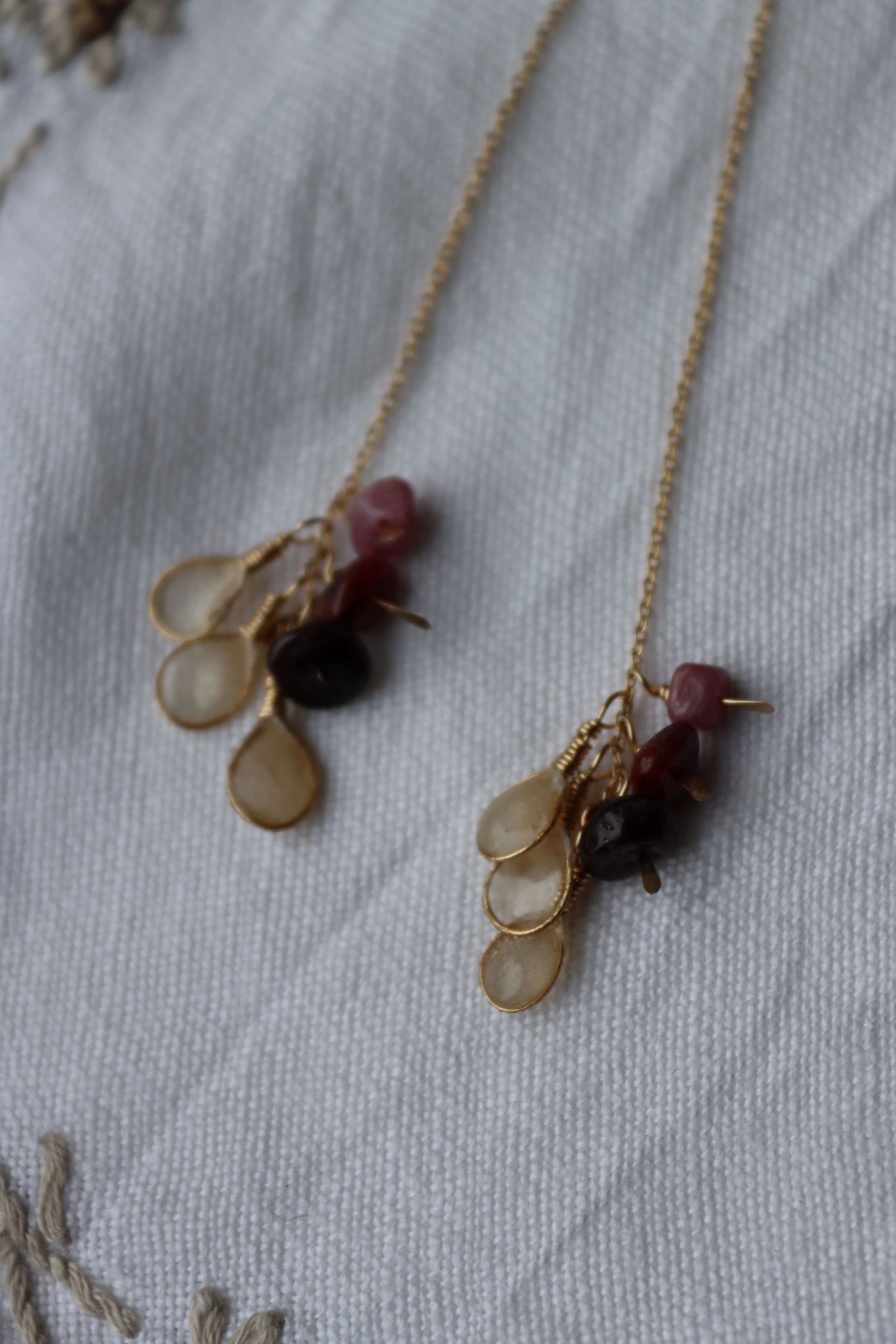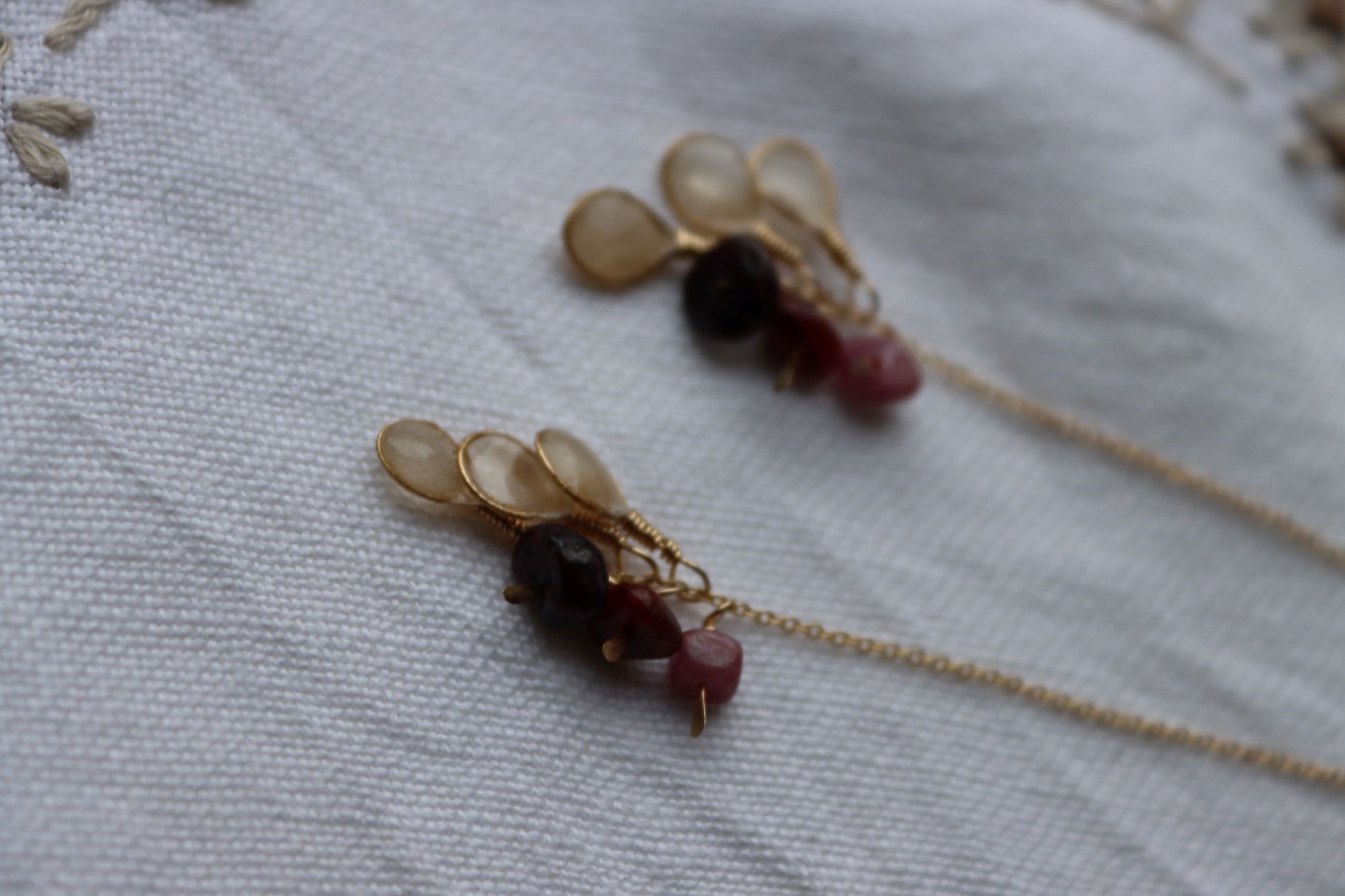 14k gold threader earrings, with an ombre stack of polished raw rubies, and dewdrops made of 14k gold filled loops, filled with ivory handmade paper that has been waterproofed and hardened.