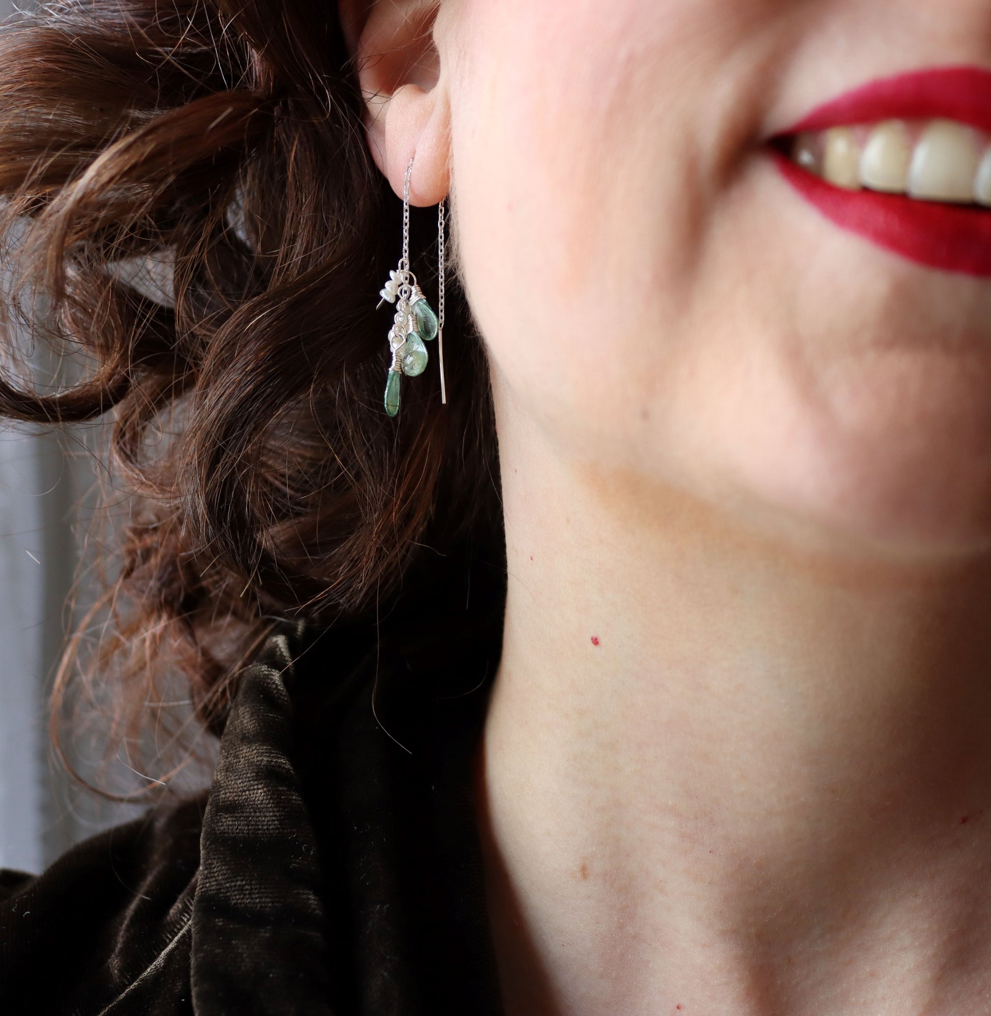 Wear the threaders pulled halfway through as shown on the model, or pull the cluster all the way up to your earlobe, or stitch the threader back through your ear or into a second piercing to make a stitch.