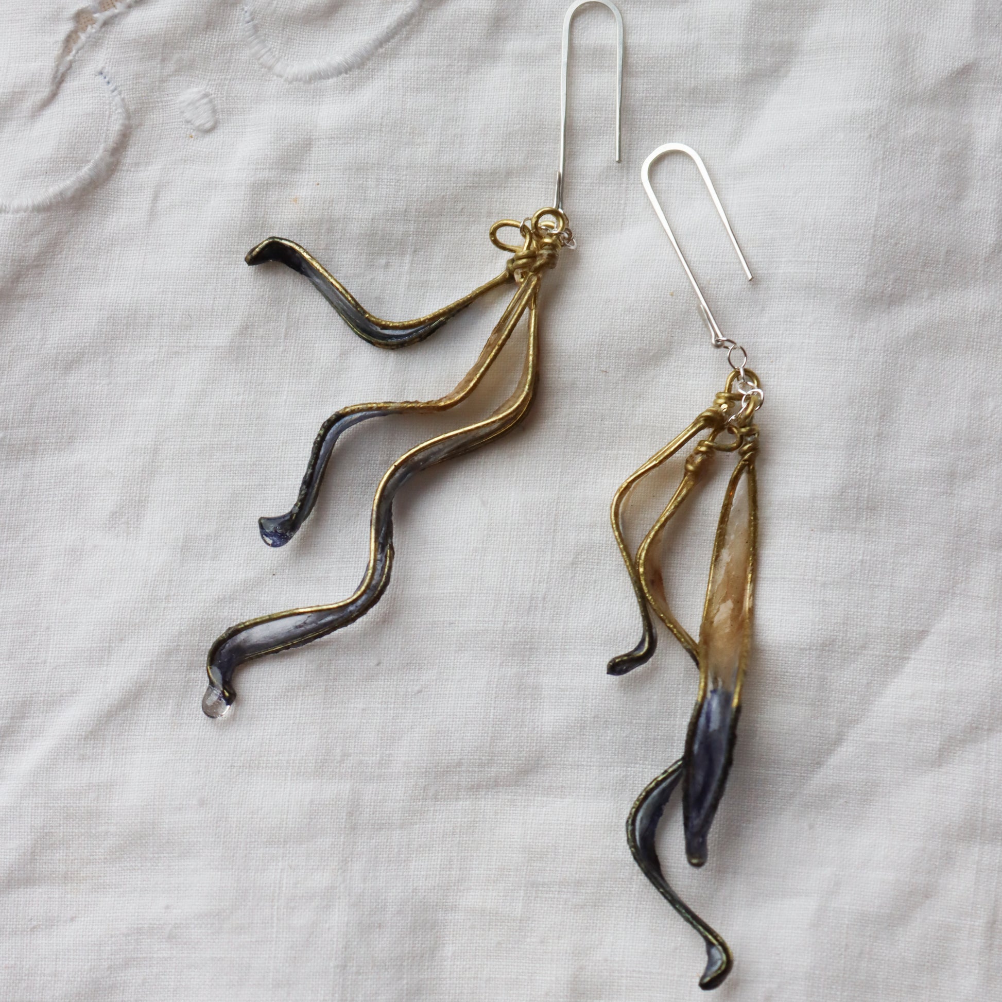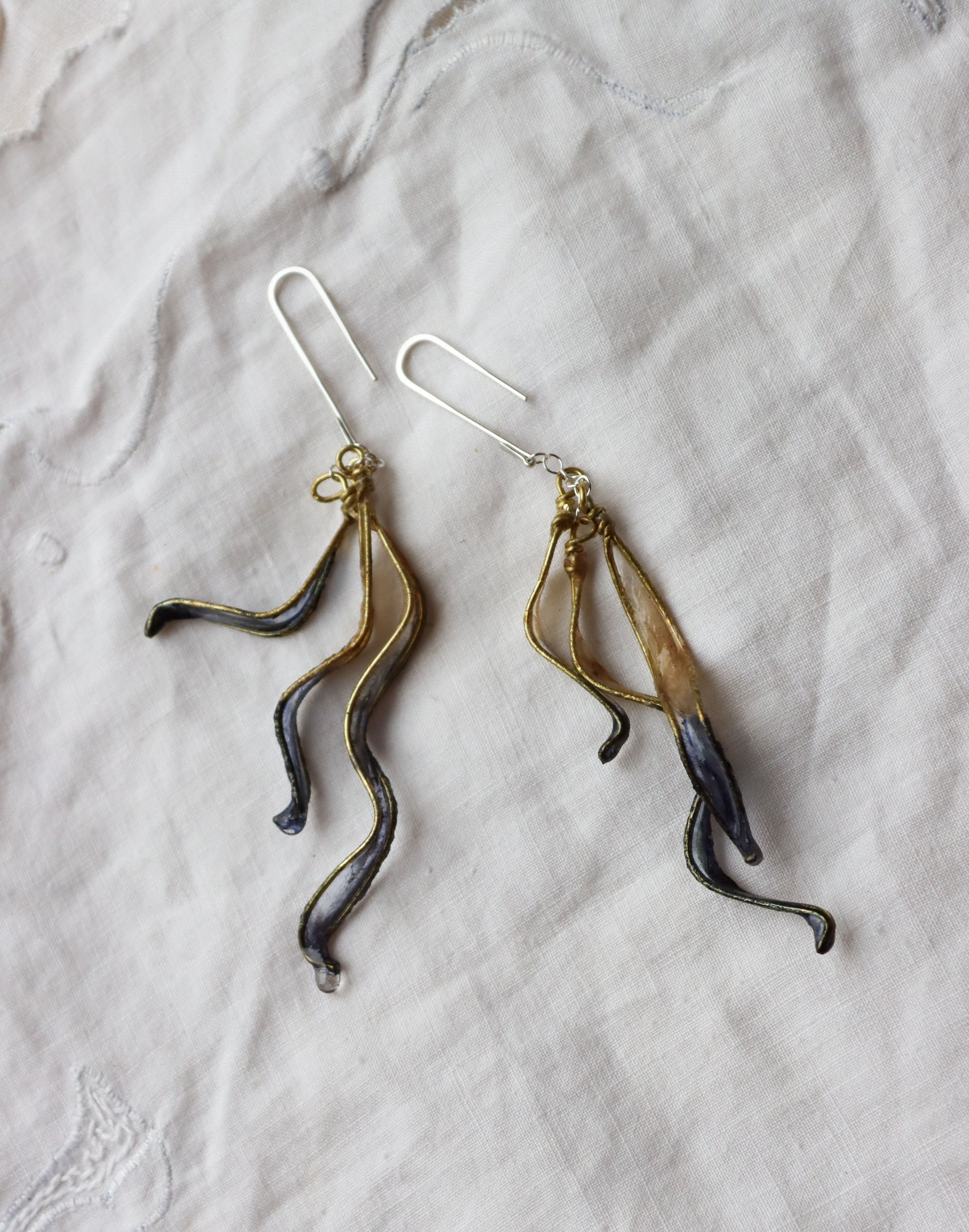 Long wavy petals made from brass, filled with handmade paper, dyed indigo, and sealed with resin to make the paper waterproof and durable.