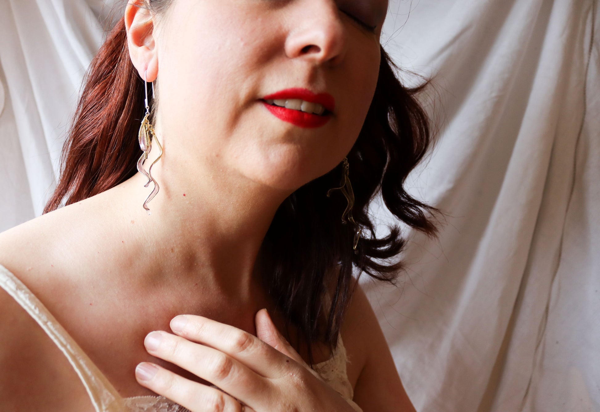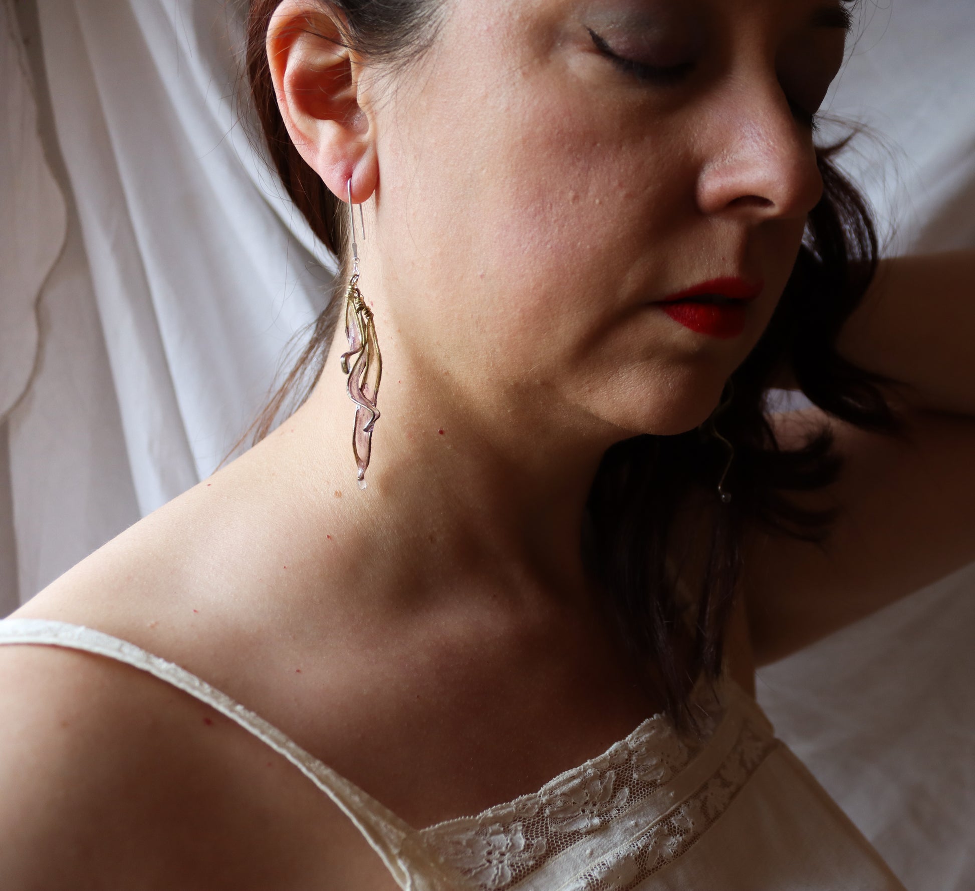 Long wavy petals made from brass, filled with handmade paper, dyed lavender, and sealed with resin to make the paper waterproof and durable.