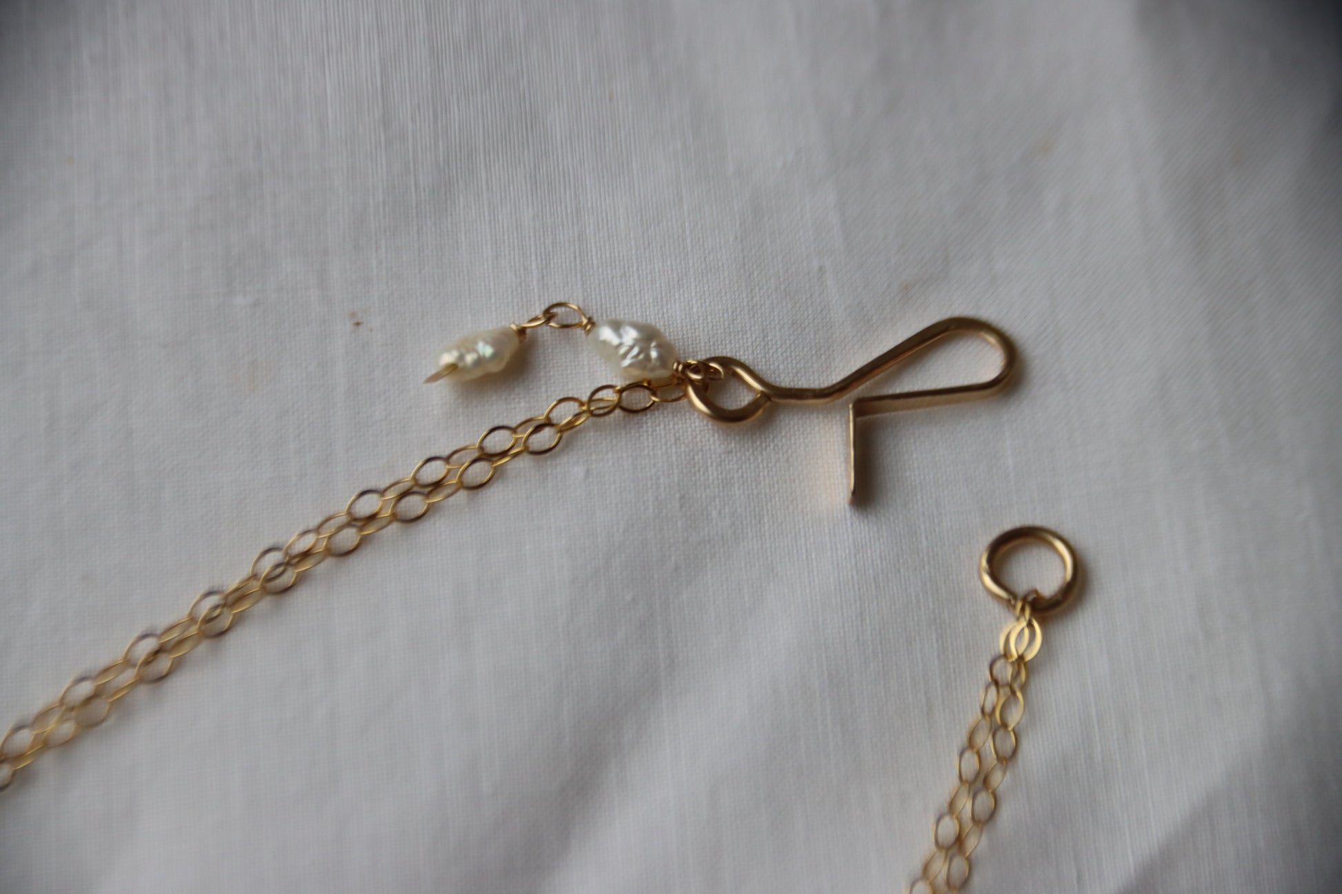 14k gold filled chain and clasp. The clasp includes a double drop of freshwater pearls strung on 14k gold filled wire.