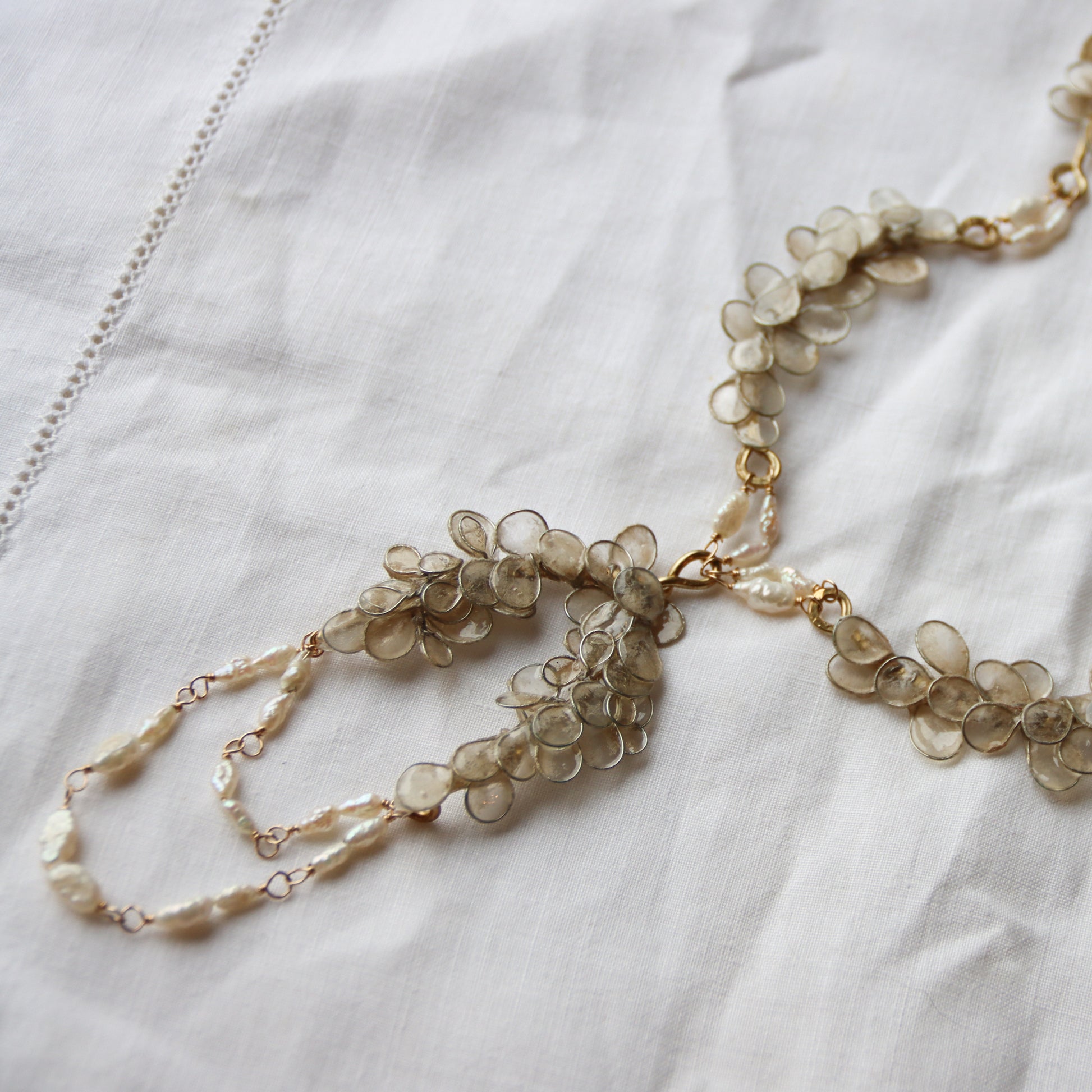 The pendant is flanked by brass garlands with brass and paper petals, connected with freshwater pearl clusters strung on 14k gold filled wire.