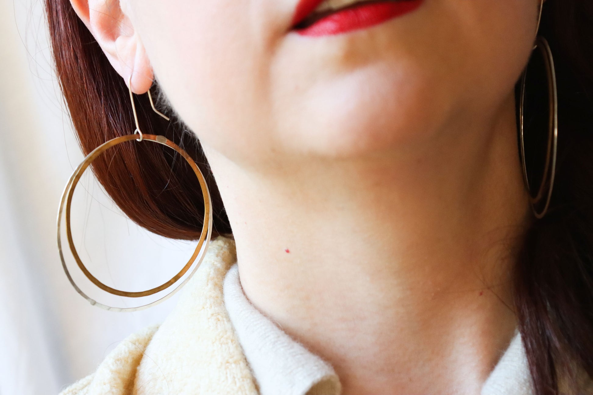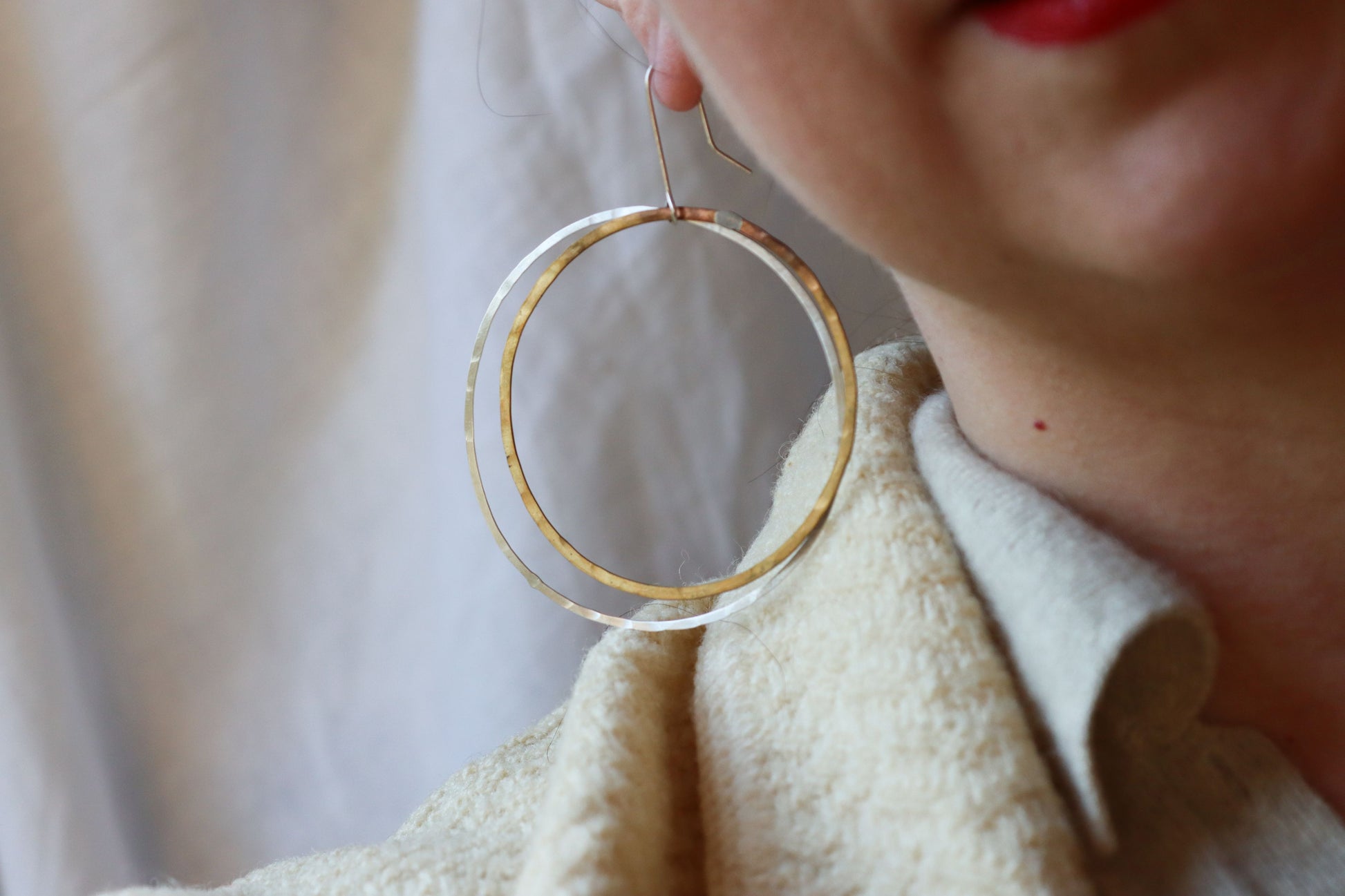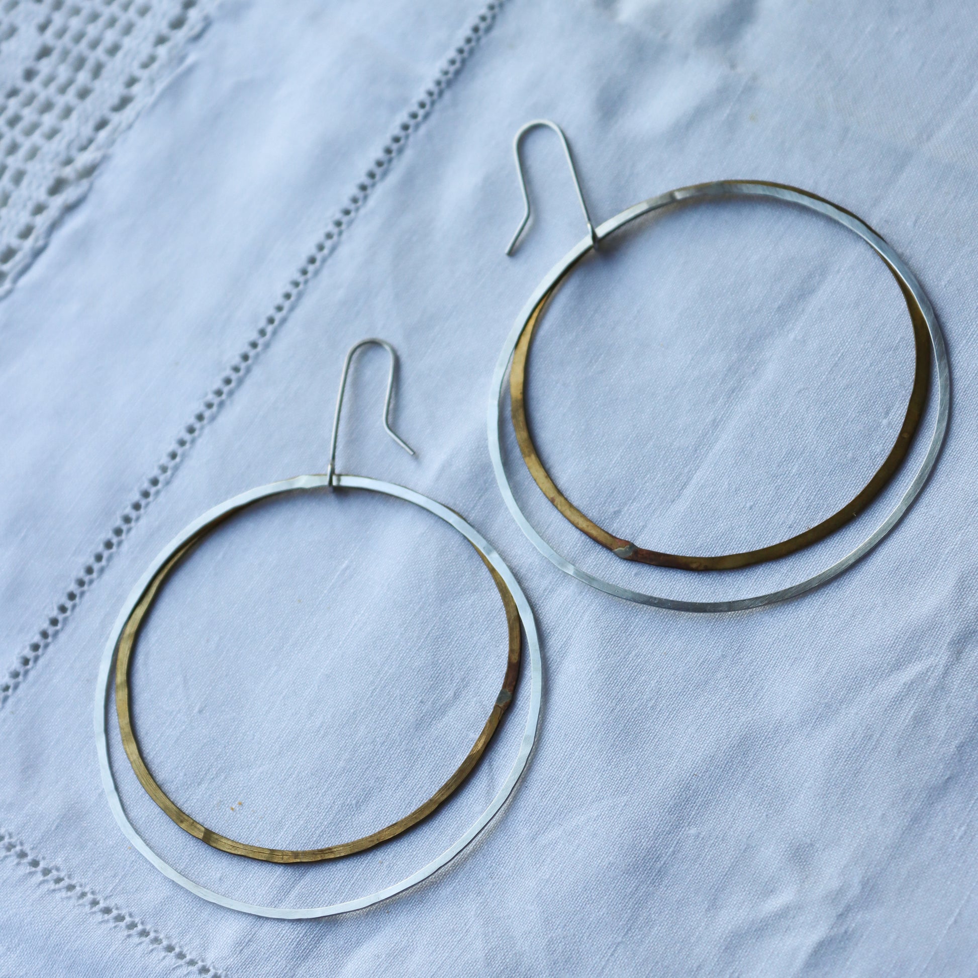 Each earring has a stack of 2 hand-forged circles, one in sterling silver and one in brass.