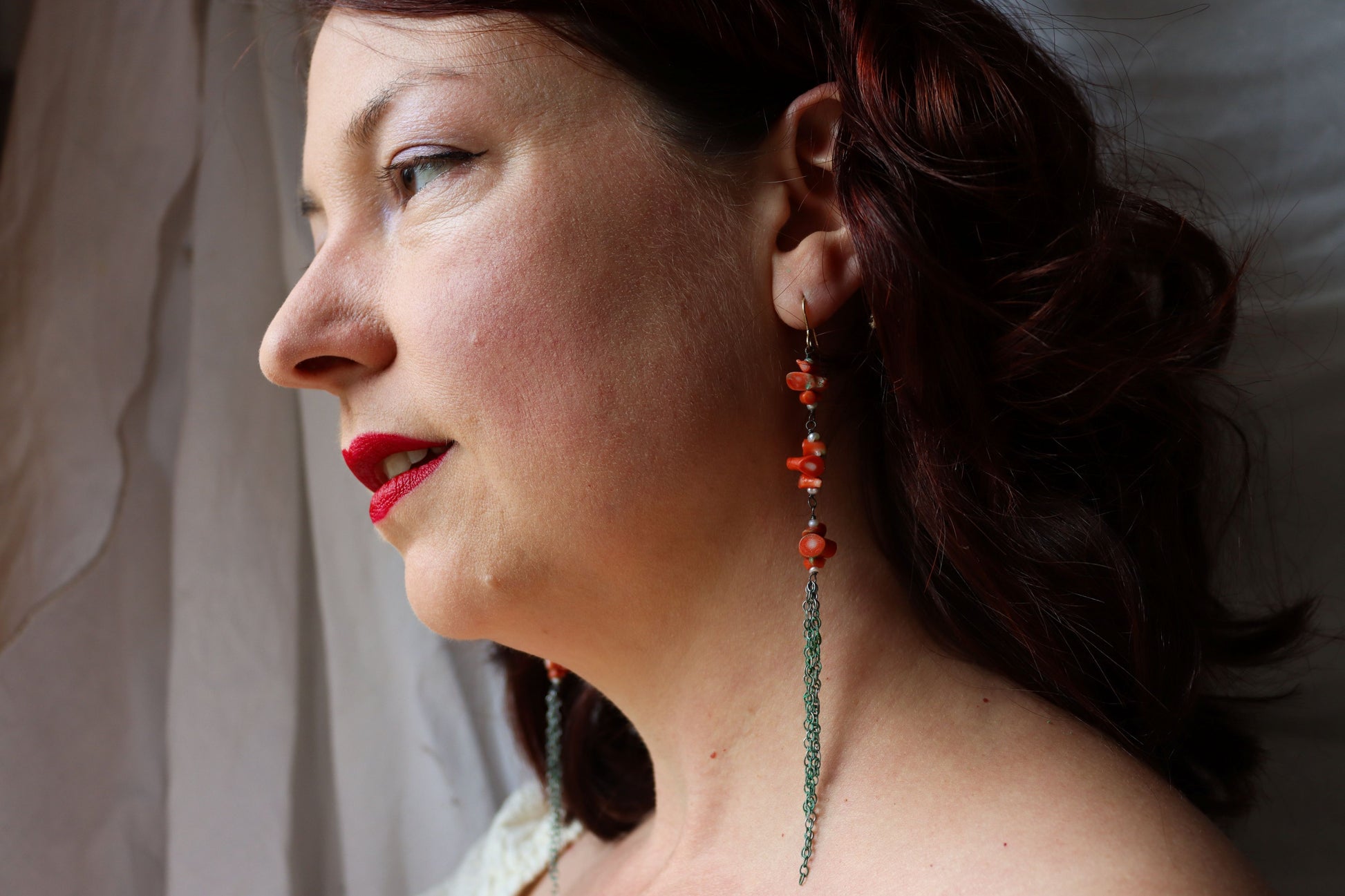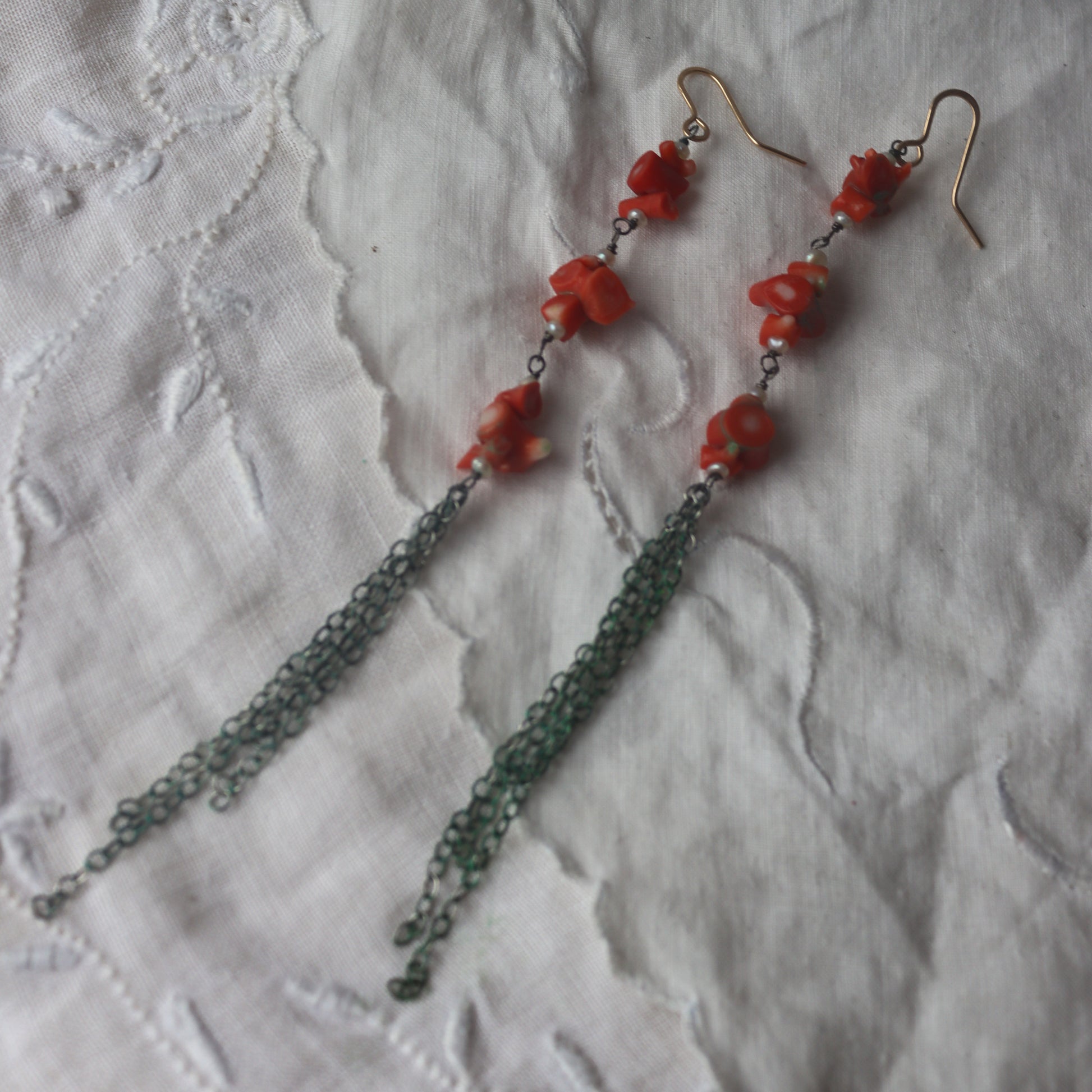 Vintage reclaimed coral and freshwater pearls, strung sterling silver chain with chain tassels. Oxidized to black, with a layer of verdigris patina added. Inspired by ancient objects found in shipwrecks at the bottom of the sea.