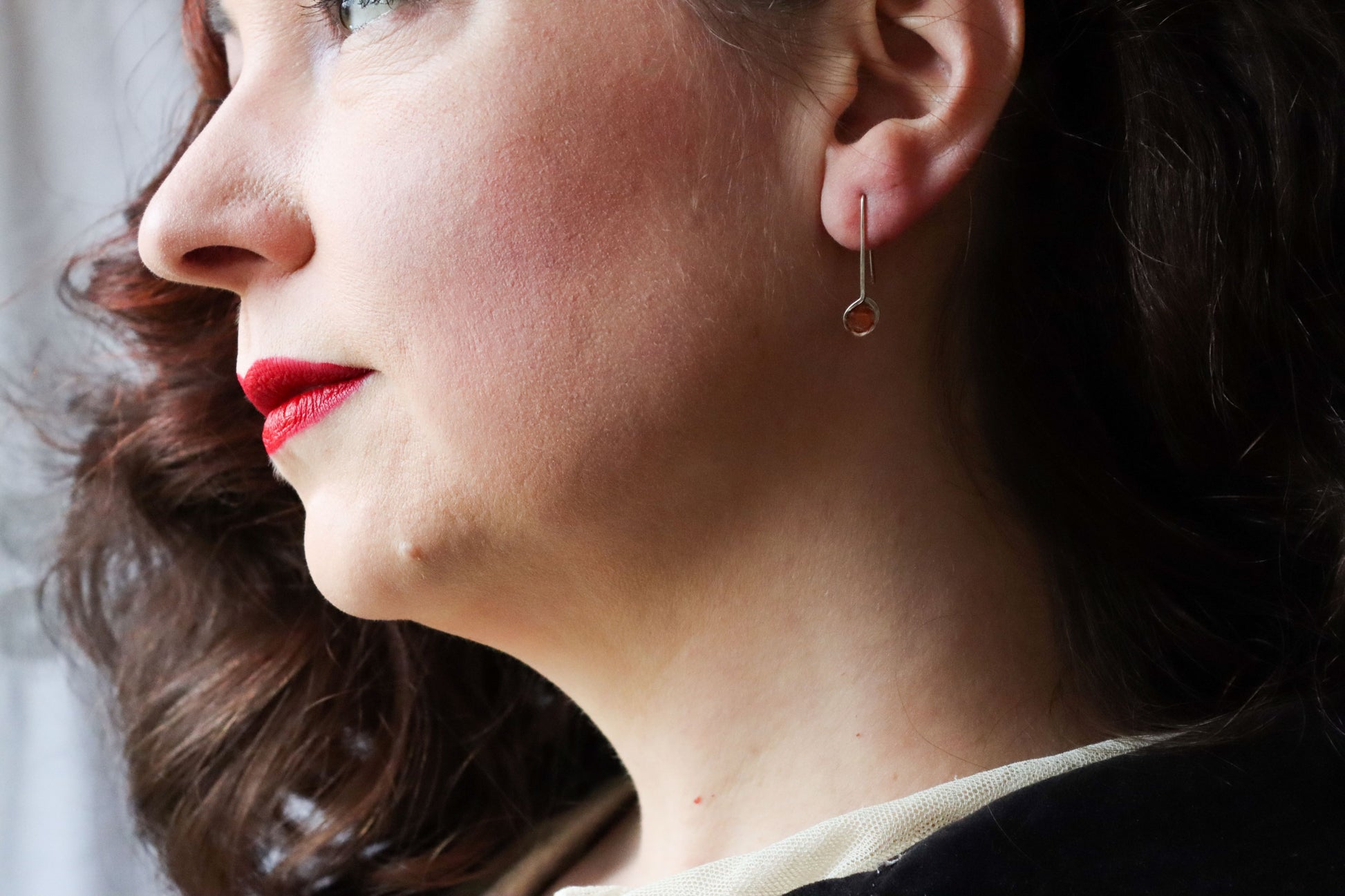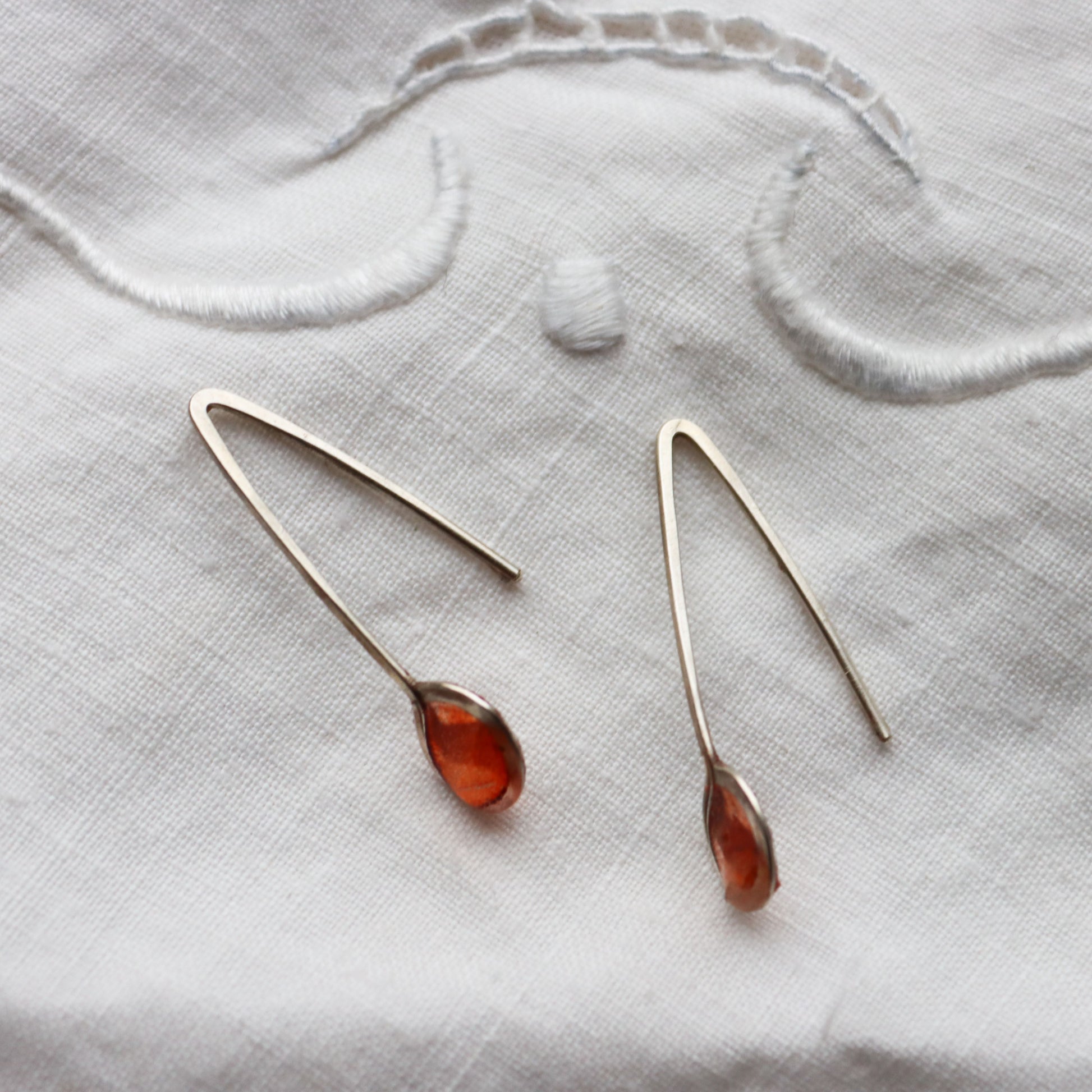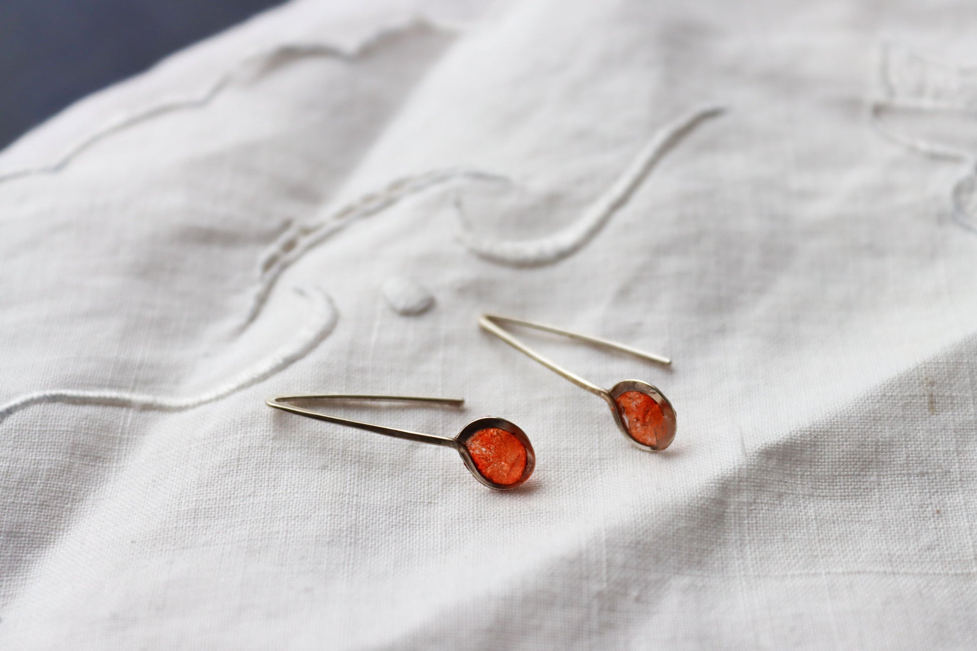 Handmade paper and sterling silver earrings, hand-dyed, and coated in resin to make them waterproof and durable.