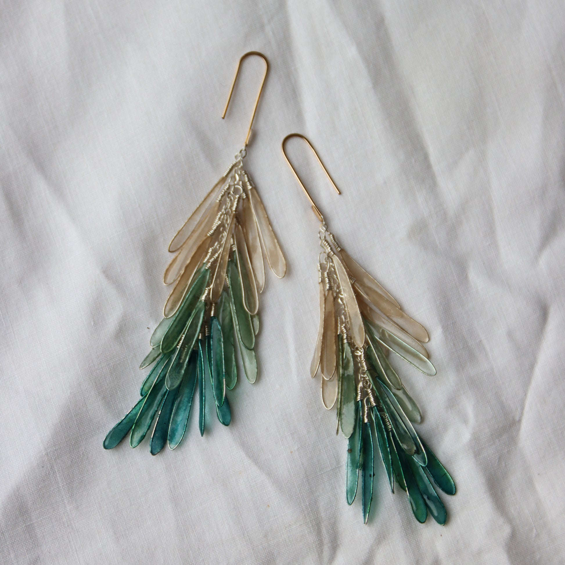 Sterling silver and paper drops, dyed shades of evergreen, pale green, and ivory, and sealed with resin to make the paper waterproof and durable.