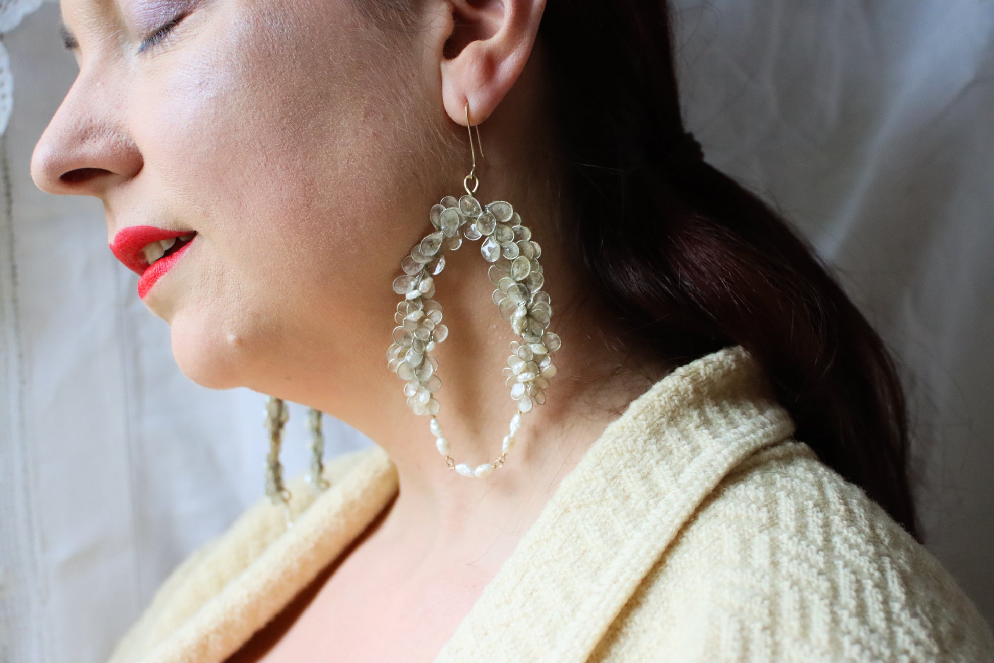 Hand-forged brass horseshoe shapes, with brass and paper petals, sealed with resin to make the paper waterproof and durable, with scattered freshwater pearls.
