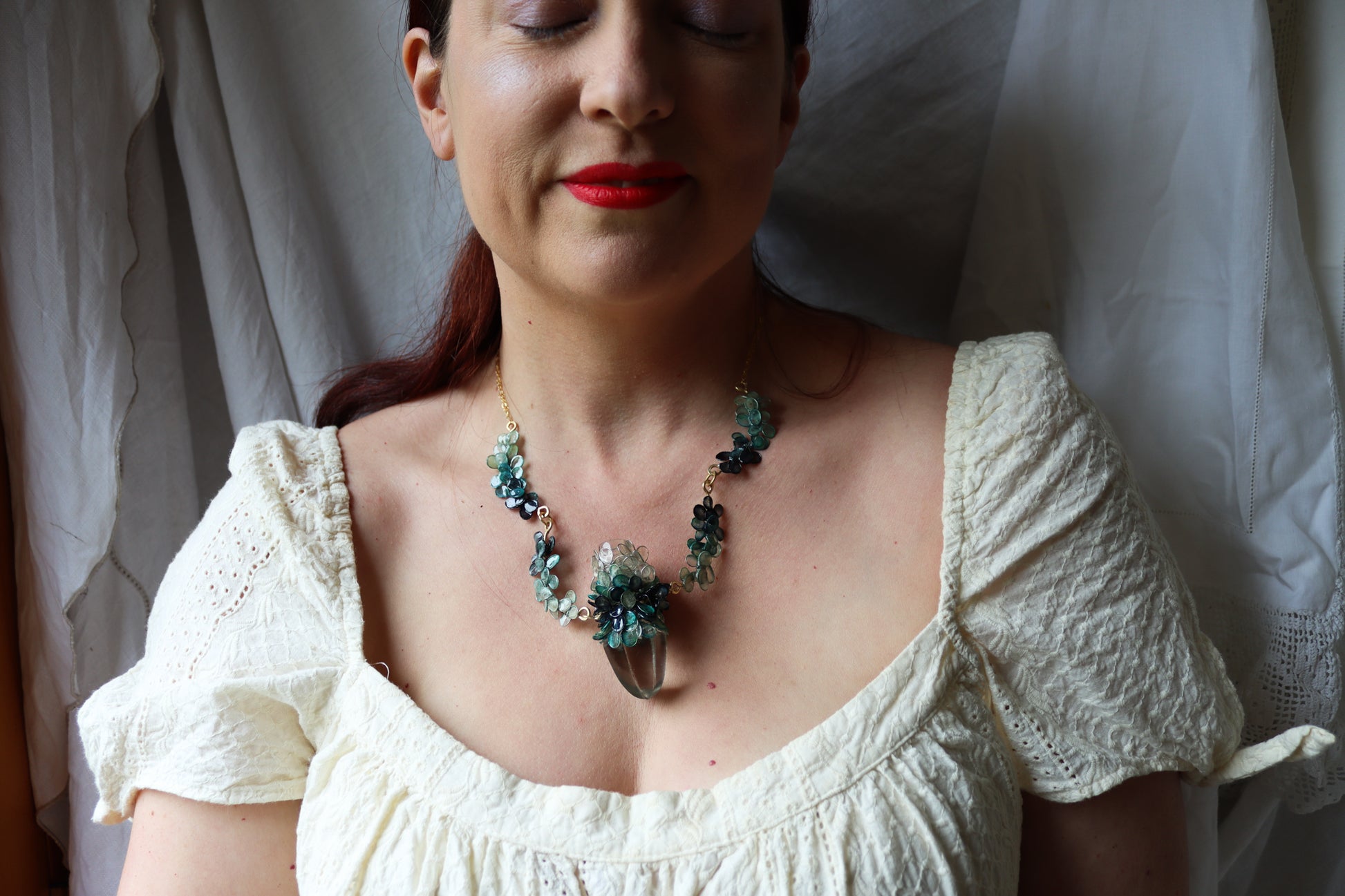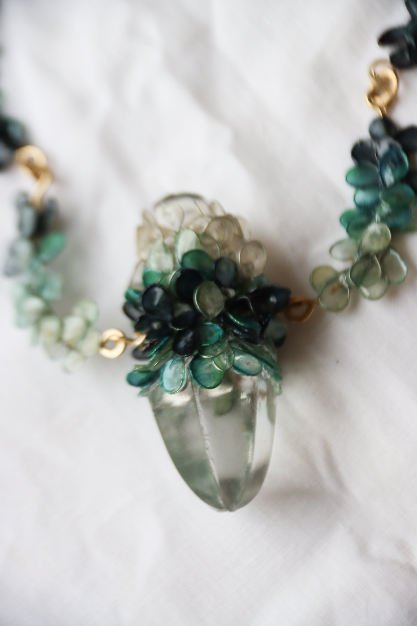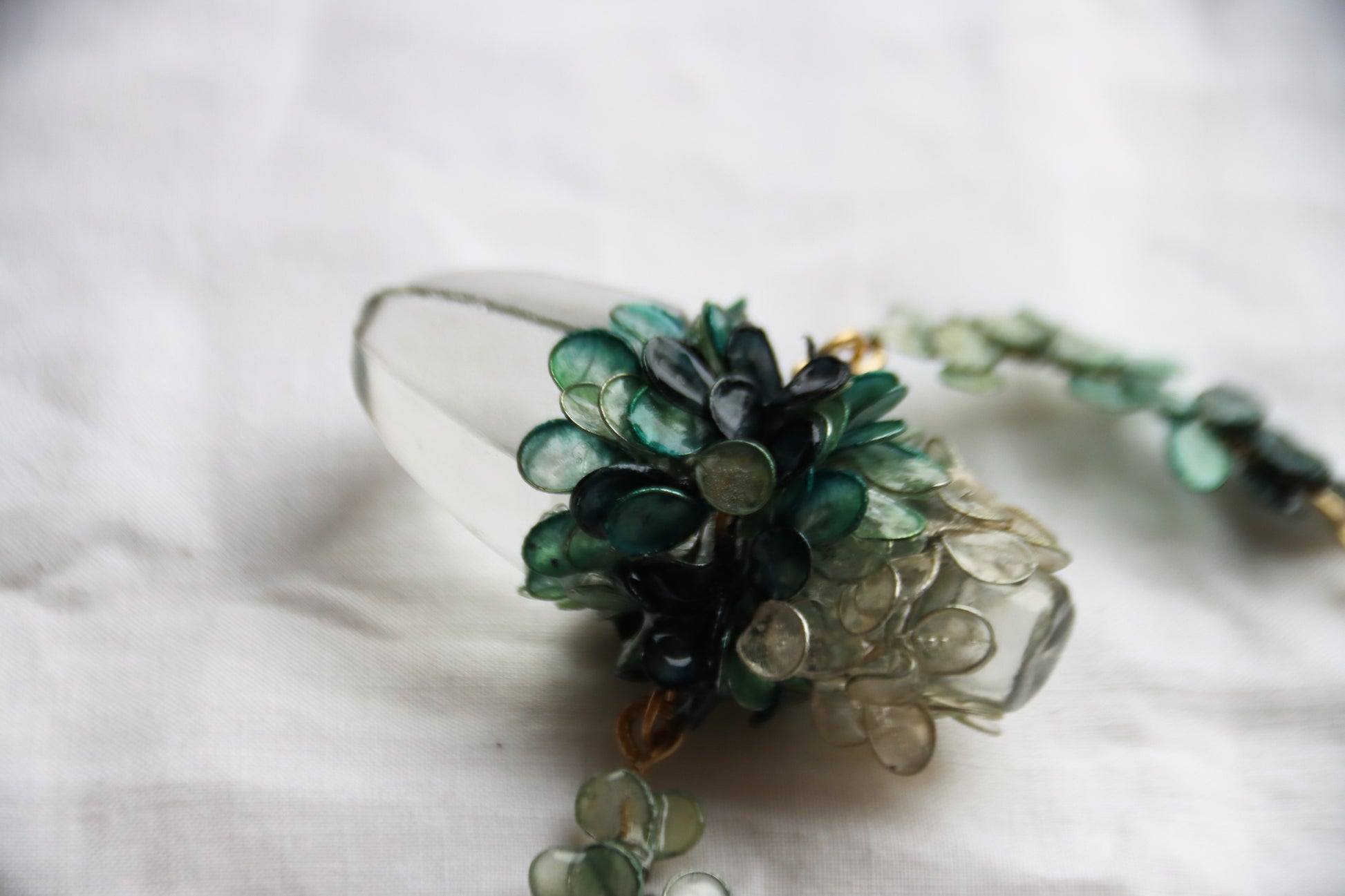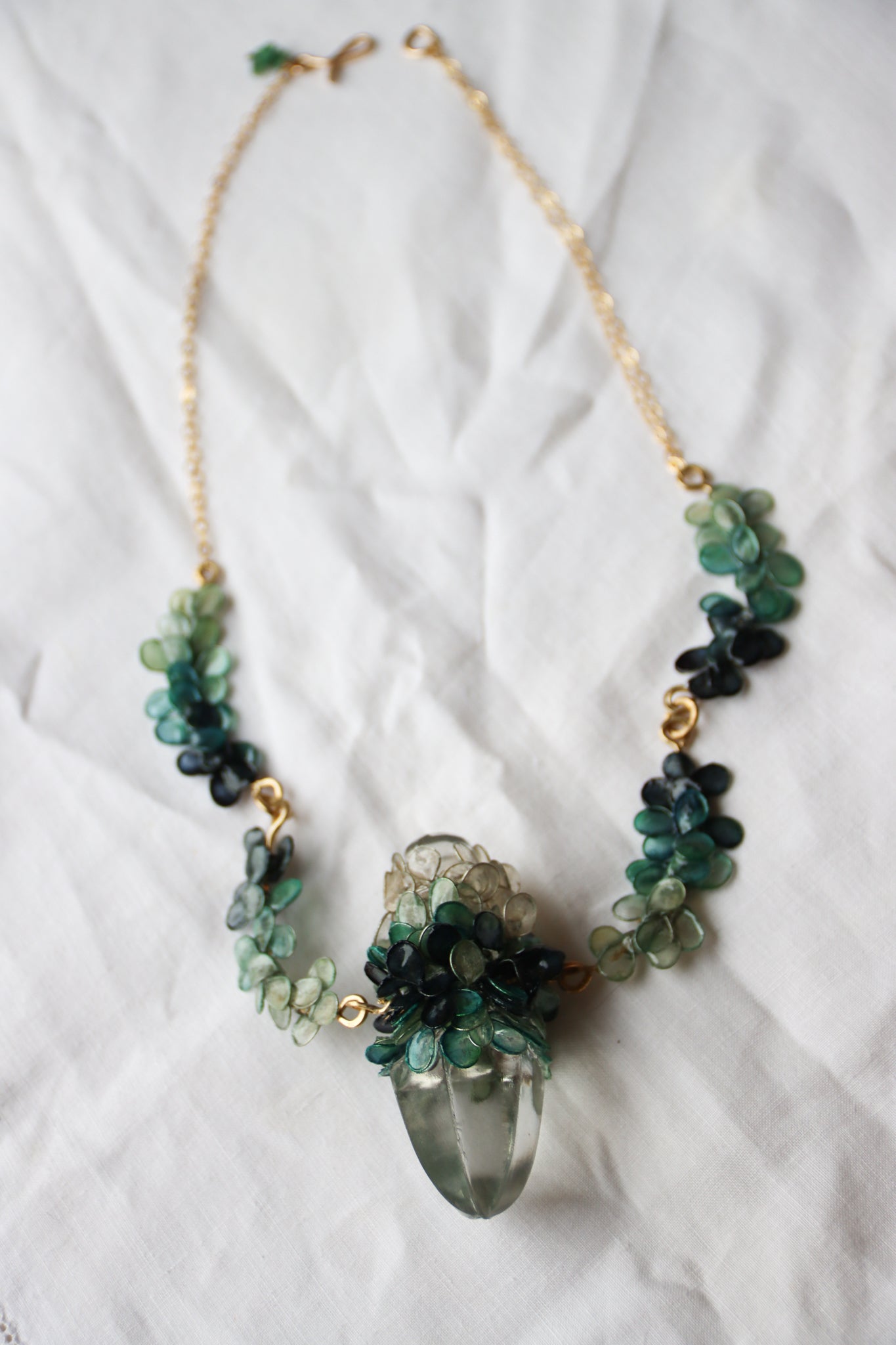 An antique perfume stopper reclaimed as an icy pendant, encircled with leaves and petals made from wire and paper, and dyed the shades of old growth trees covered in snow. The paper has been sealed with resin to make it waterproof and durable.