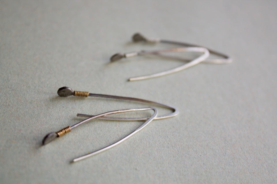 Handmade sterling silver earrings with an ombre oxidized patina, with a tiny wrap of 14k gold filled tendrils.