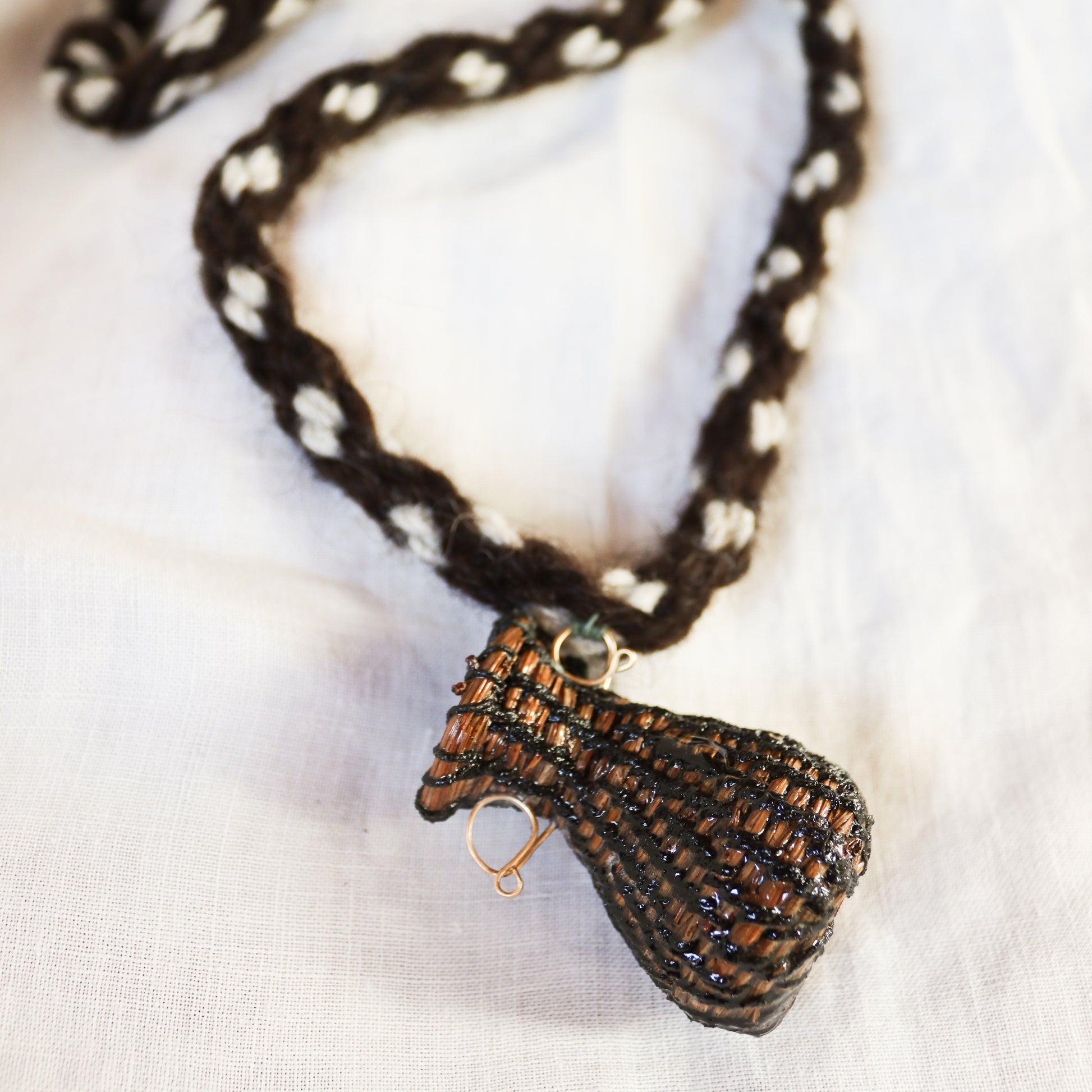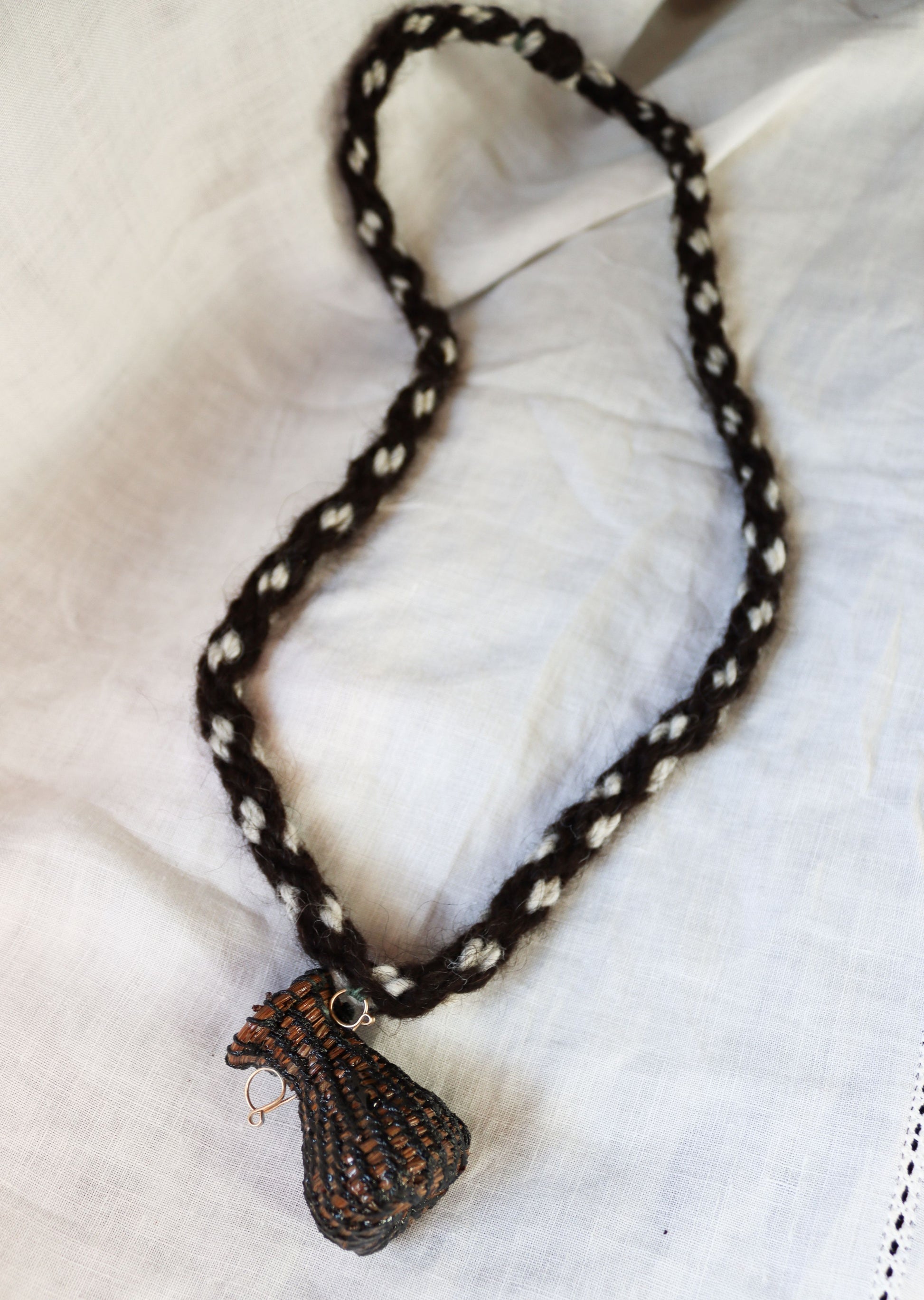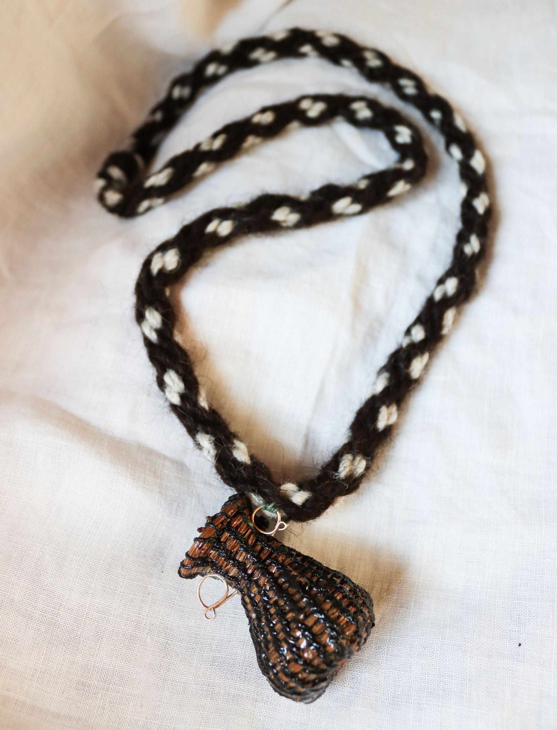The pendant is sewn to a braid, hand-loomed on a Japanese kumihimo braiding loom, from Icelandic wool from the flock at a local farm.