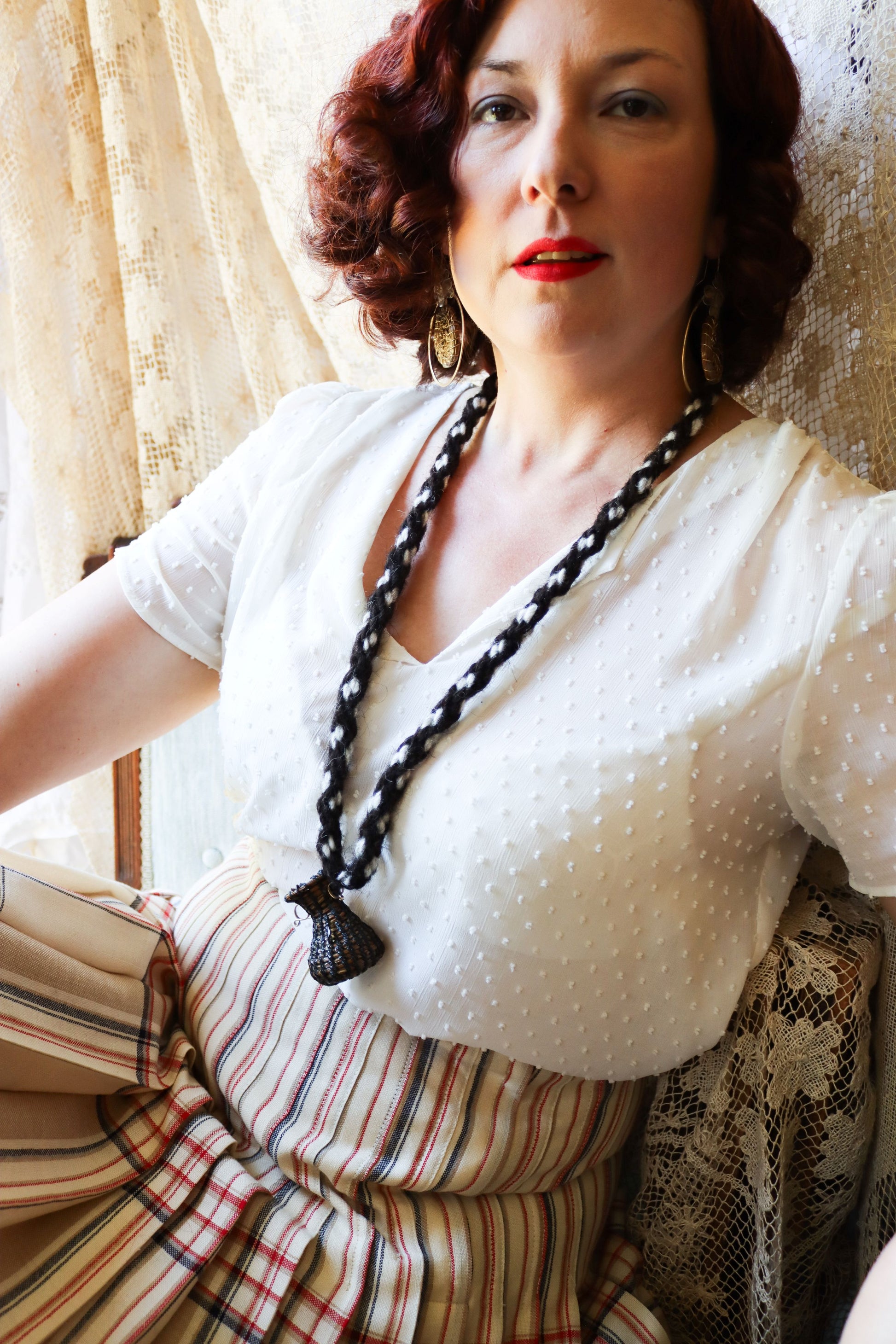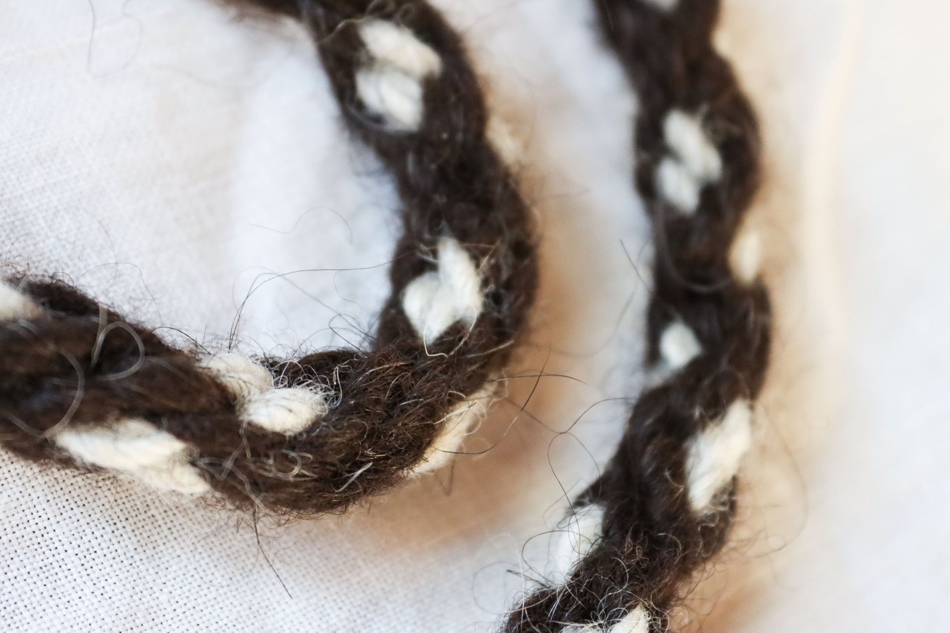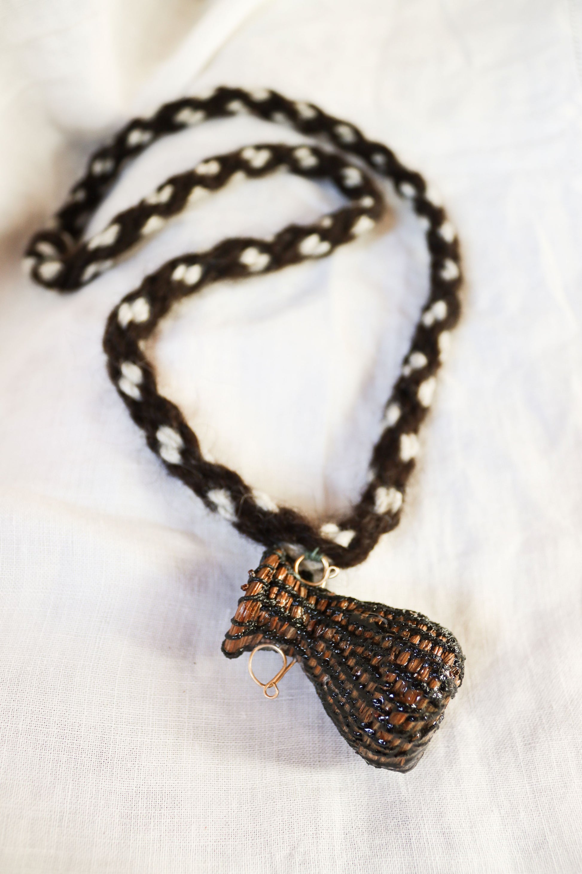 The pendant is sewn to a braid, hand-loomed on a Japanese kumihimo braiding loom, from Icelandic wool from the flock at a local farm.