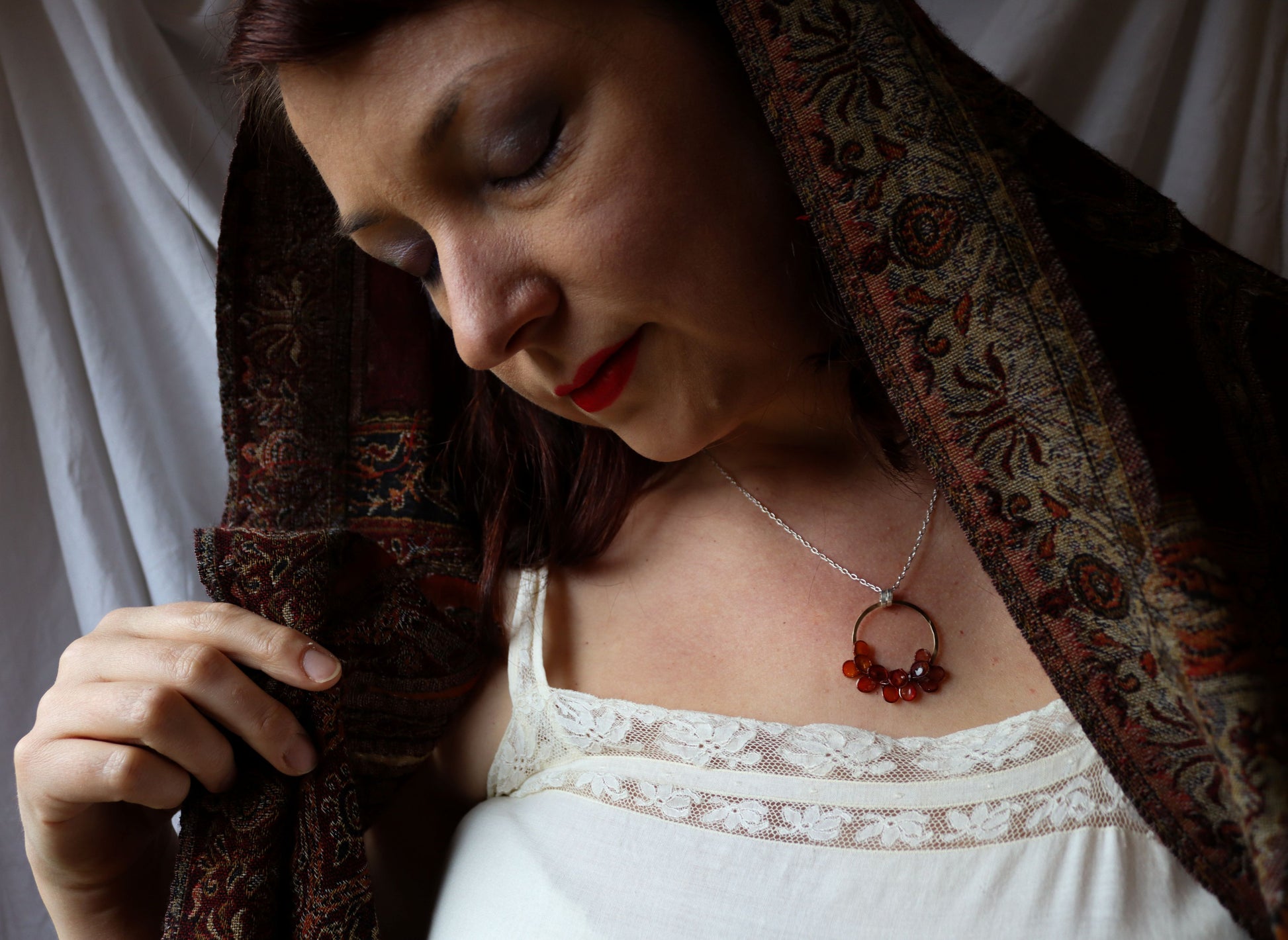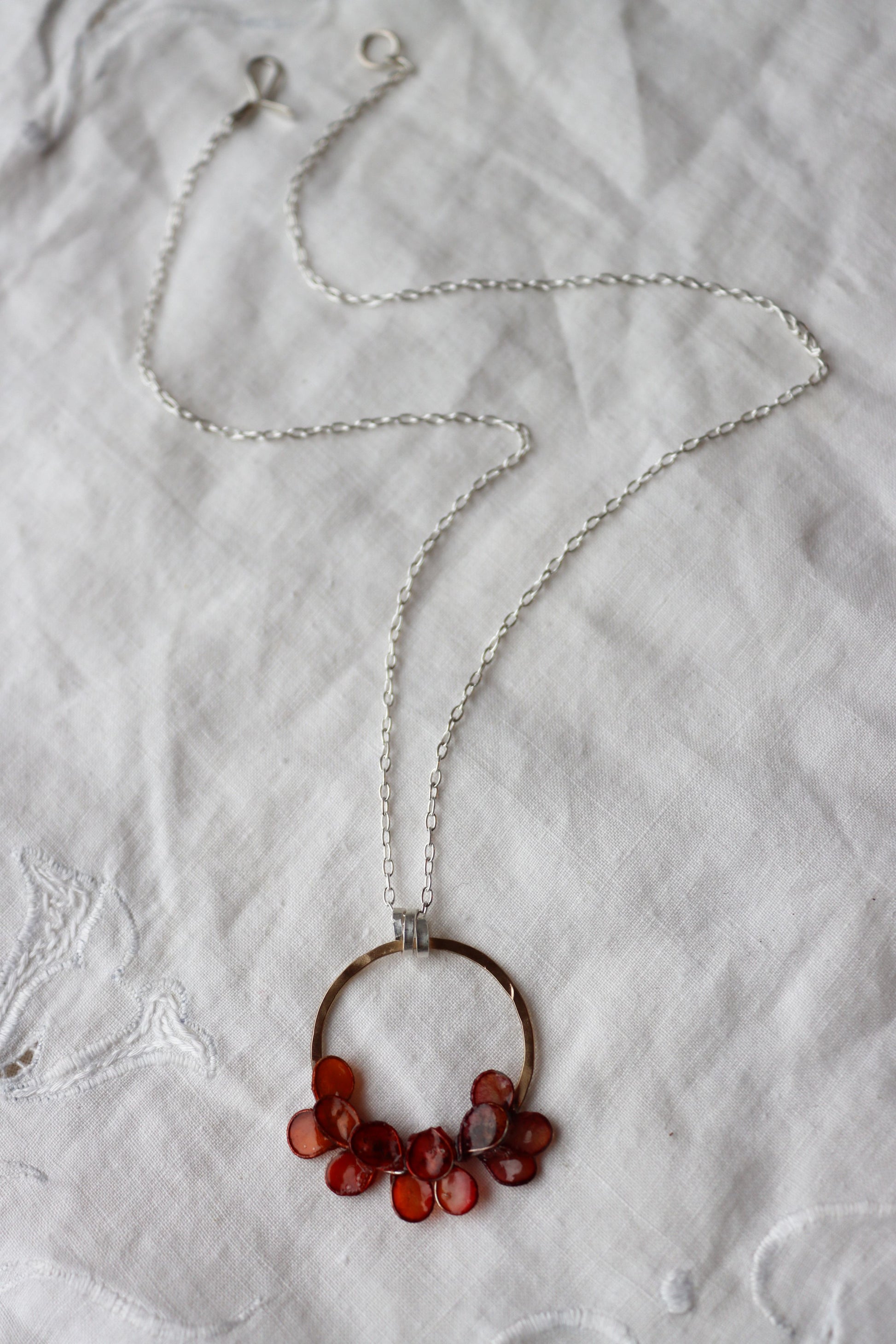 A hand-forged brass circle with a lacquer finish to preserve the shine, with petals made from copper and handmade paper. The paper has been dyed shades burgundy and burnt orange. A layer of resin coats the paper, to make it waterproof and durable.
