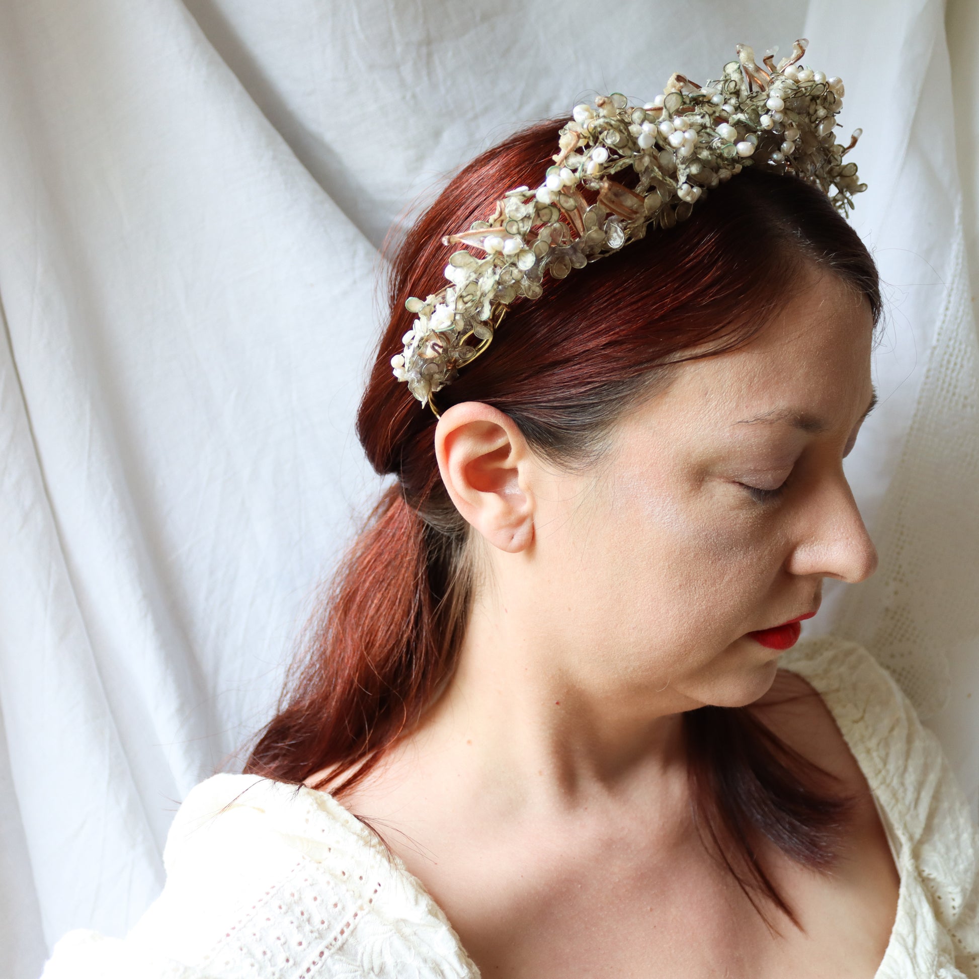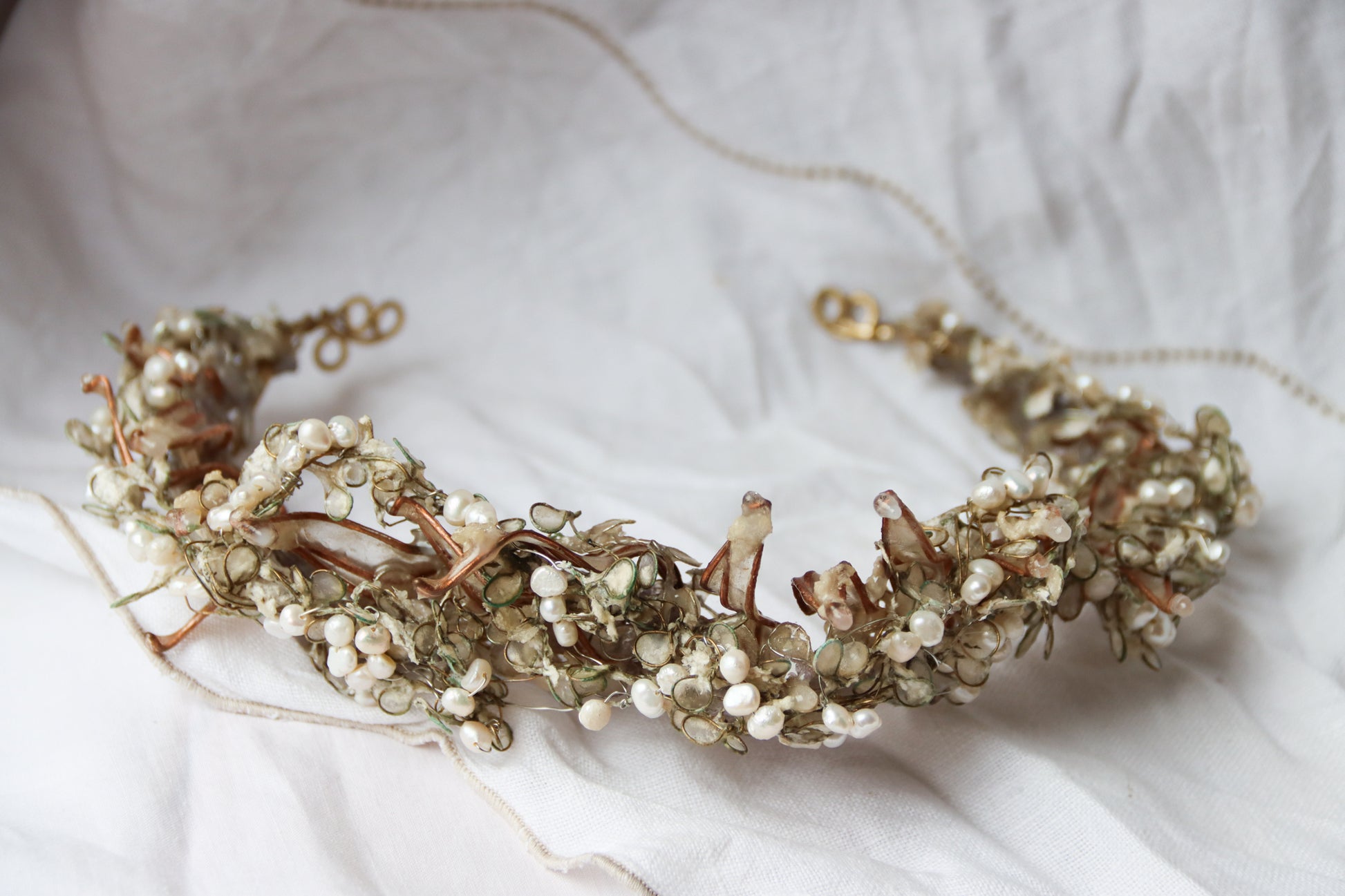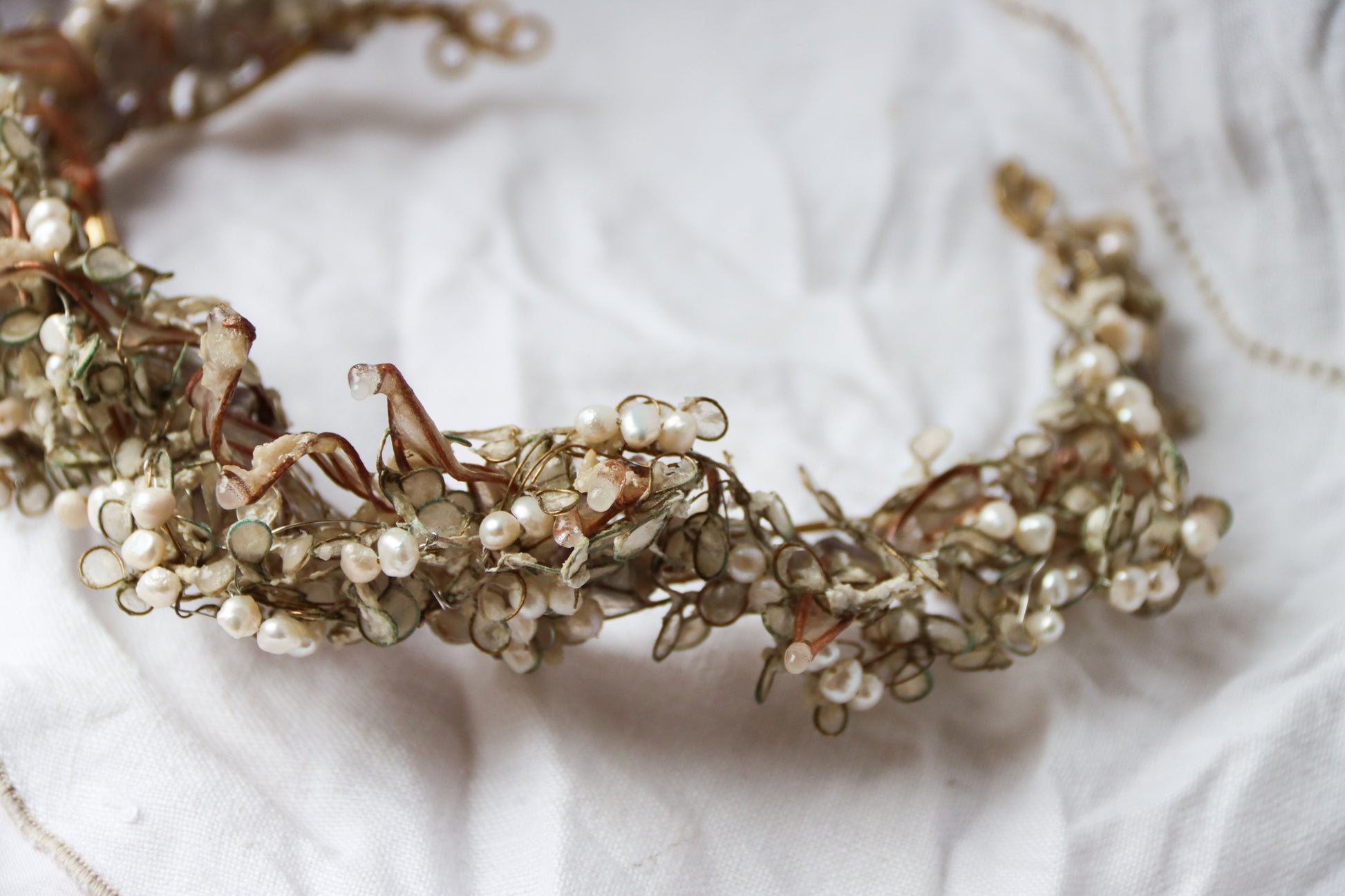 A structure of twining branches made of brass, with a layer of icy copper leaves filled with paper, another layer of dense petals covered in a second layer of ice, two more layers of petals with paper textured to look like fresh snow. Finished with an encrustation of glowing freshwater pearls.