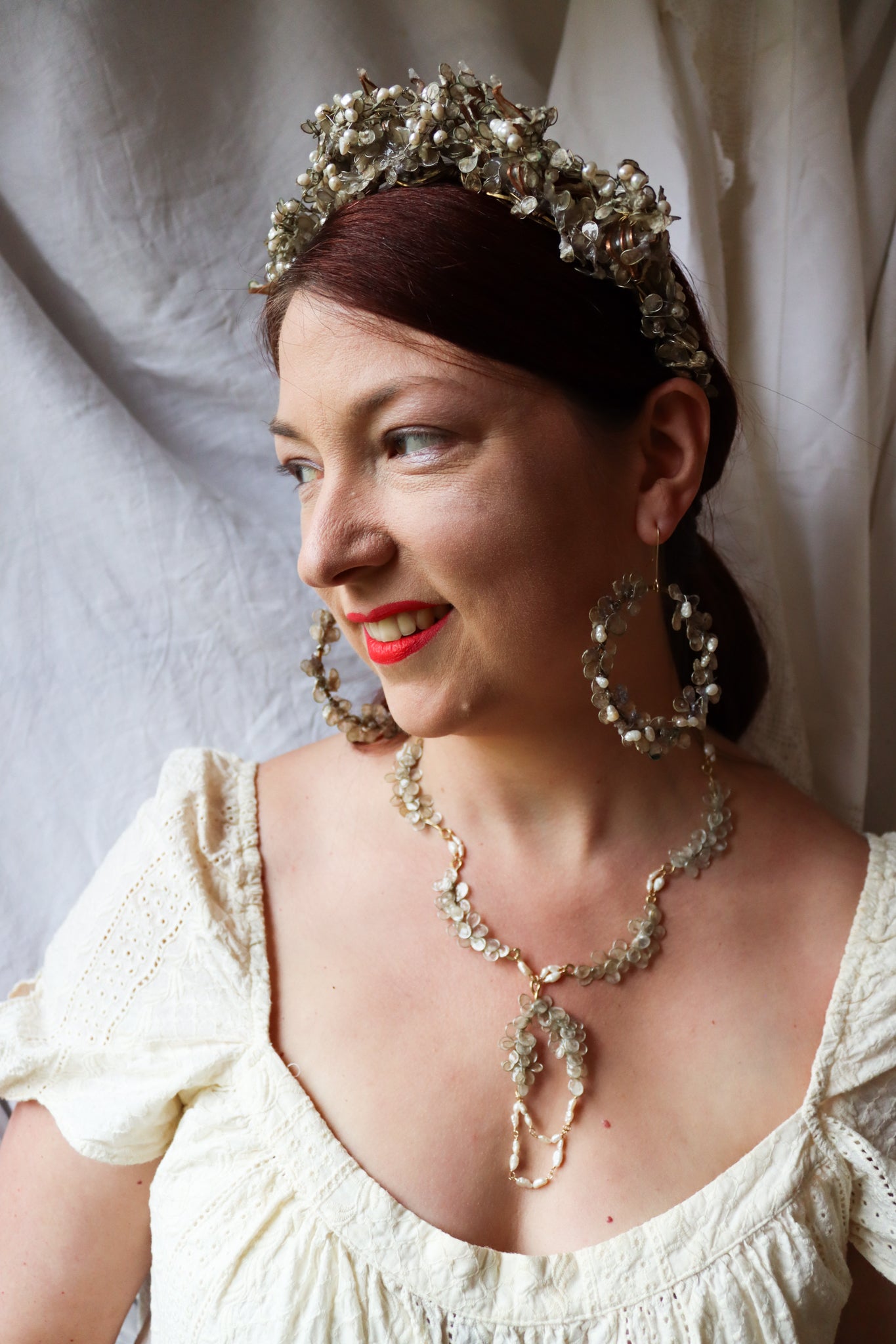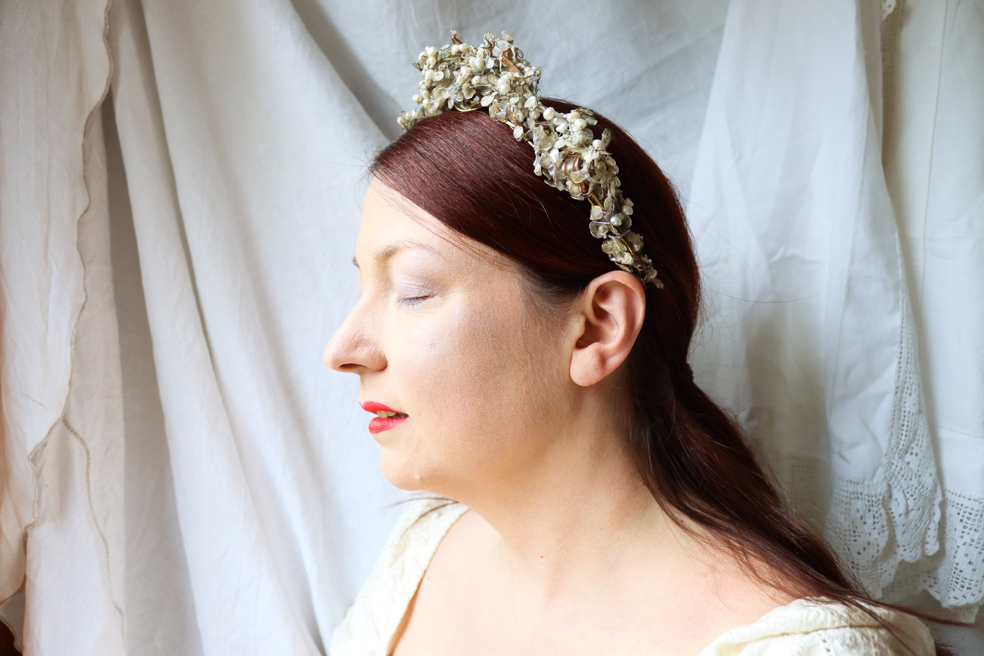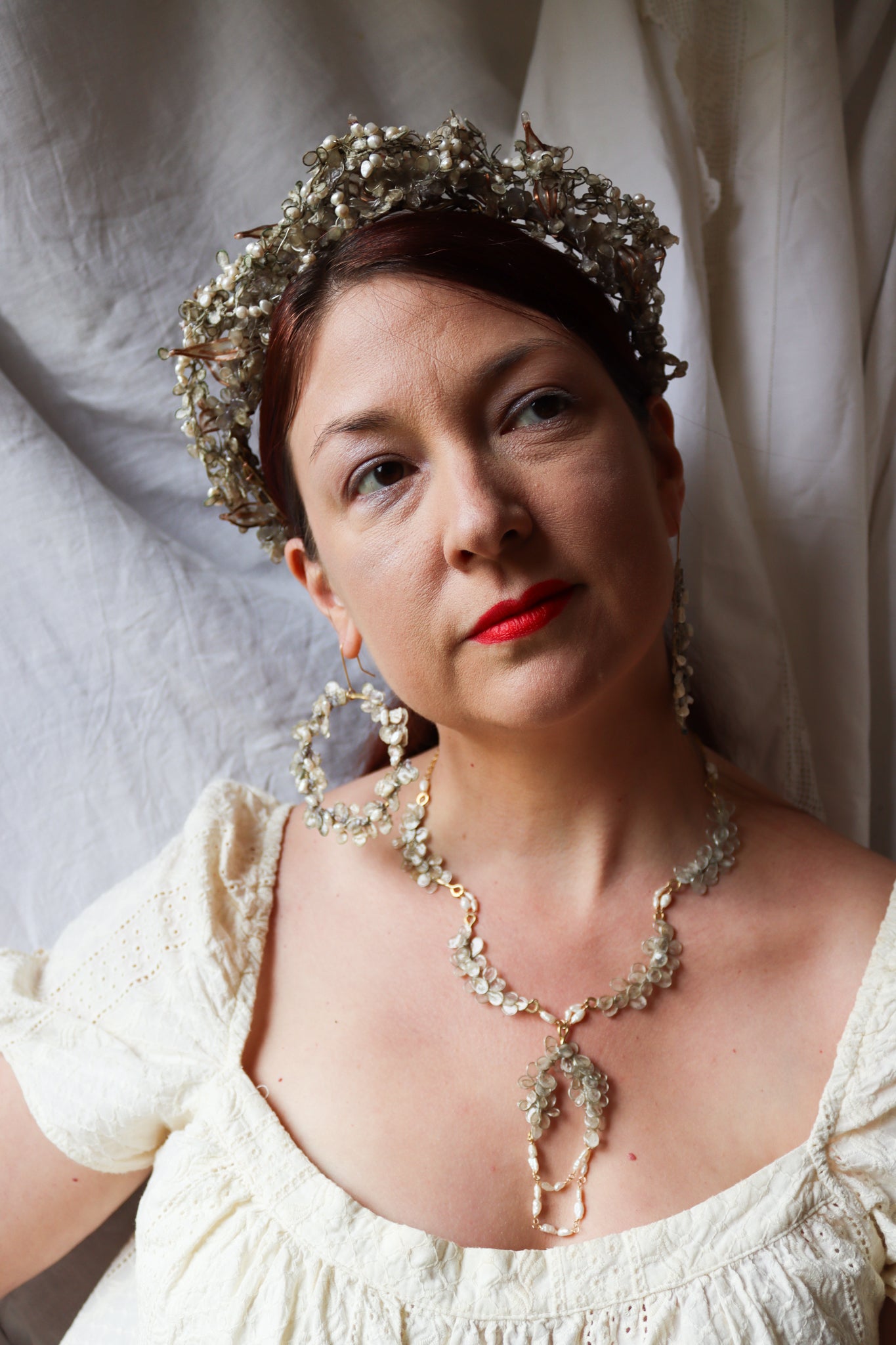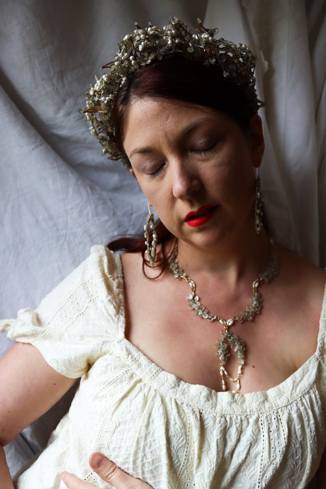 A structure of twining branches made of brass, with a layer of icy copper leaves filled with paper, another layer of dense petals covered in a second layer of ice, two more layers of petals with paper textured to look like fresh snow. Finished with an encrustation of glowing freshwater pearls.