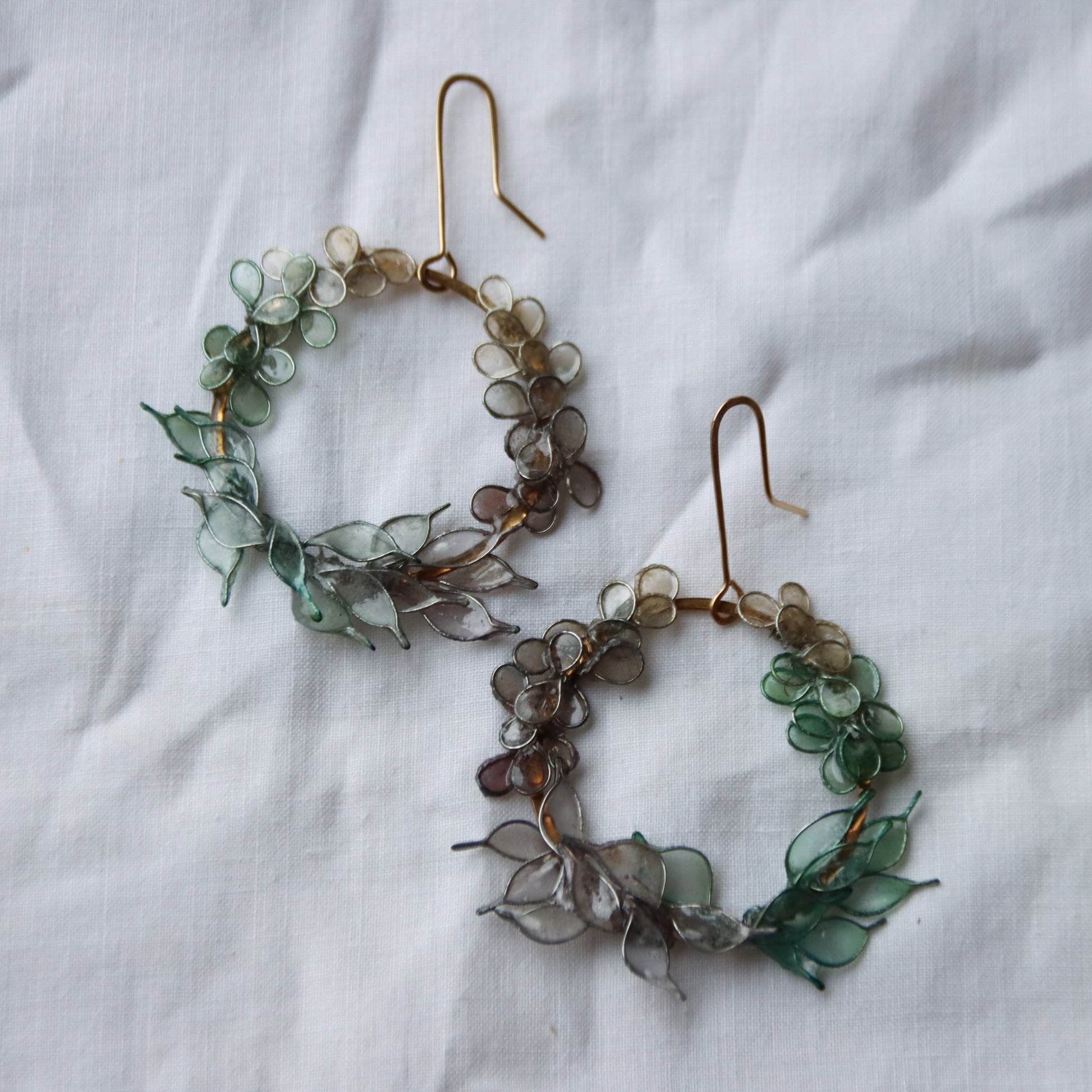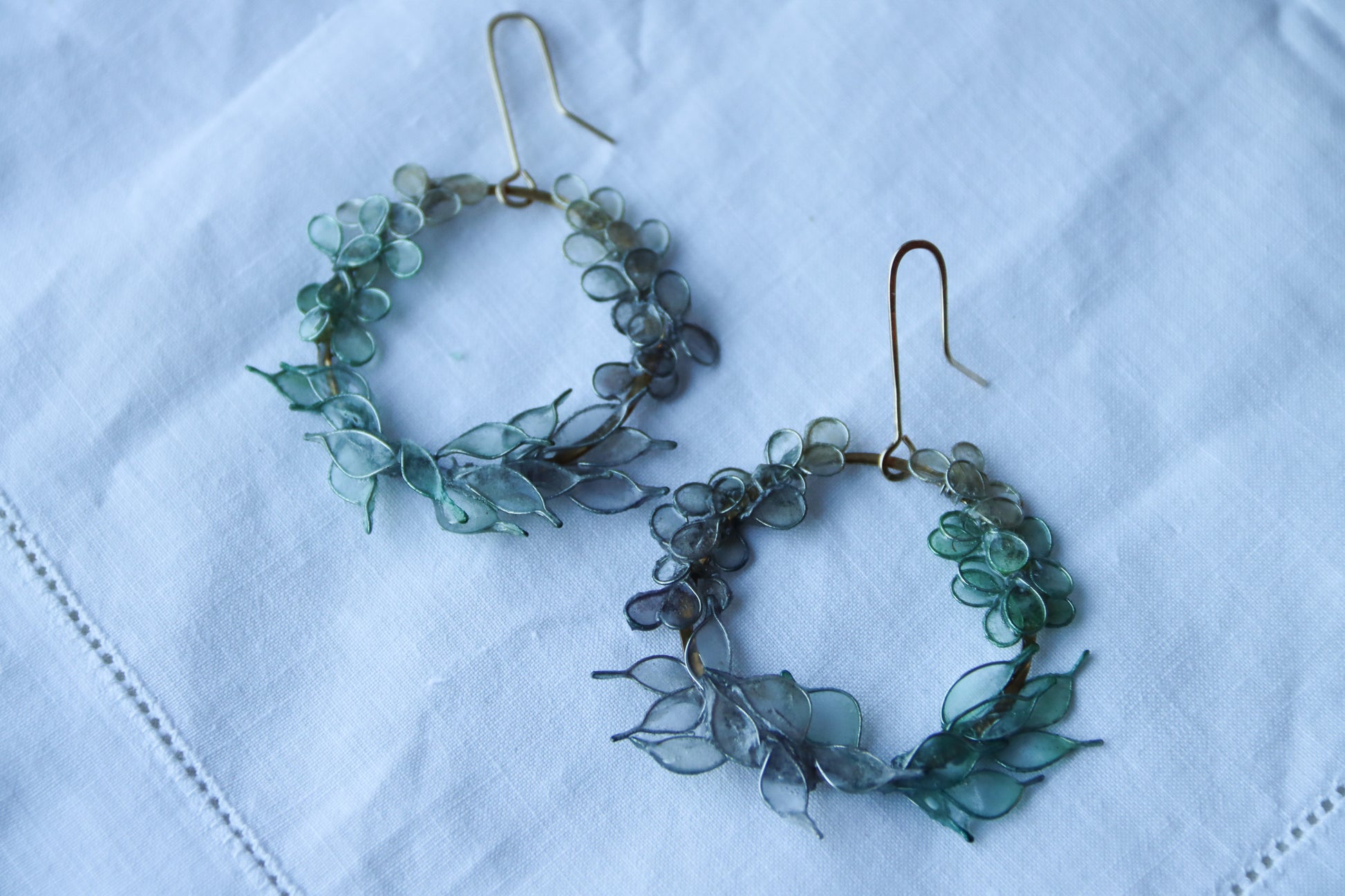 Hand-forged brass circles with leaves and petals made from paper and wire, dyed pale shades of icy blue and green, and sealed with resin to make the paper waterproof and durable.