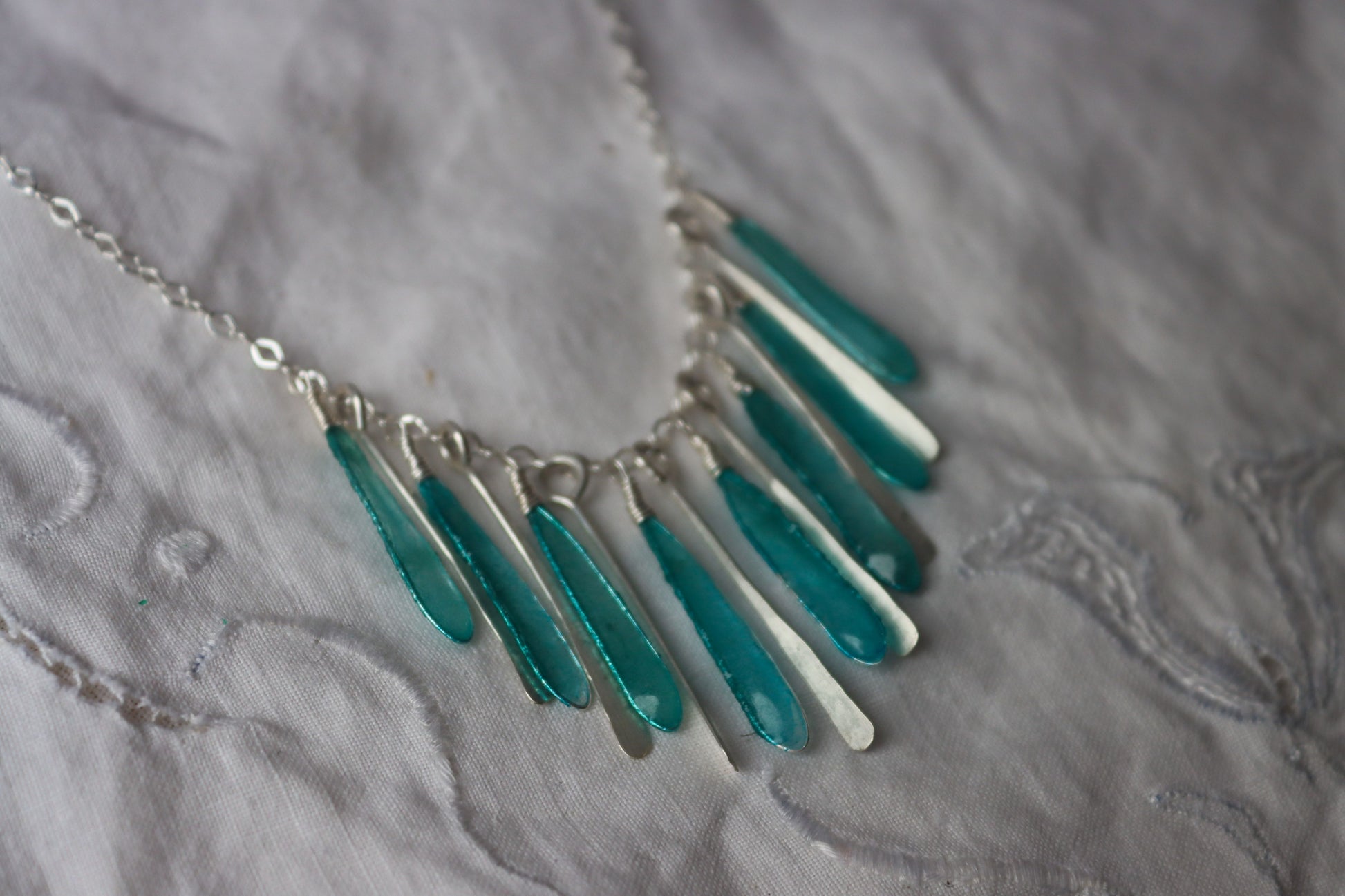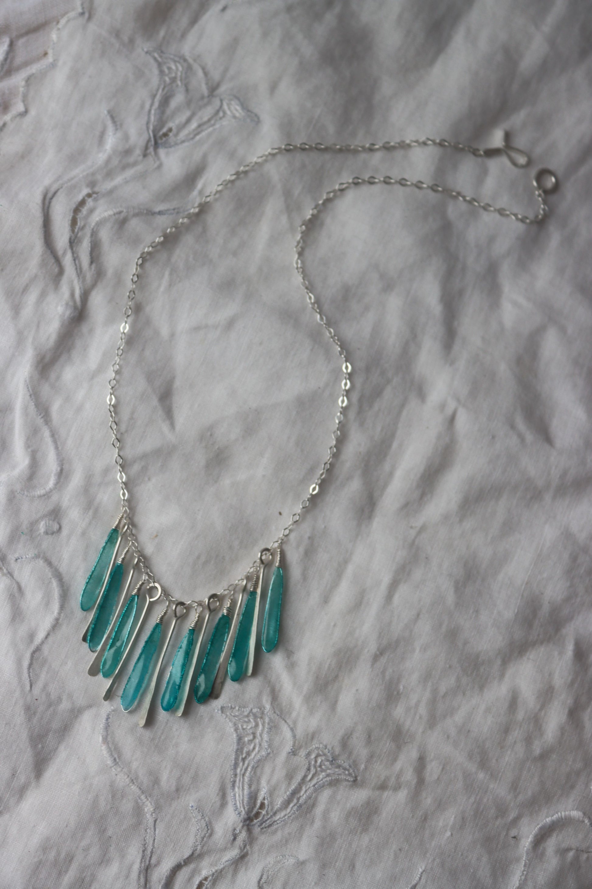 Light-as-air drops of sparkling paper and silver, on an 18 inch sterling silver chain with a handmade clasp.